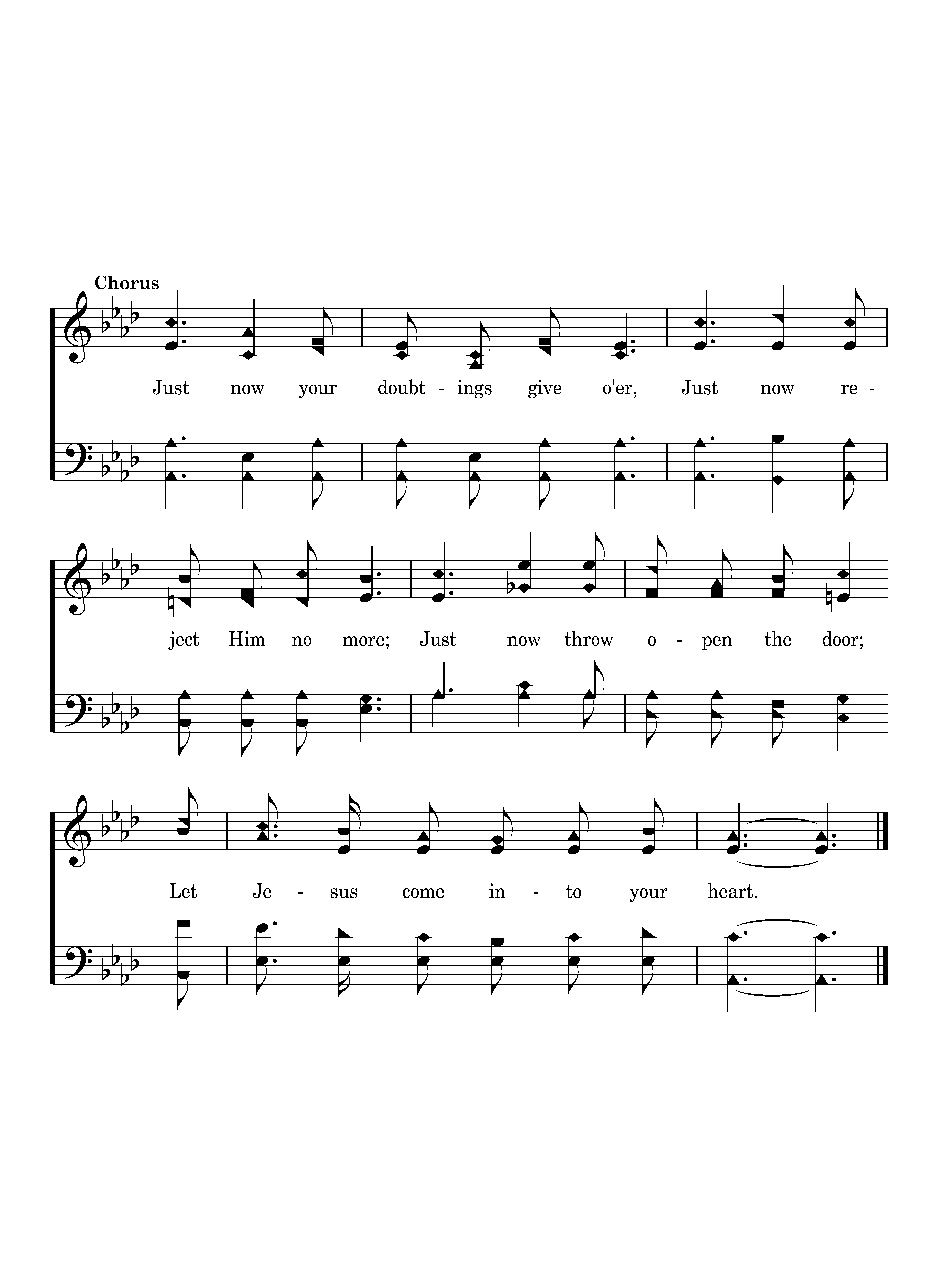 Just now your doubtings give o'er, Just now reject Him no more; Just now throw open the door; Let Jesus come into your heart.