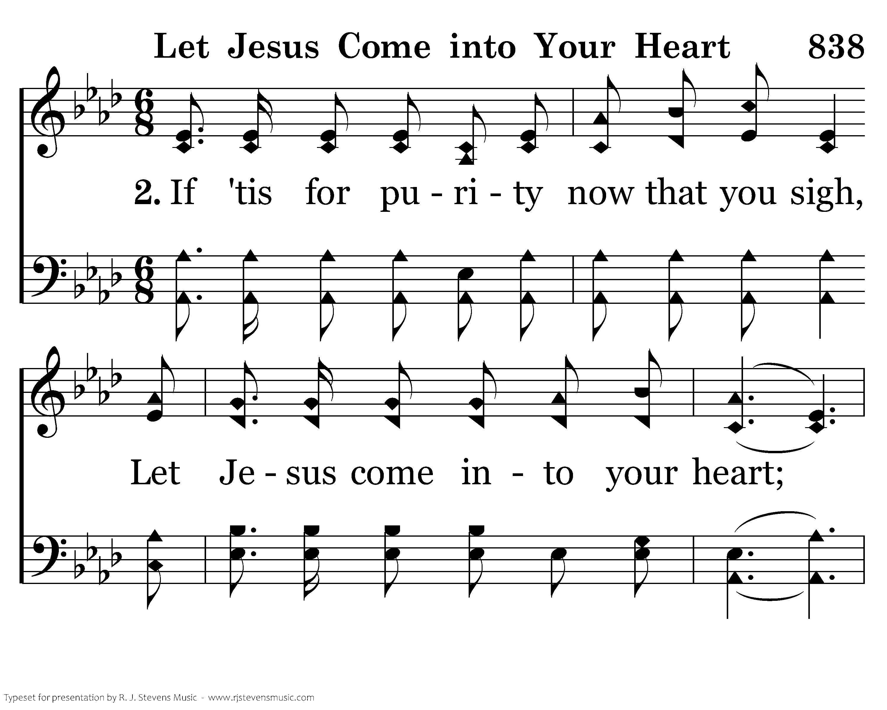 If 'tis for purity now that you sigh, Let Jesus come into your heart; Fountains for cleansing are flowing nearby, Let Jesus come into your heart.