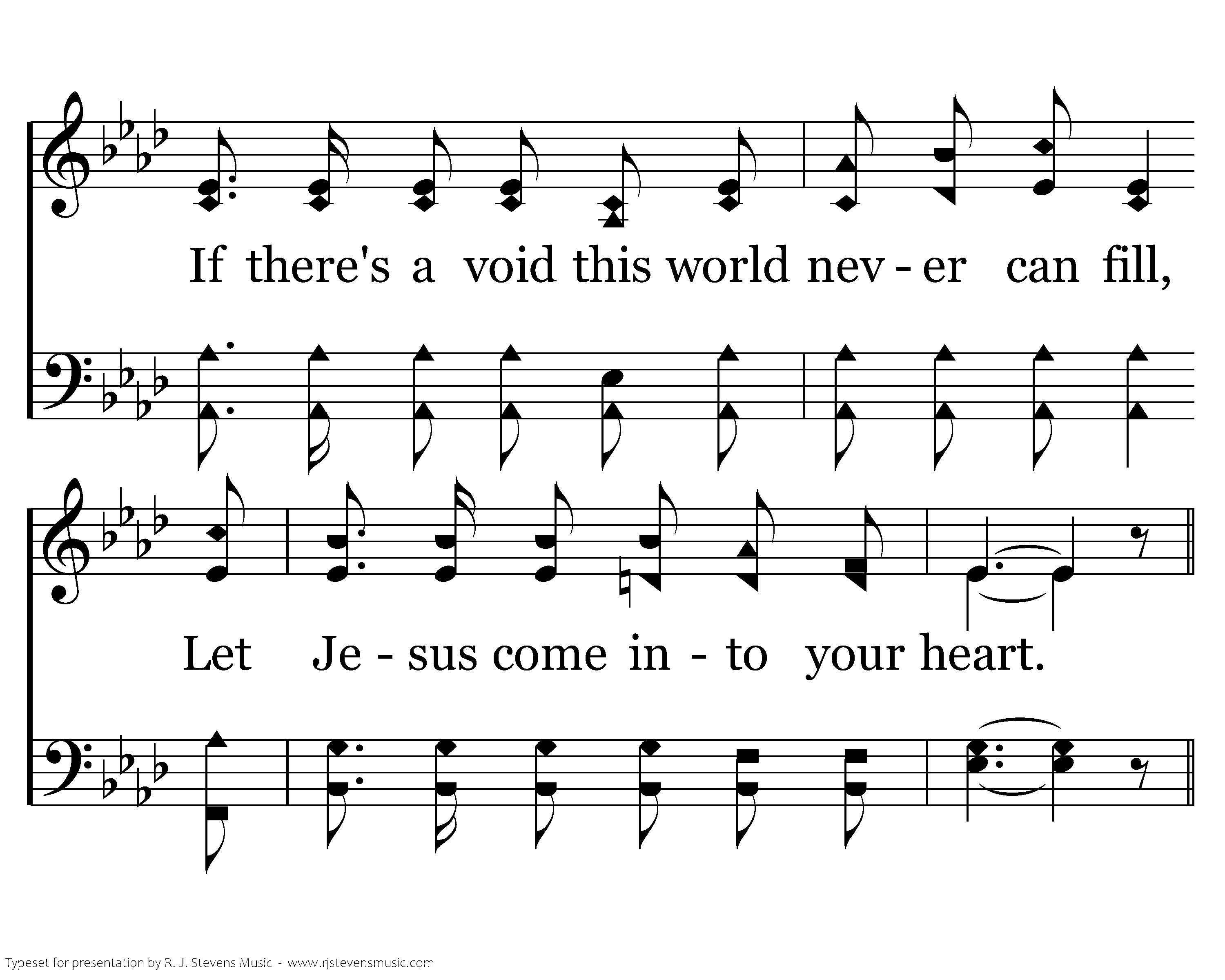 If there's a tempest your voice cannot still, Let Jesus come into your heart; If there's a void this world never can fill, Let Jesus come into your heart.