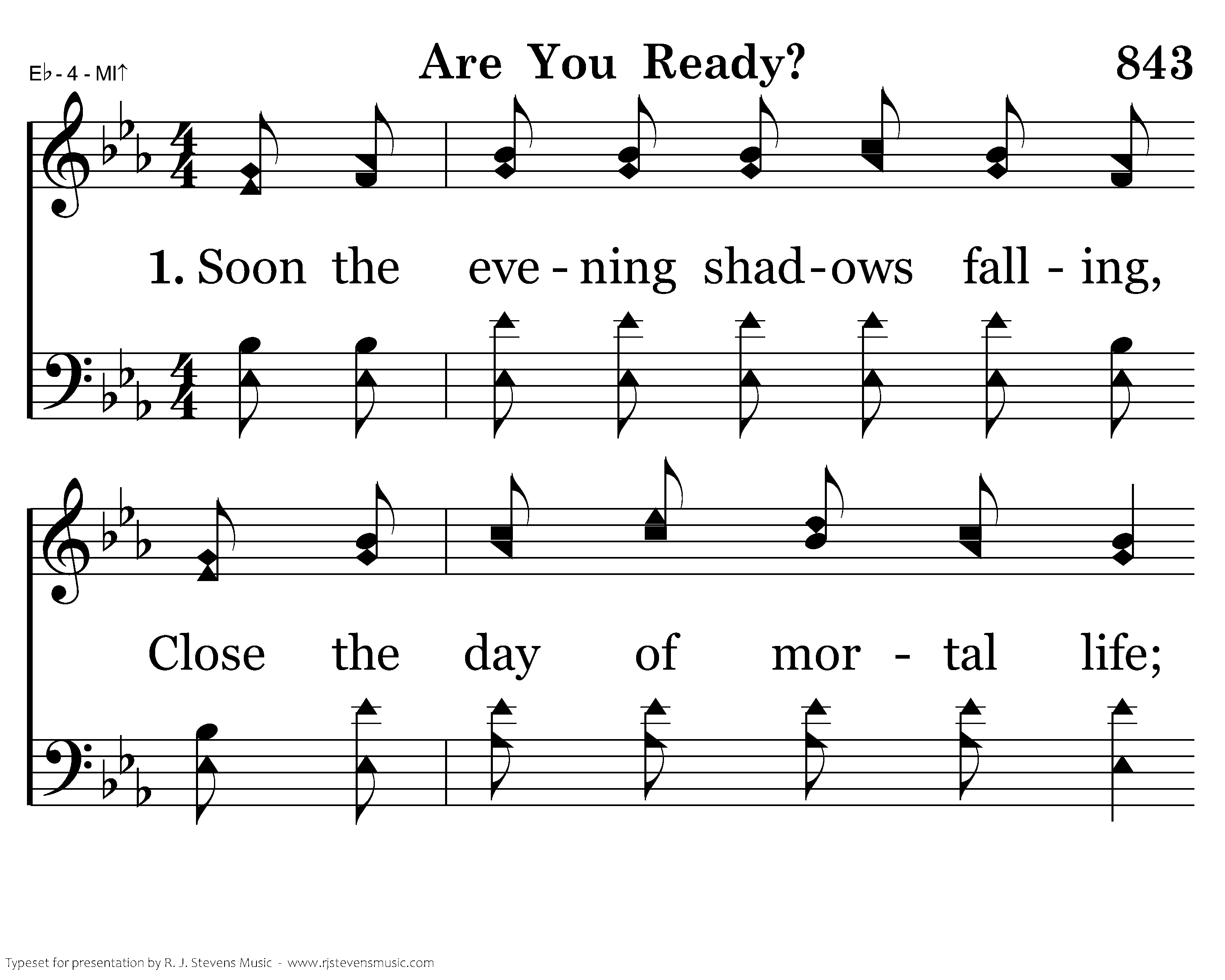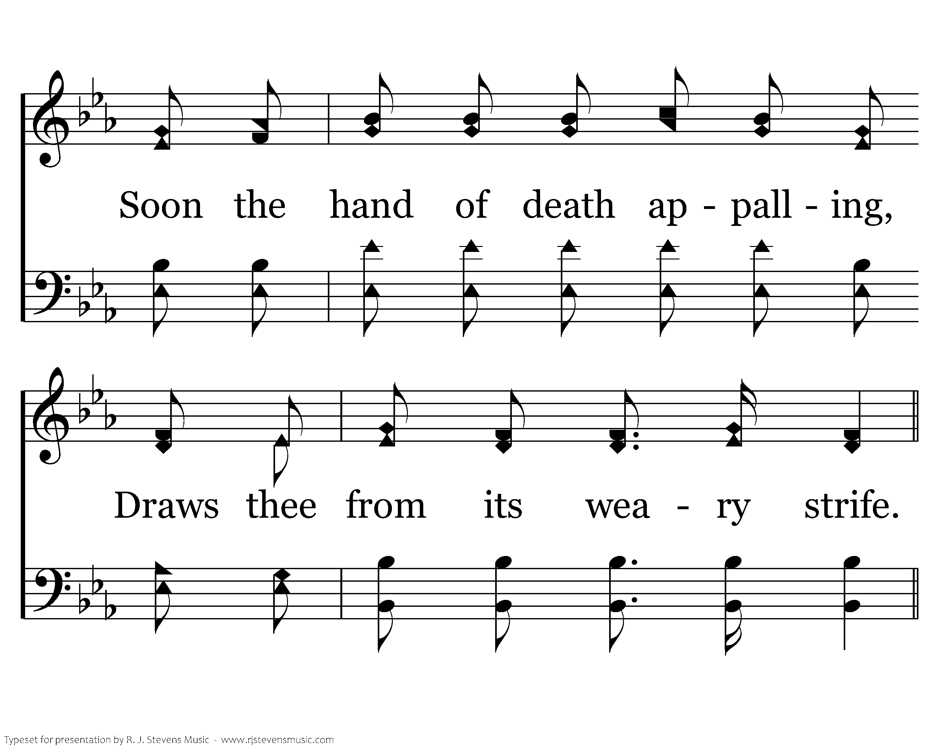 Soon the evening shadows falling, Close the day of mortal life; Soon the hand of death appalling, Draws thee from its weary strife.