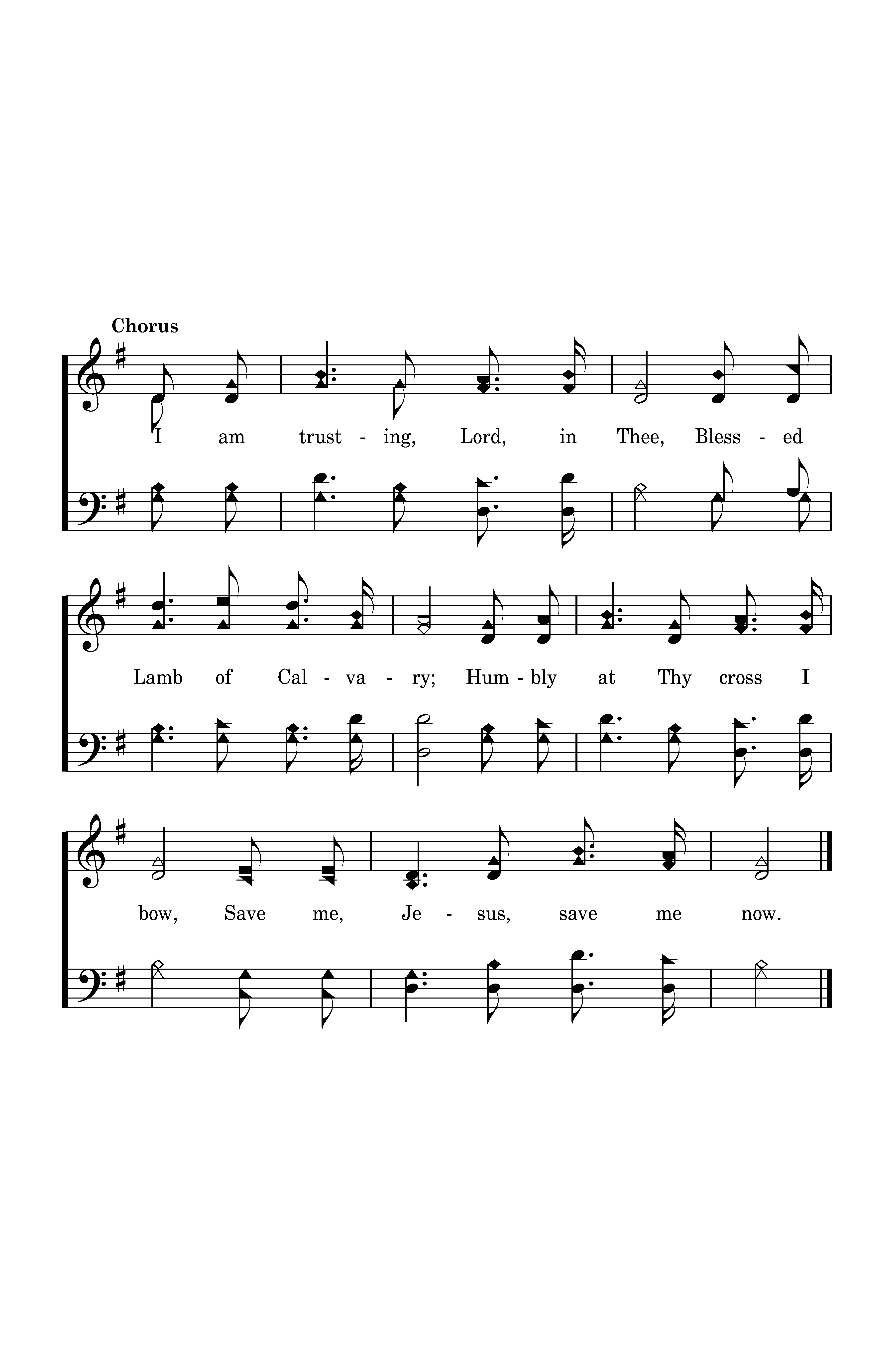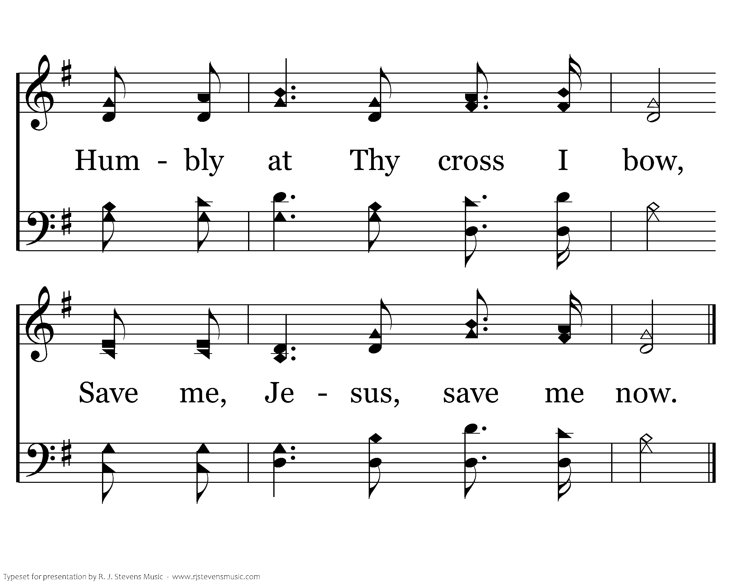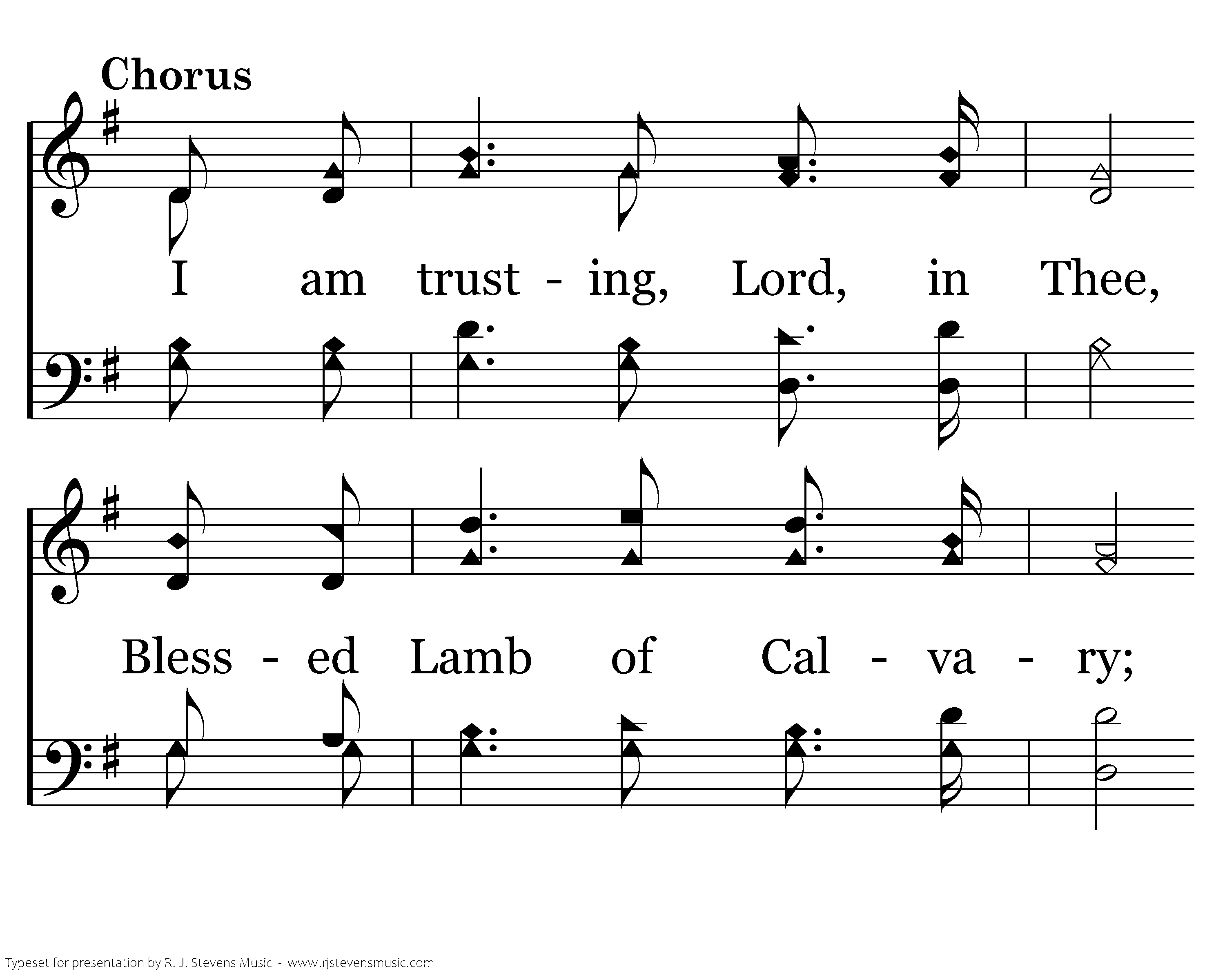I am trusting, Lord, in Thee, Blessed Lamb of Calvary; Humbly at Thy cross I bow, Save me, Jesus, save me now.
