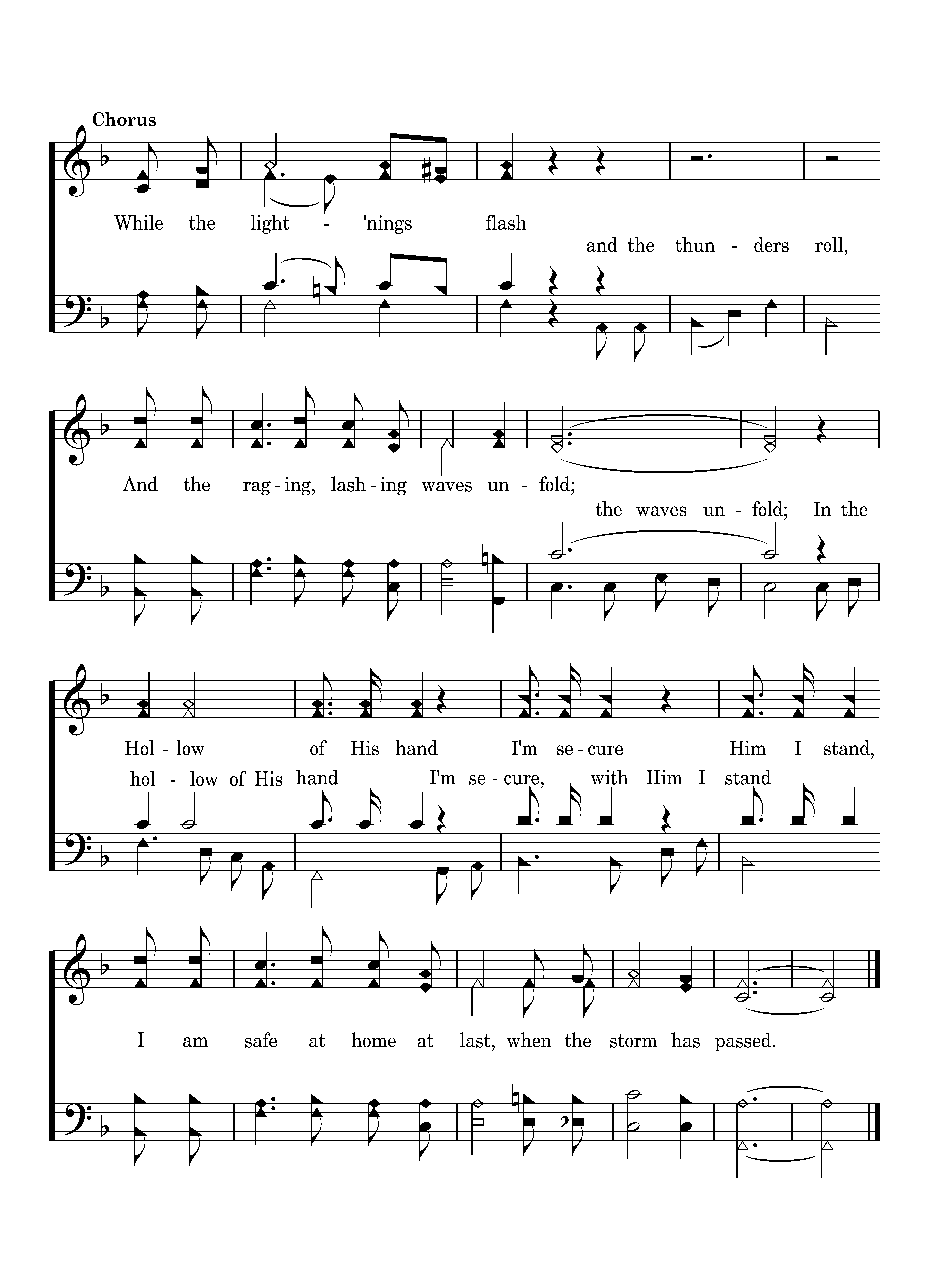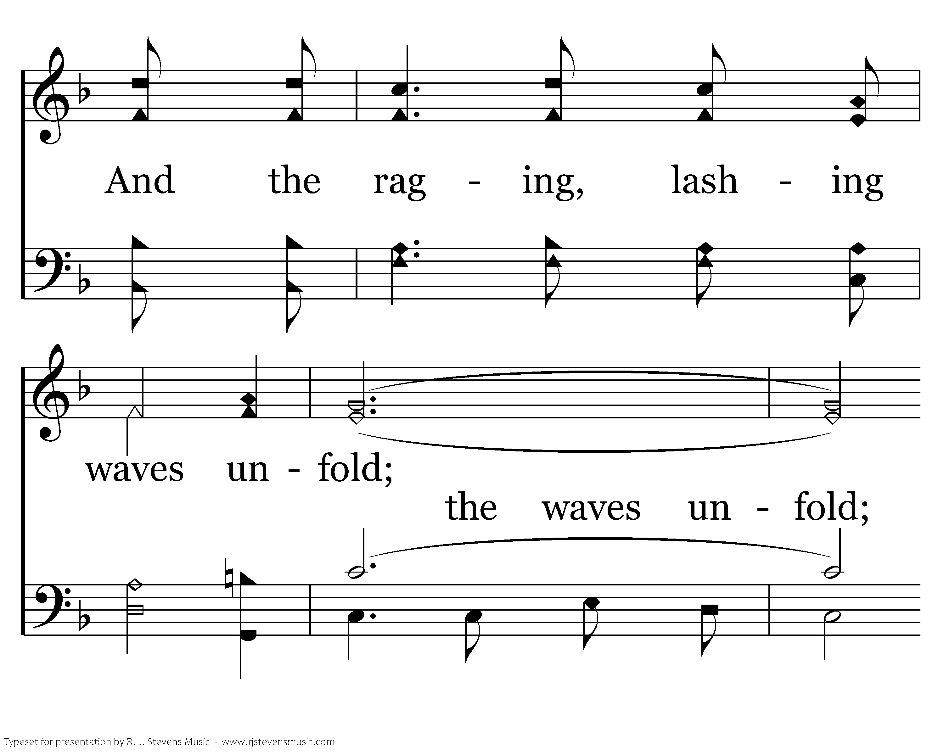 While the light'nings flash And the raging, lashing waves unfold; Hollow of His hand I'm secure Him I stand, I am safe at home at last, when the storm has passed. and the thunders roll, the waves unfold; In the hollow of His hand I'm secure, with Him I stand