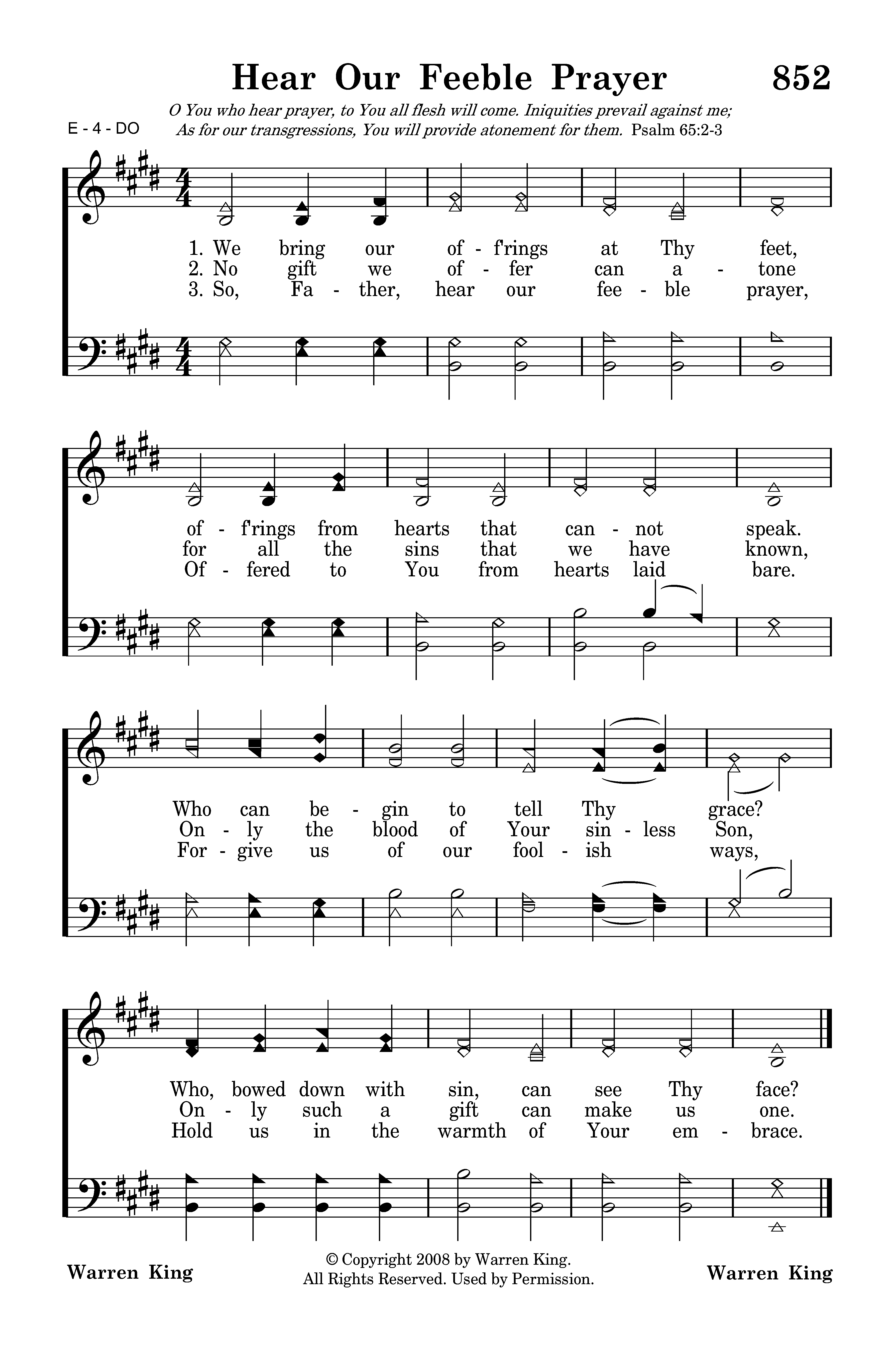 We bring our off'rings at Thy feet, off'rings from hearts that cannot speak. Who can begin to tell Thy grace? Who, bowed down with sin, can see Thy face?