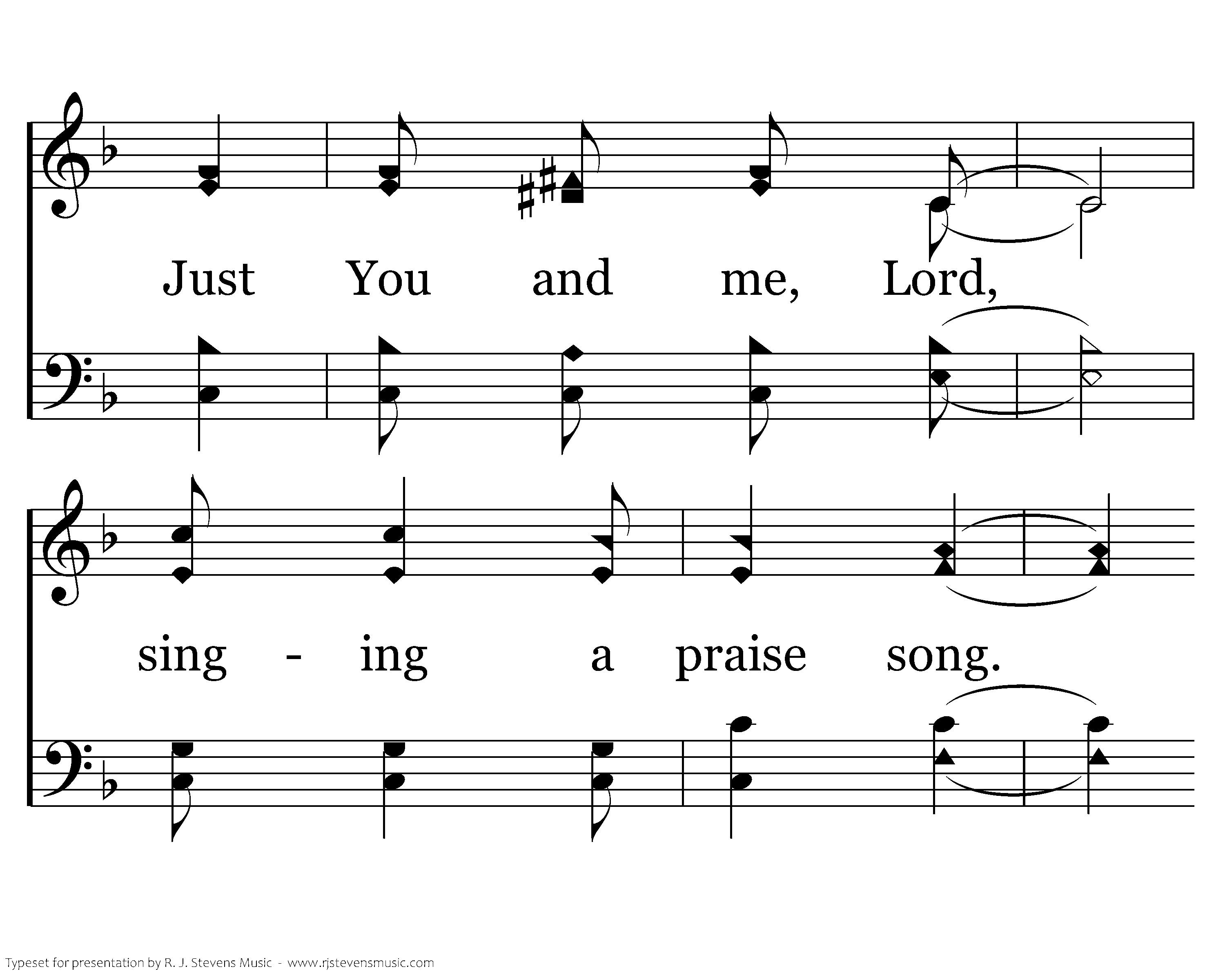 Just You and me, Lord, Going along; Just You and me, Lord, singing a praise song. Just You and me, Lord, As You lead the way. If it's You and me, Lord, It will be a fine day.