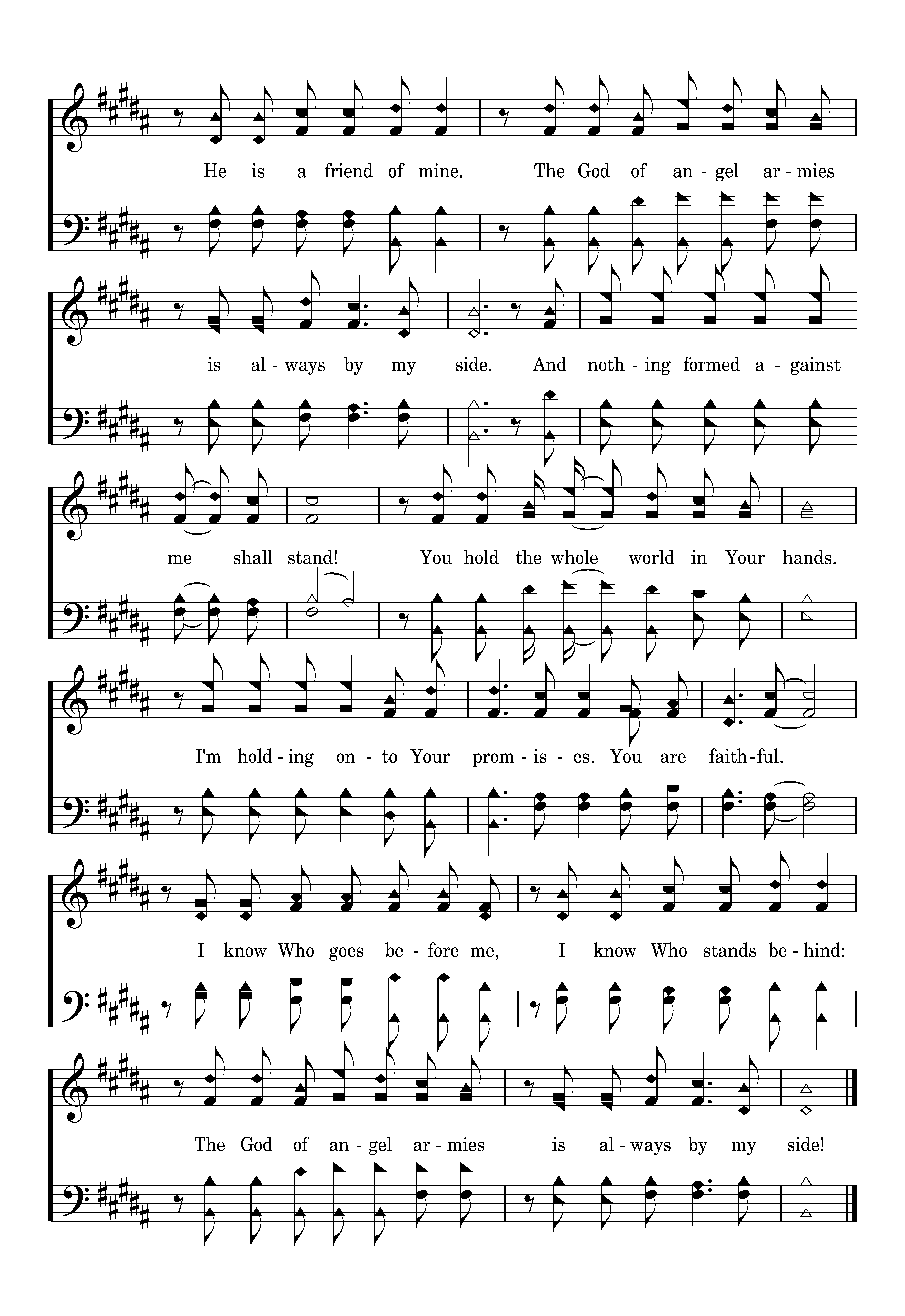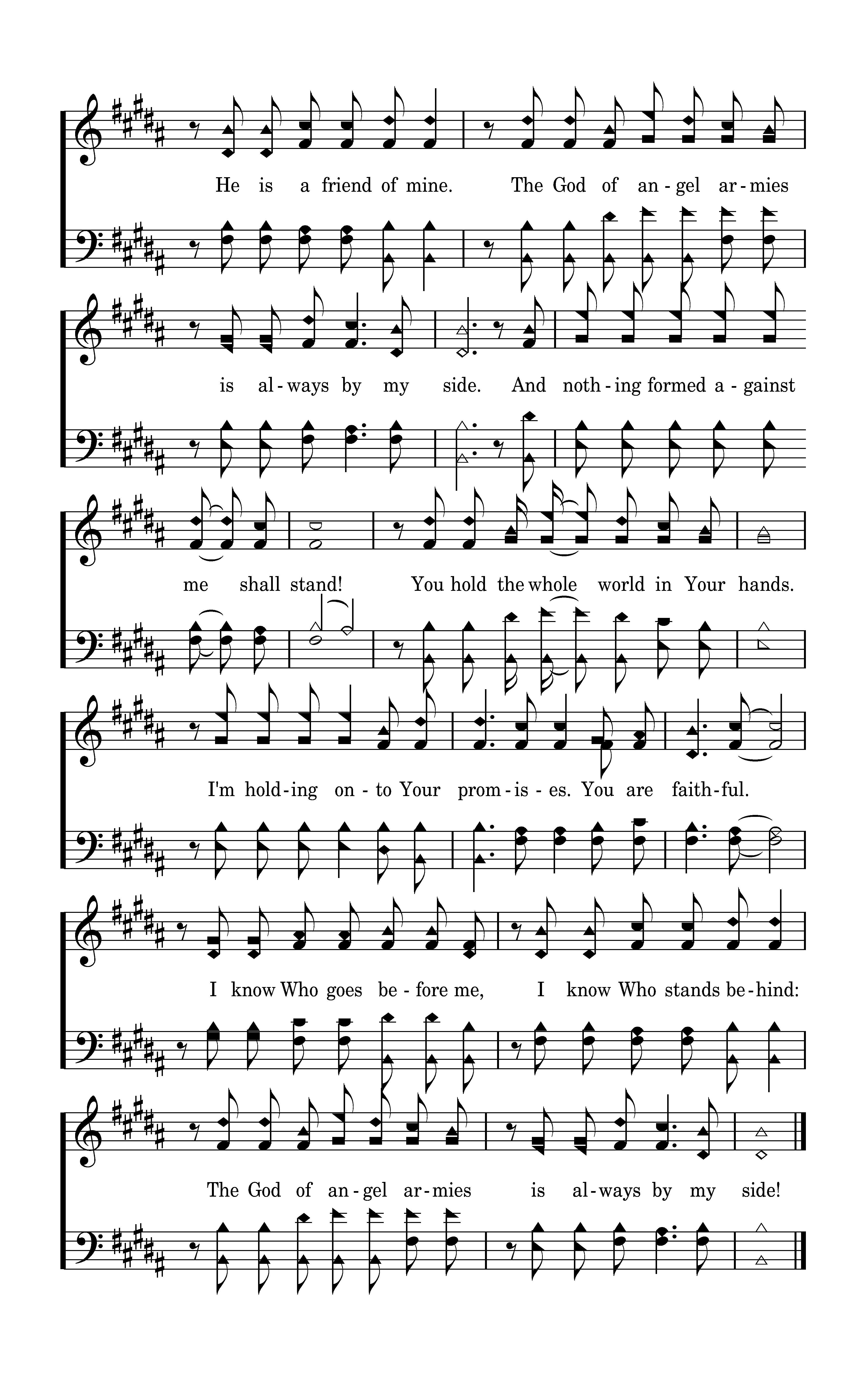 You hear me when I call. You are my morning song. Tho' darkness fills the night, it can not hide the light. Whom shall I fear? You crush the enemy underneath my feet. You are my sword and shield, tho' troubles linger still. Whom shall I fear? I know Who goes before me. I know Who stands behind: The God of angel armies is always by my side. The One Who reigns forever, He is a friend of mine. The God of angel armies is always by my side. And nothing formed against me shall stand! You hold the whole world in Your hands. I'm holding onto Your promises. You are faithful. I know Who goes before me, I know Who stands behind: The God of angel armies is always by my side!