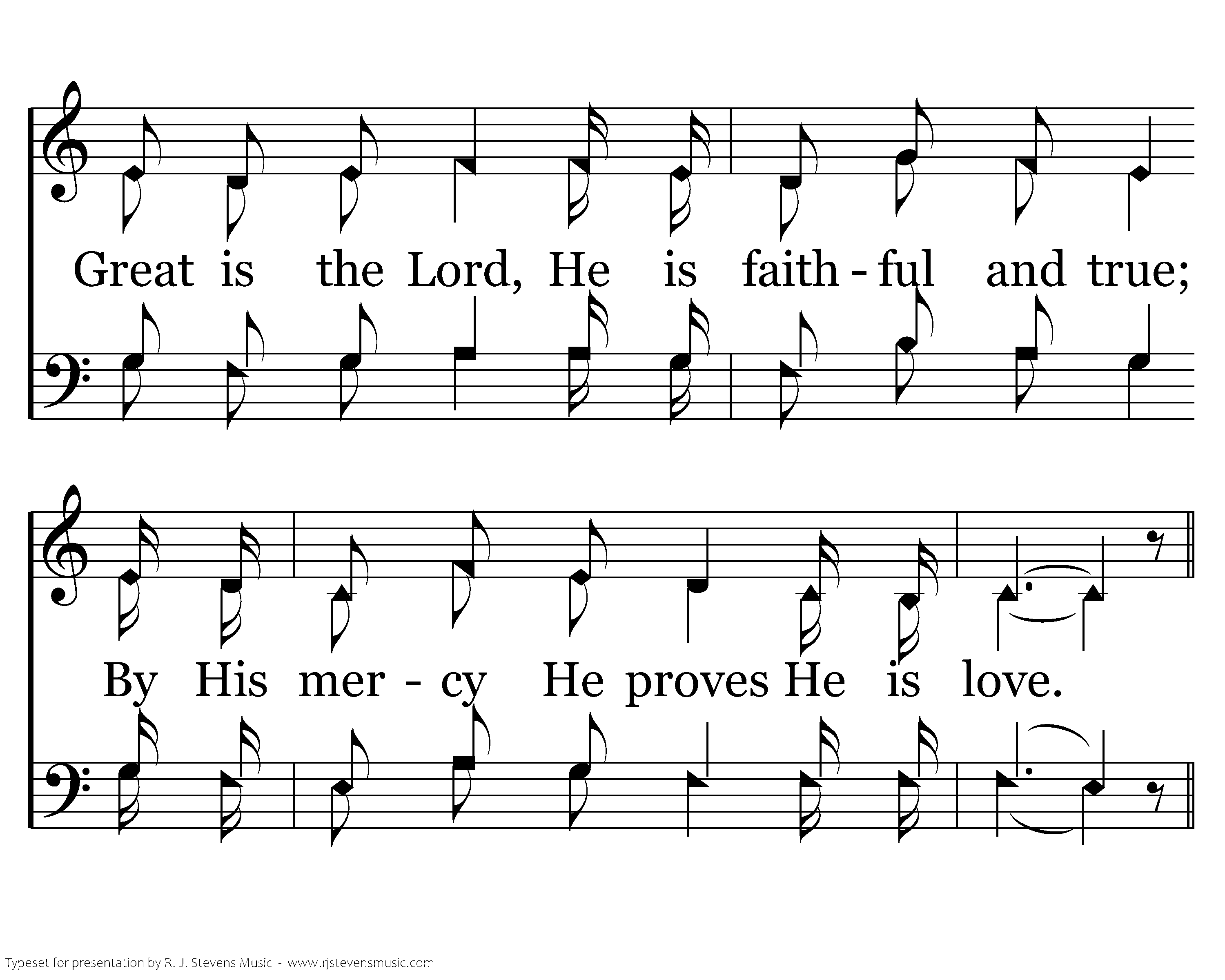 Great is the Lord, He is holy and just; By His power we trust in His love. Great is the Lord, He is faithful and true; By His mercy He proves He is love. Great is the Lord, and worthy of glory! Great is the Lord, and worthy of praise. Great is the Lord; Now lift up your voice, Now lift up your voice: Great is the Lord! Great is the Lord!