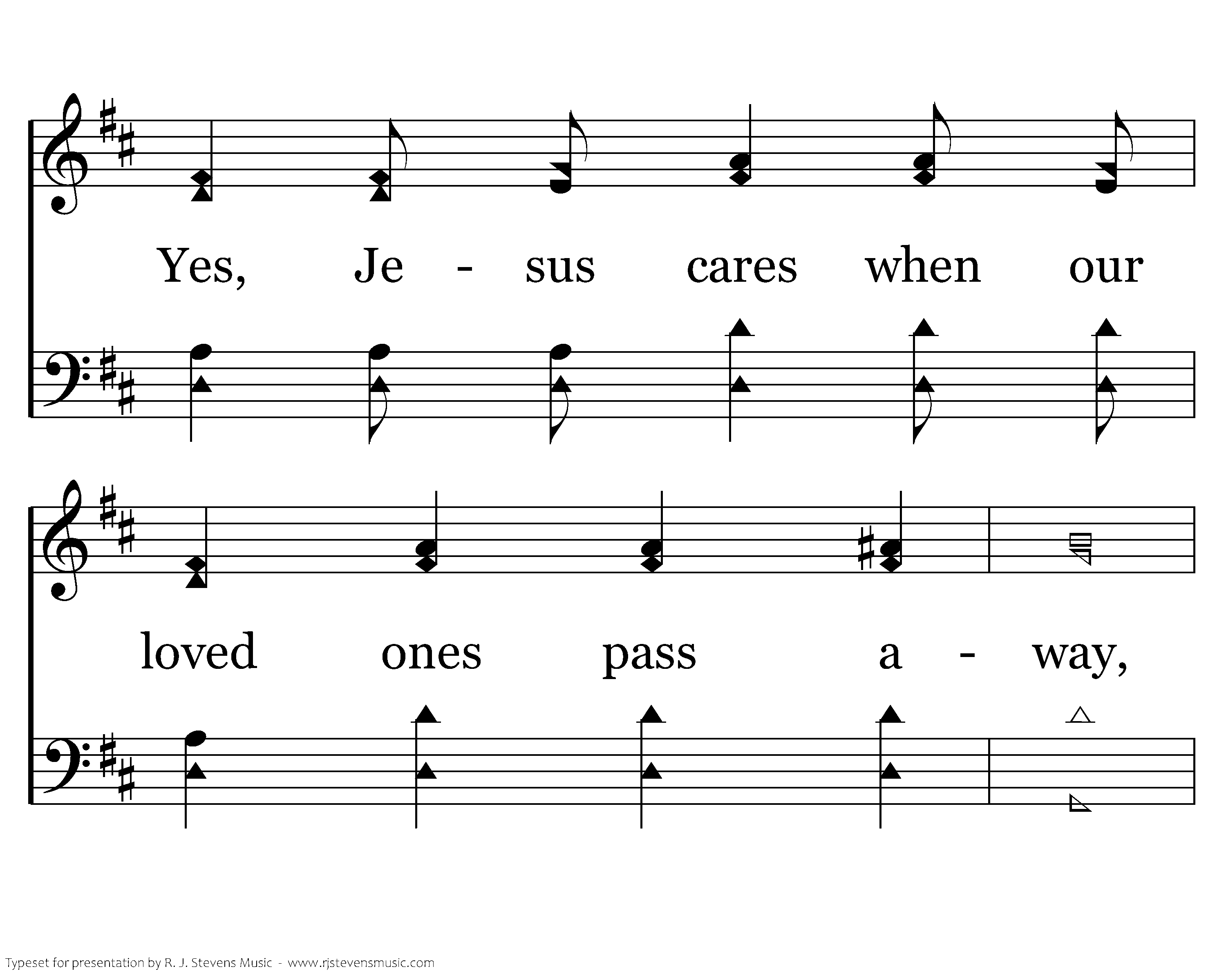 Tears so gentle at the grave of Lazarus, To help sad friends their broken hearts to mend. Yes, Jesus cares when our loved ones pass away, And comforts thru His word each lonely day.
