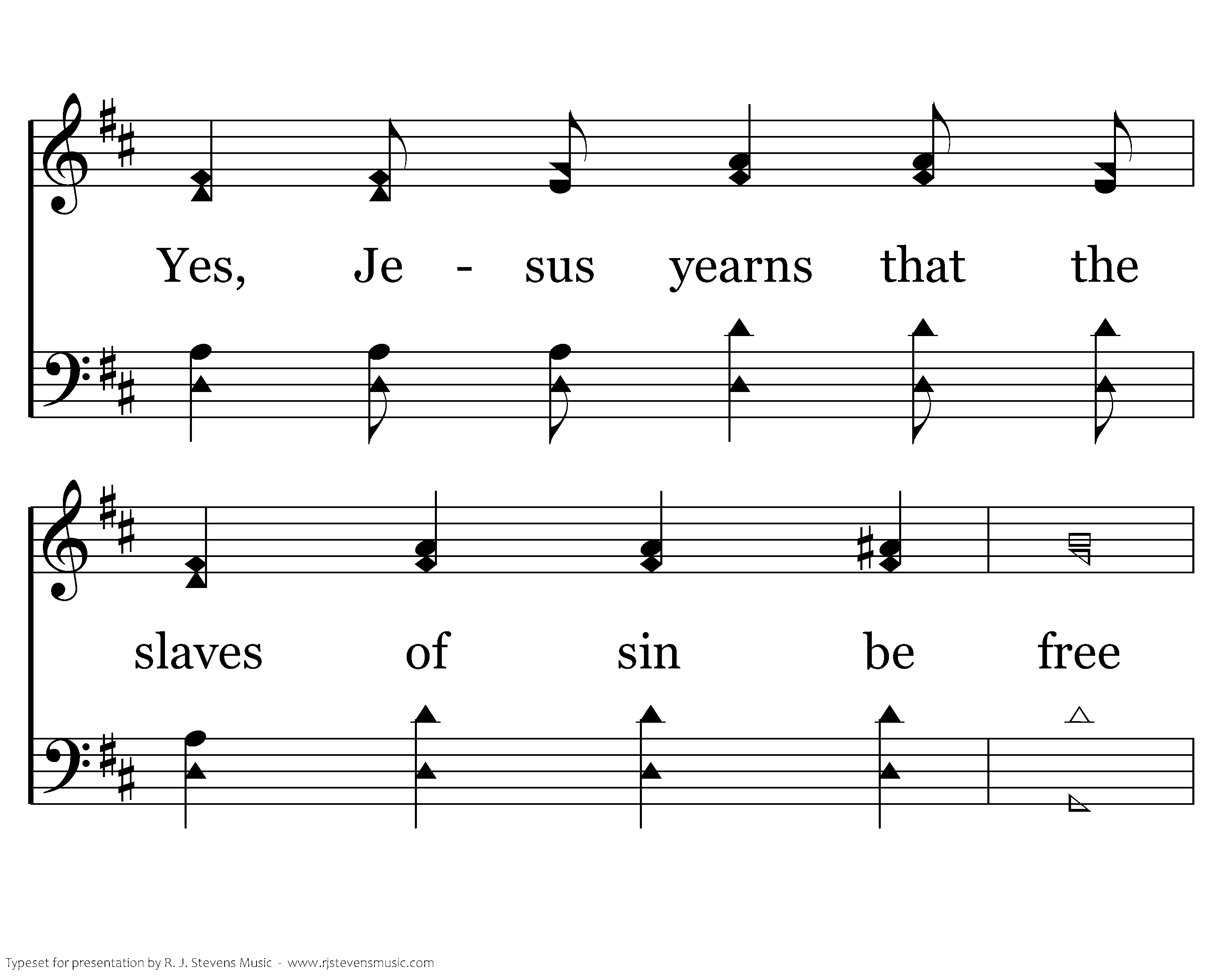 Tears of anguish poured out in Gethsemane; He drank the cup, the suff'ring cup for all. Yes, Jesus yearns that the slaves of sin be free By precious blood He shed on Calvary.