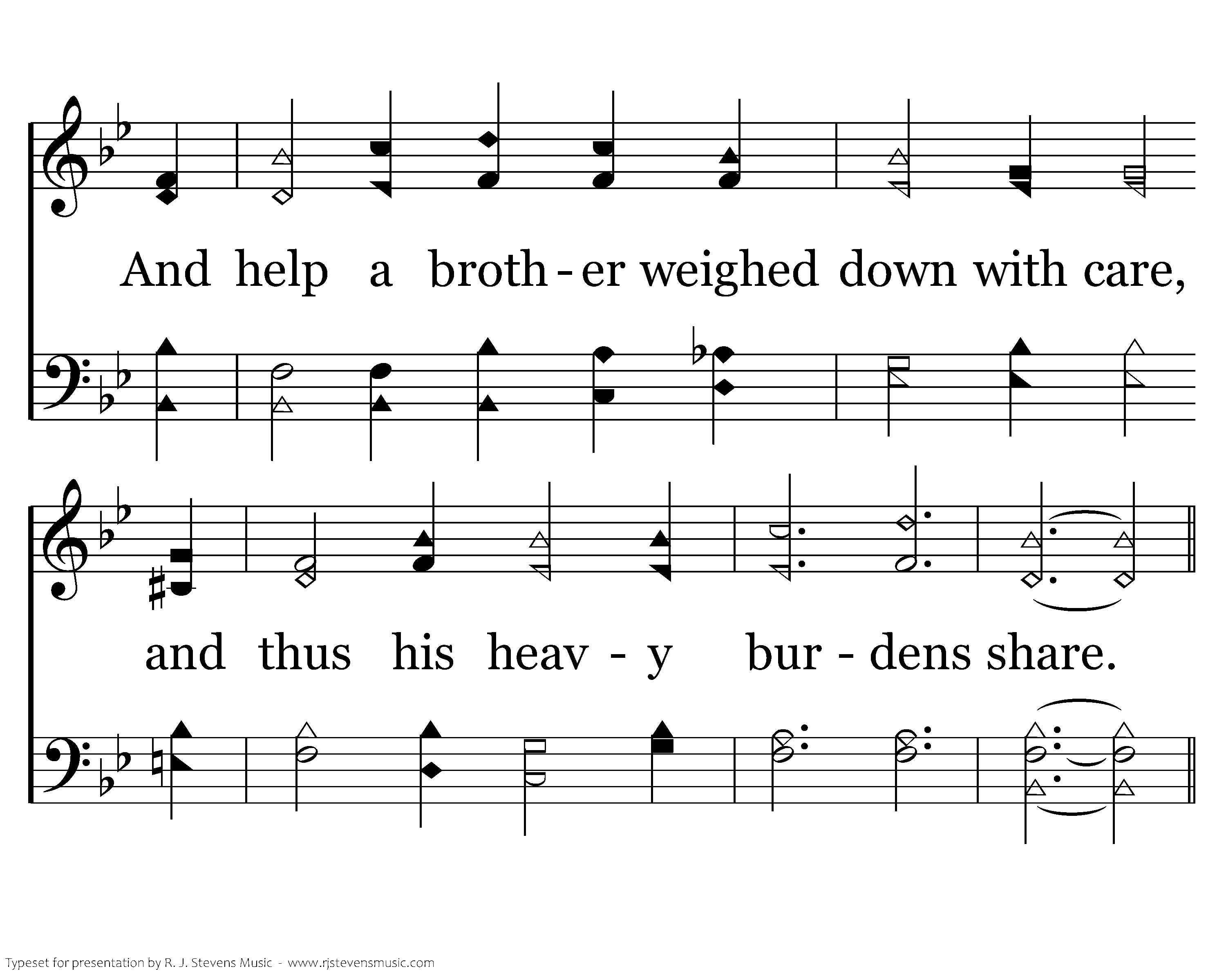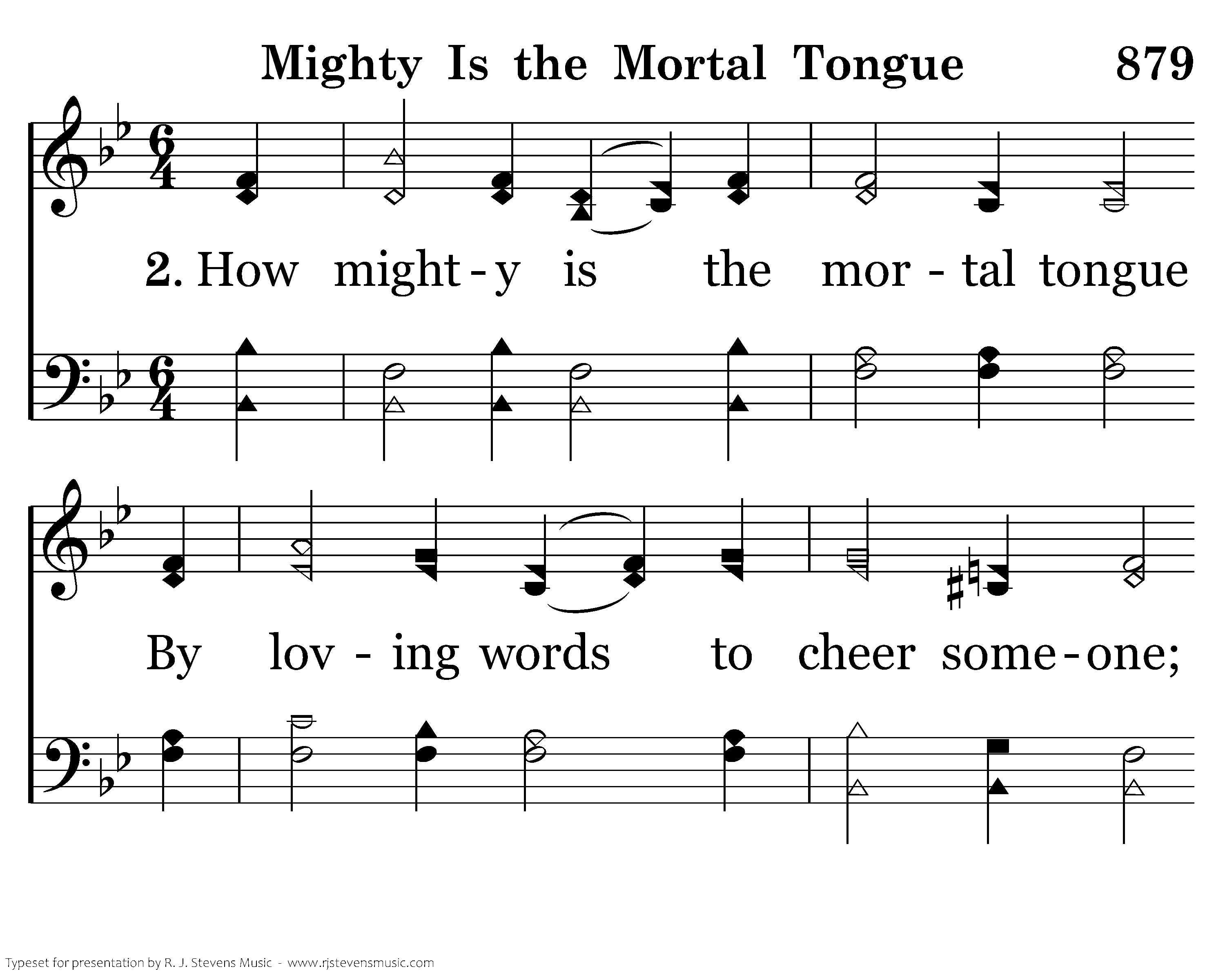 How mighty is the mortal tongue By loving words to cheer someone; And help a brother weighed down with care, And thus his heavy burdens share.