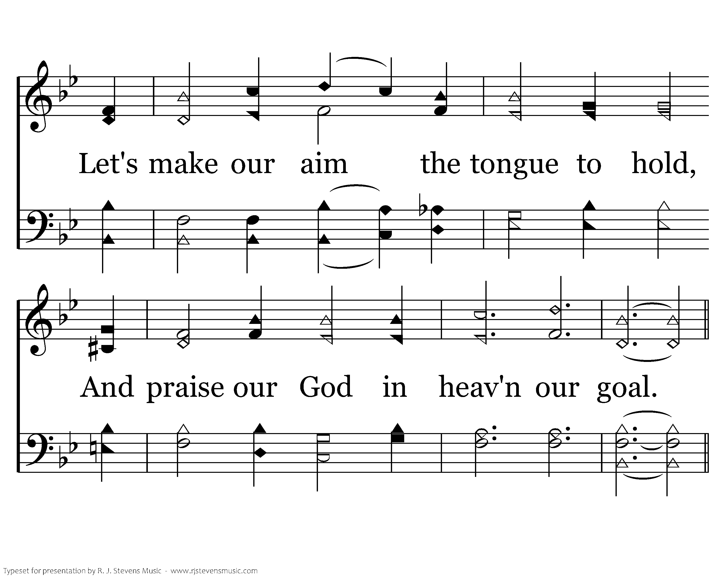 How mighty is the mortal tongue, Great good or ill by it is done. Let's make our aim the tongue to hold, And praising God in heav'n our goal.