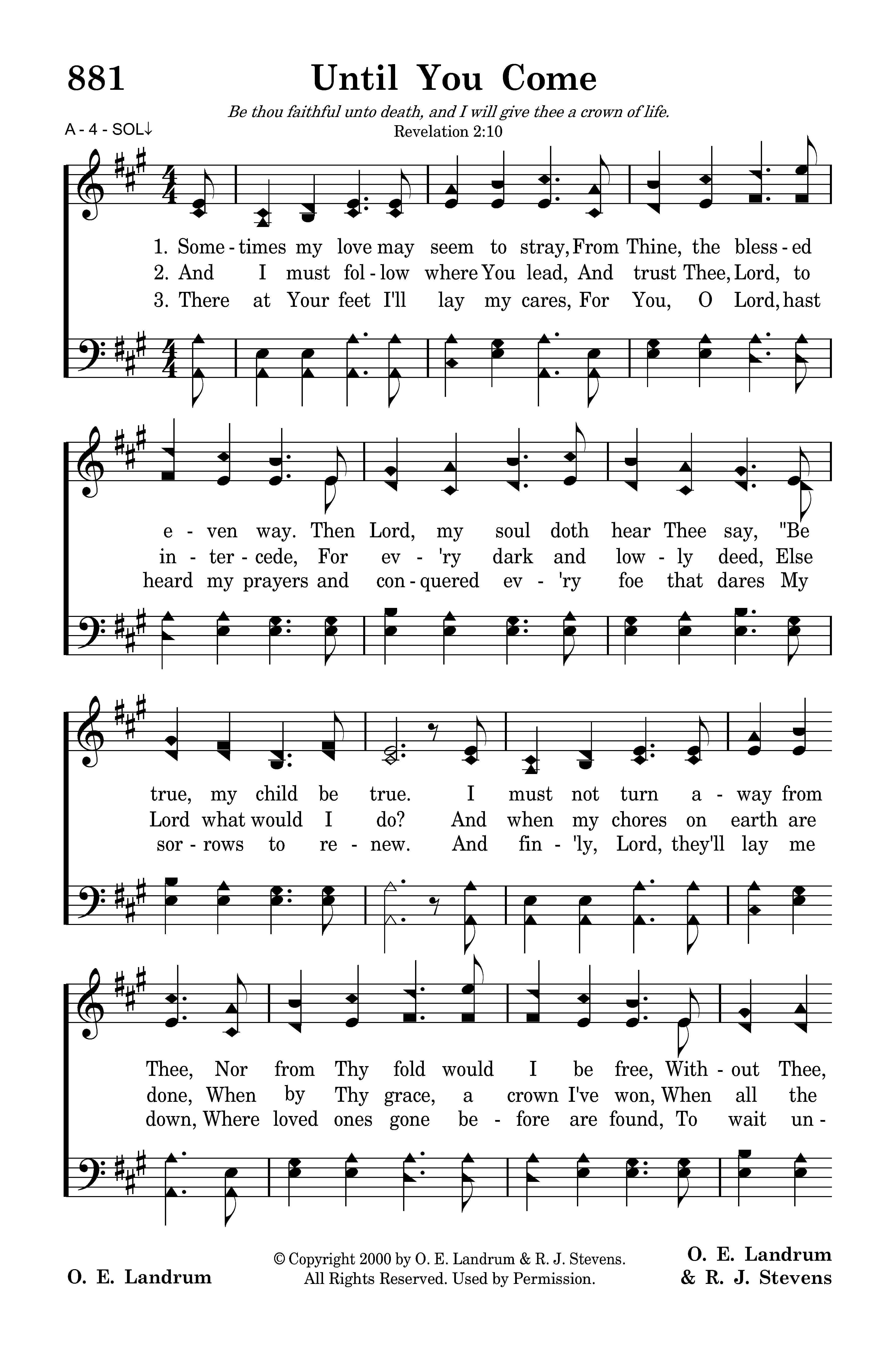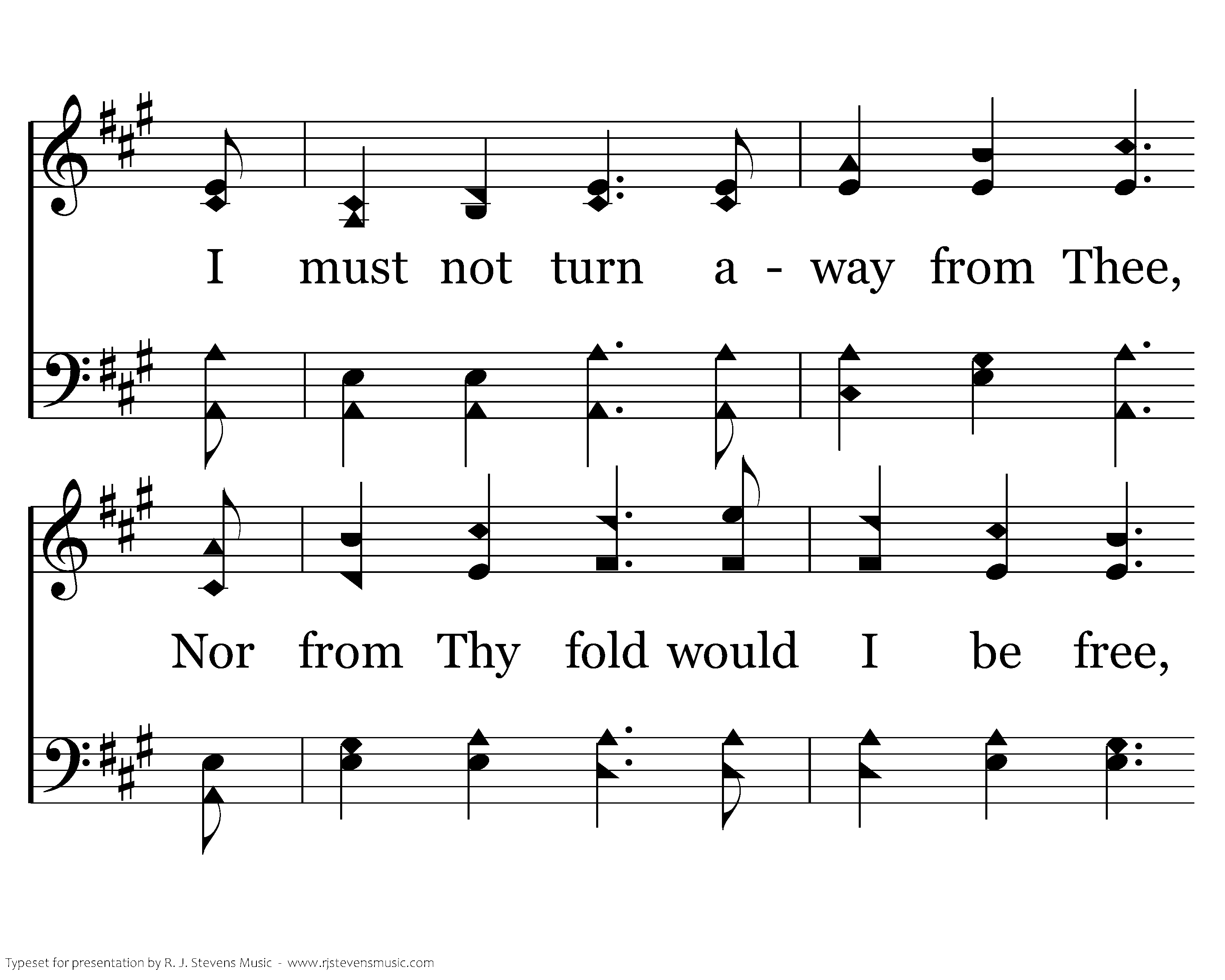 Sometimes my love may seem to stray, From Thine, the blessed even way. Then Lord, my soul doth hear Thee say, "Be true, my child be true. I must not turn away from Thee, Nor from Thy fold would I be free, Without Thee, Lord, where would I be? My Lord I'll cling to You.