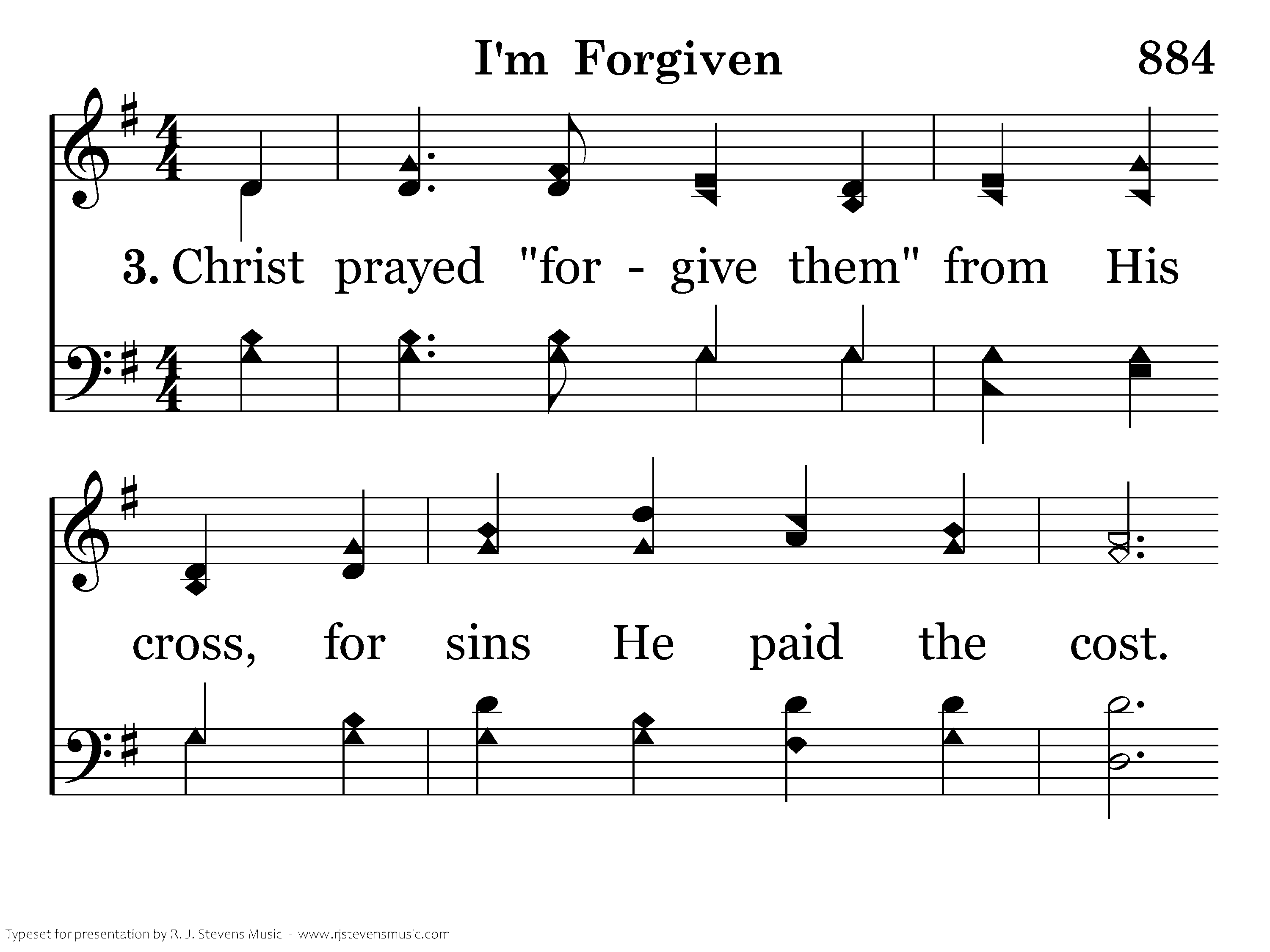 For God's great mercy praise His name! His love I will proclaim. I'll tell lost souls that Jesus gave His life their souls to save. I'm forgiven! His blood cleanses me, blood cleanses me, and if faithful, heav'n I'll see. I'm forgiven! God said before, "I'll remember sin no more."
