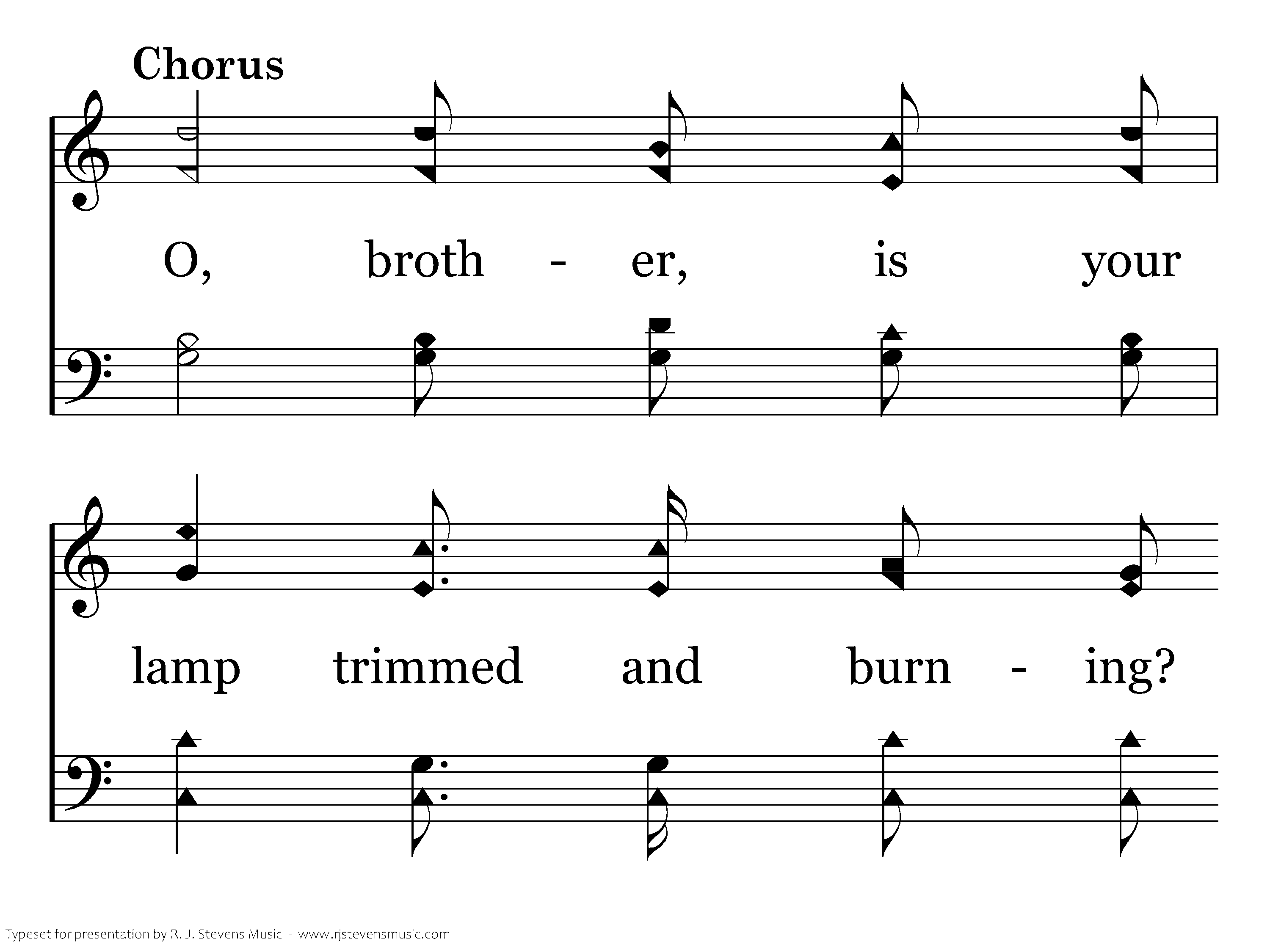 O, brother, is your lamp trimmed and burning? Is the world made brighter by its cheering ray? Are you ever waiting for your Lord's returning? Are you watching day by day?
