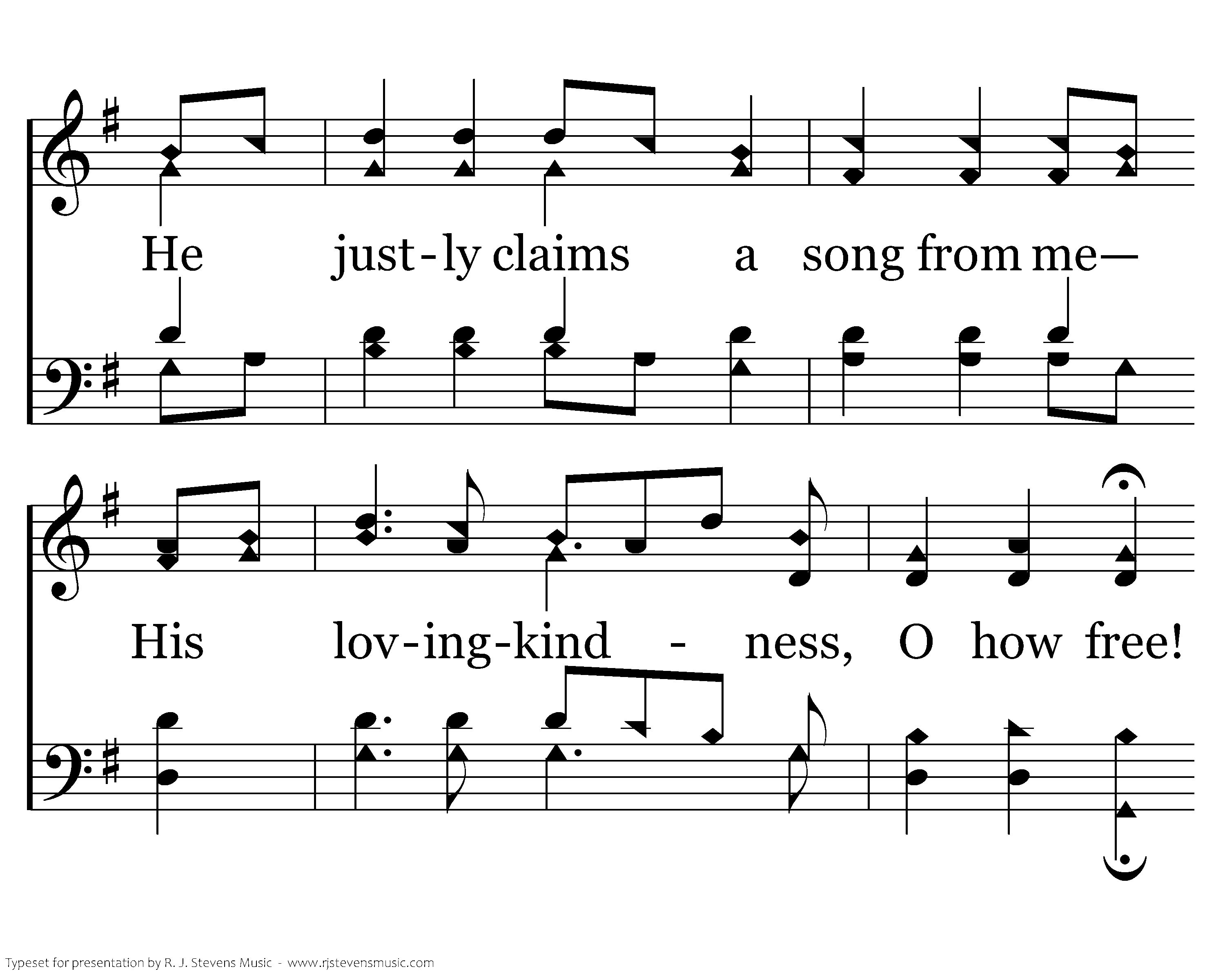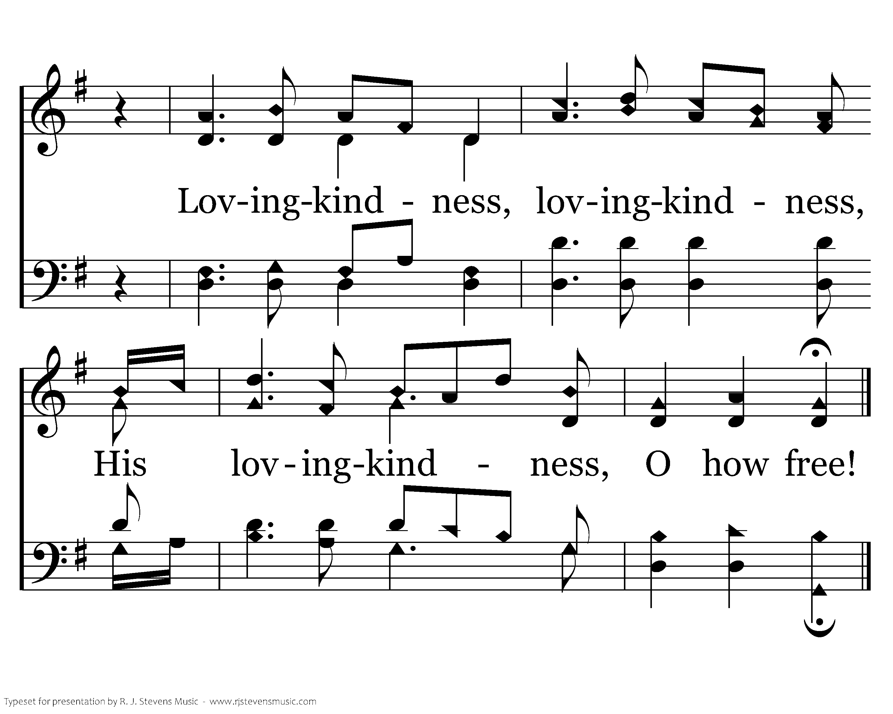 Awake, my soul, in joyful lays, And sing the great Redeemer's praise; He justly claims a song from me His lovingkindness, O how free! Lovingkindness, lovingkindness, His lovingkindness, O how free!
