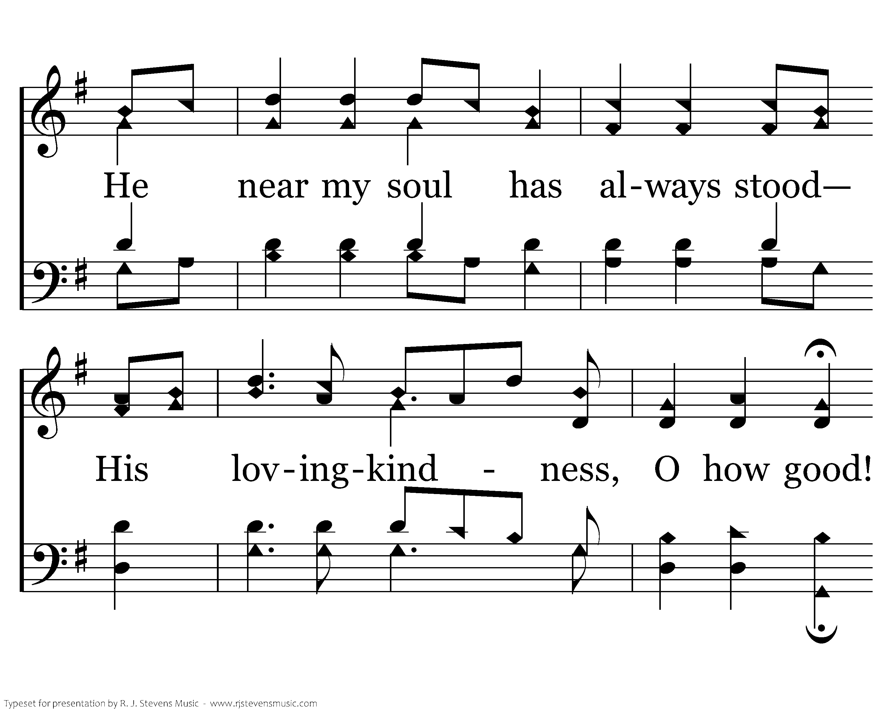 When trouble, like a gloomy cloud, Has gathered thick and thundered loud, He near my soul has always stood His lovingkindness, O how good! Lovingkindness, lovingkindness, His lovingkindness, O how good!