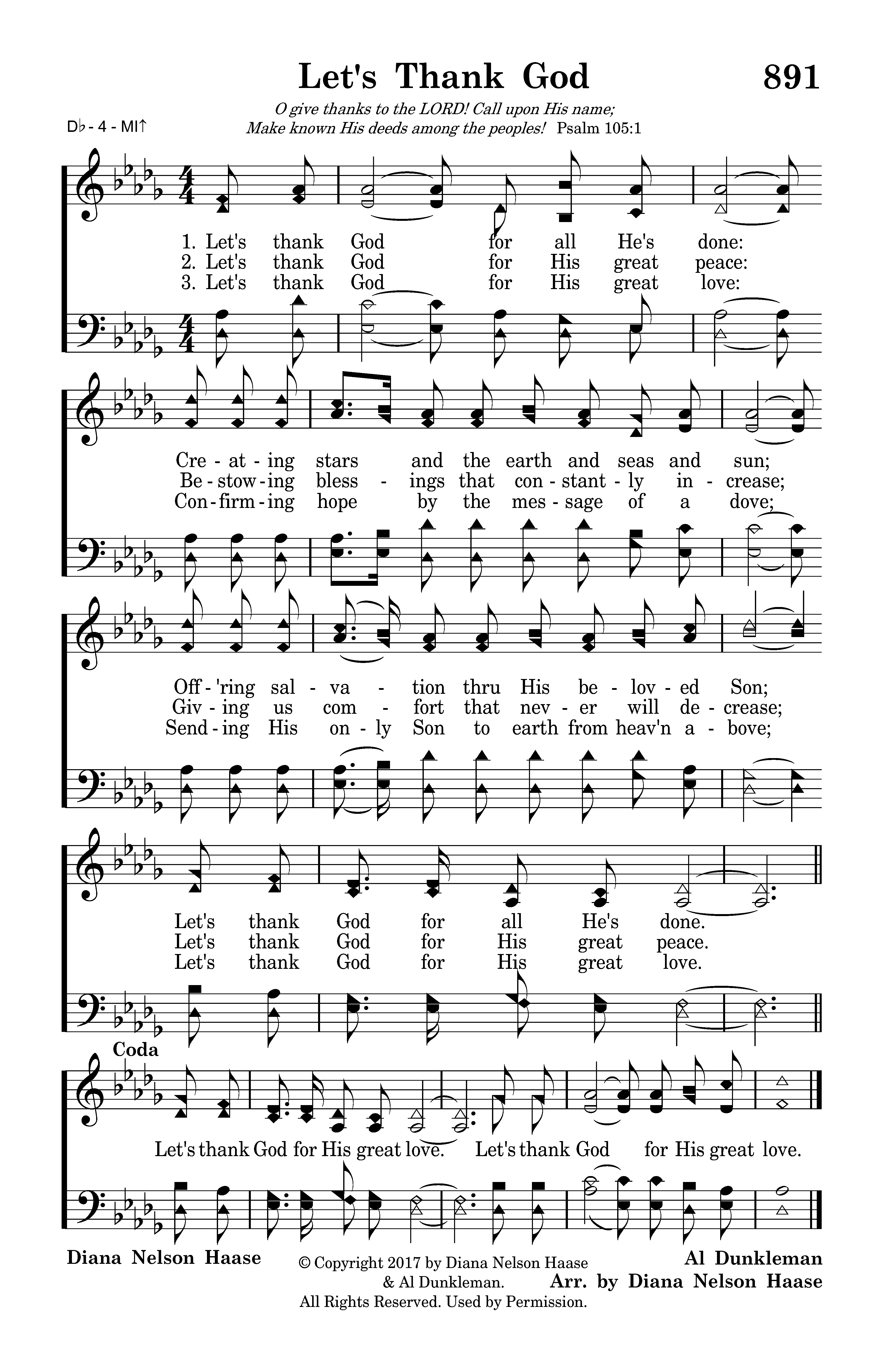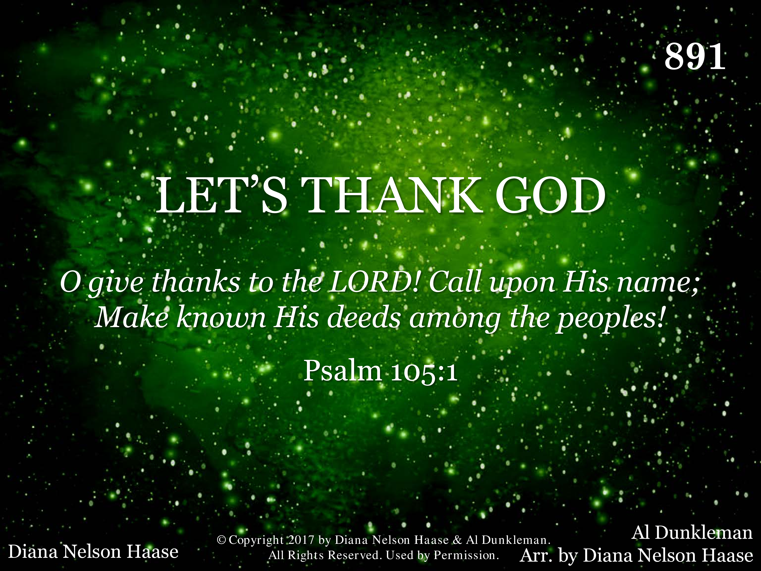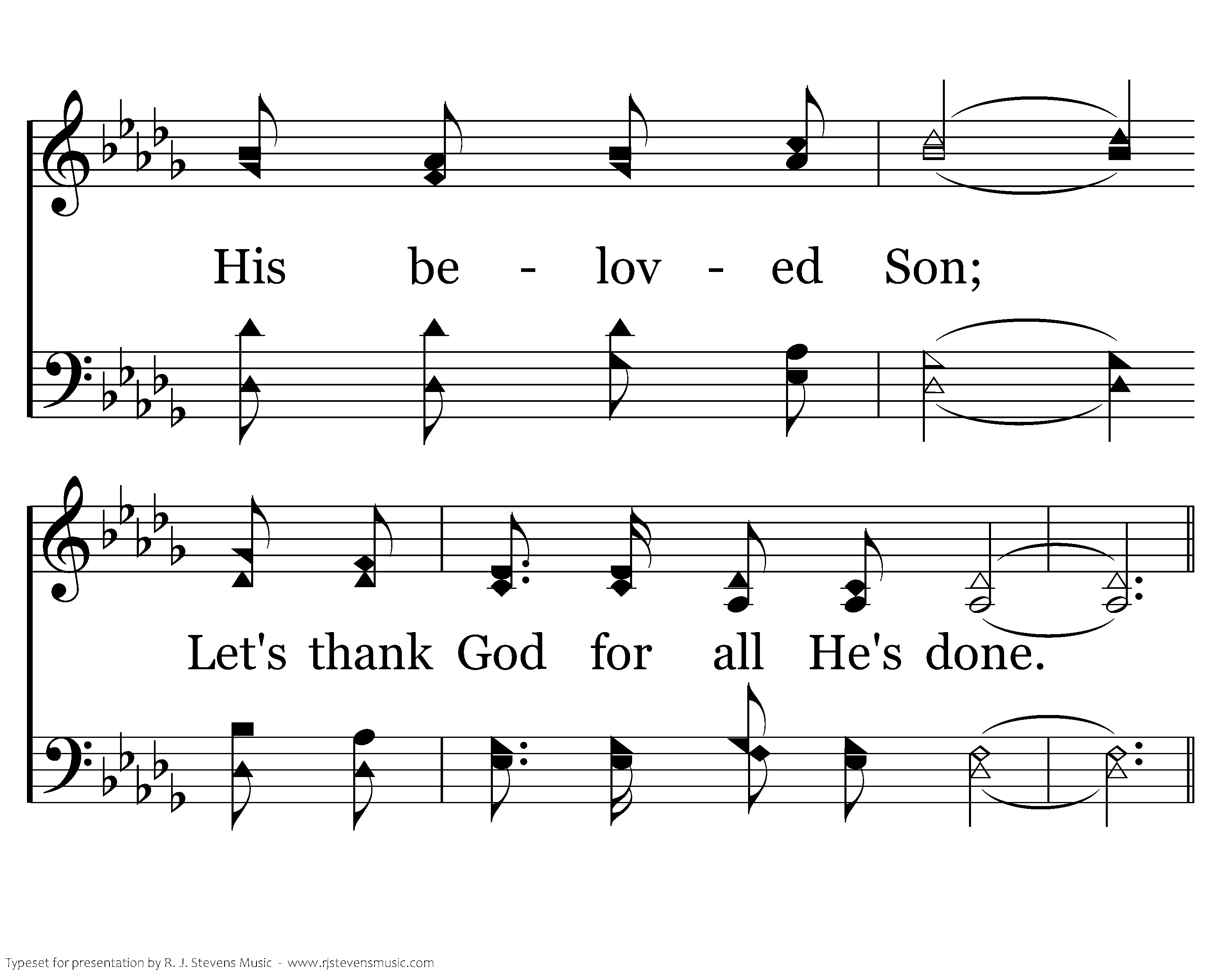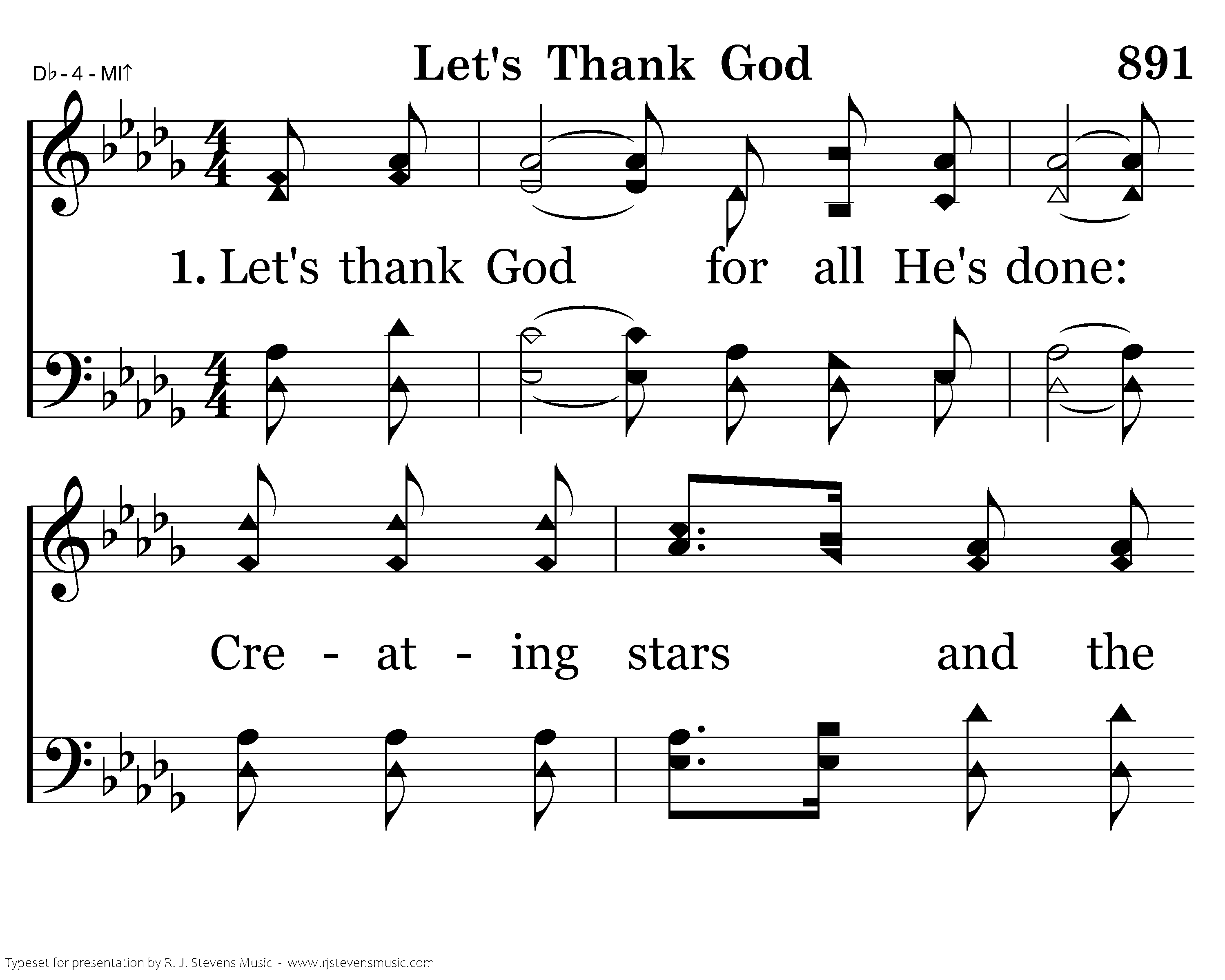 Let's thank God for all He's done: Creating stars and the earth and seas and sun; Off'ring salvation thru His beloved Son; Let's thank God for all He's done.