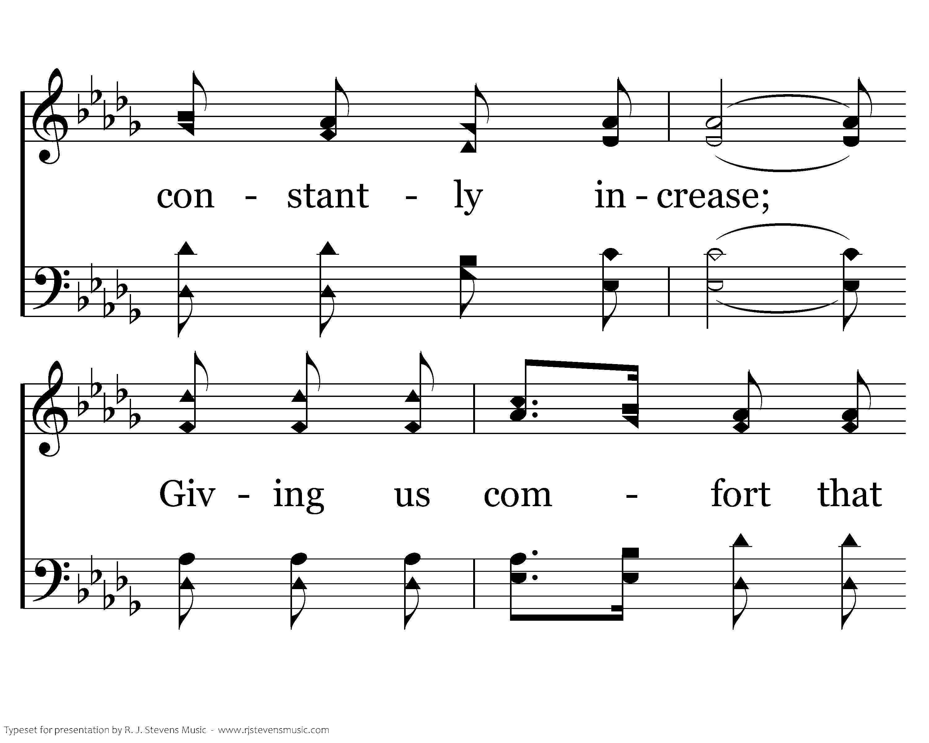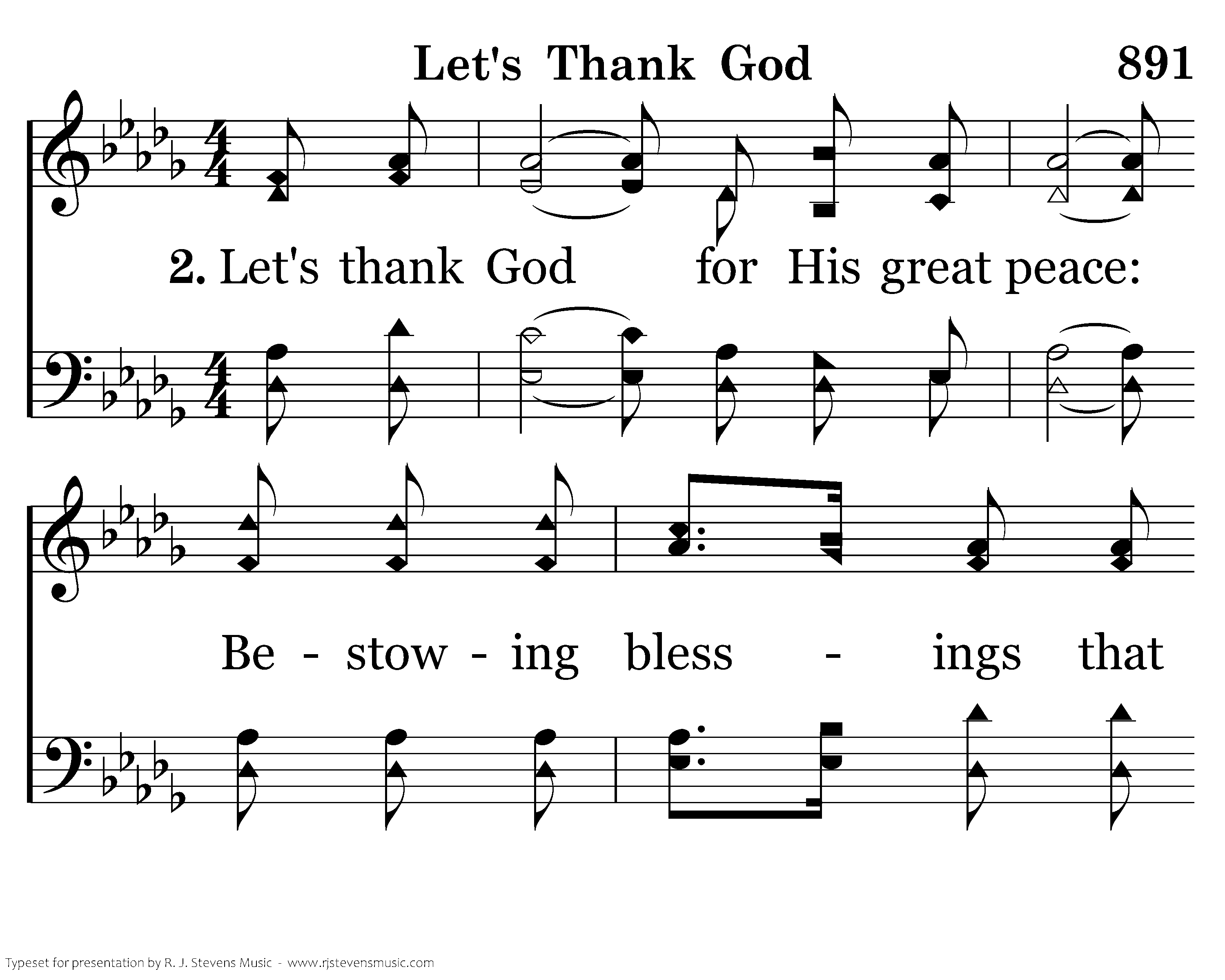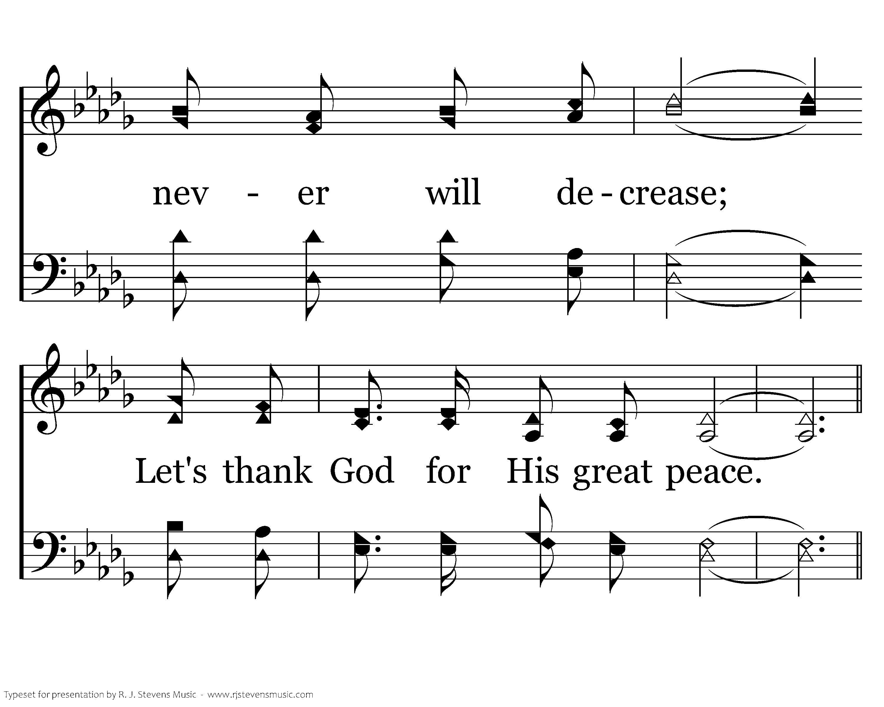Let's thank God for His great peace: Bestowing blessings that constantly increase; Giving us comfort that never will decrease; Let's thank God for His great peace.