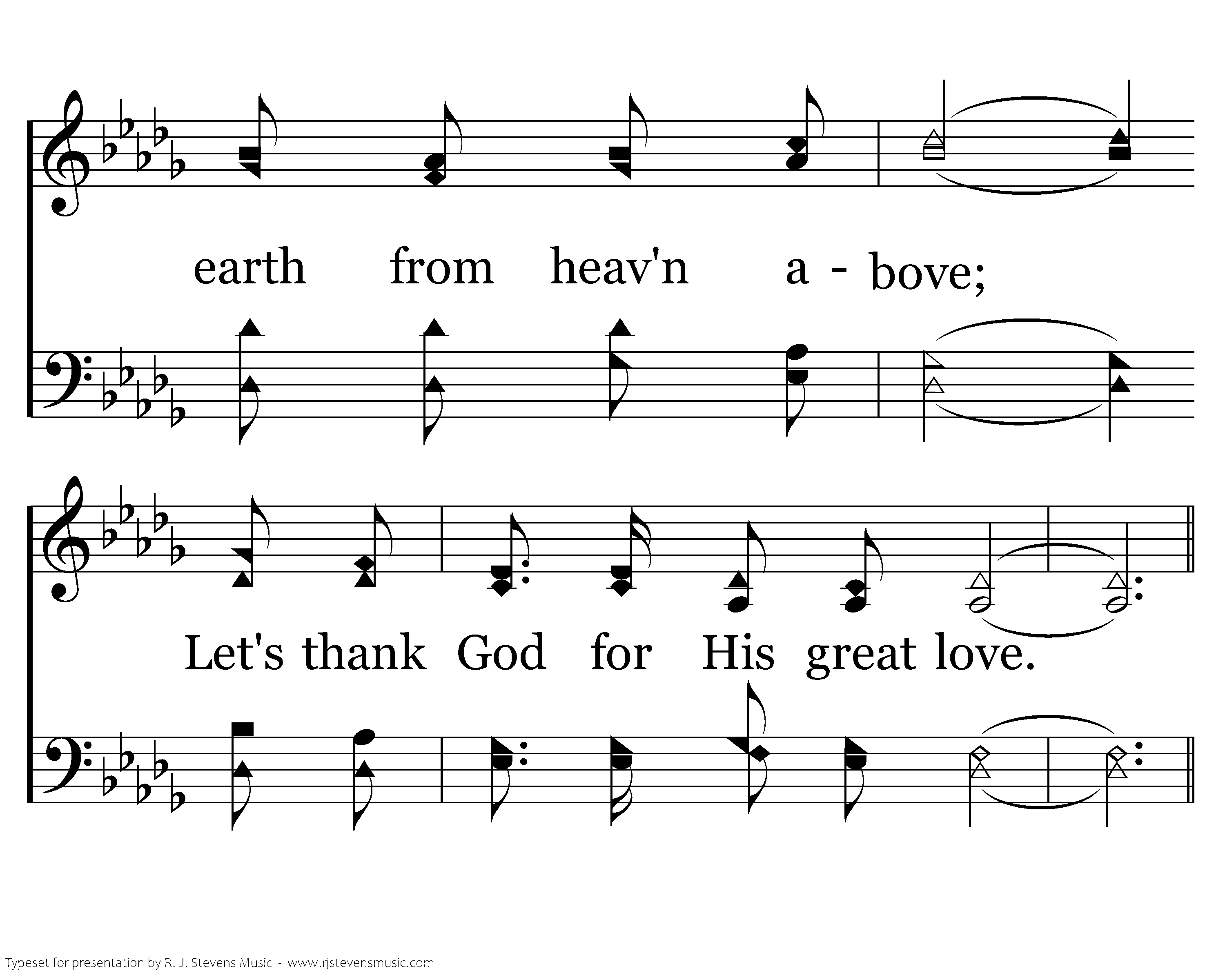 Let's thank God for His great love: Confirming hope by the message of a dove; Sending His only Son to earth from heav'n above; Let's thank God for His great love.