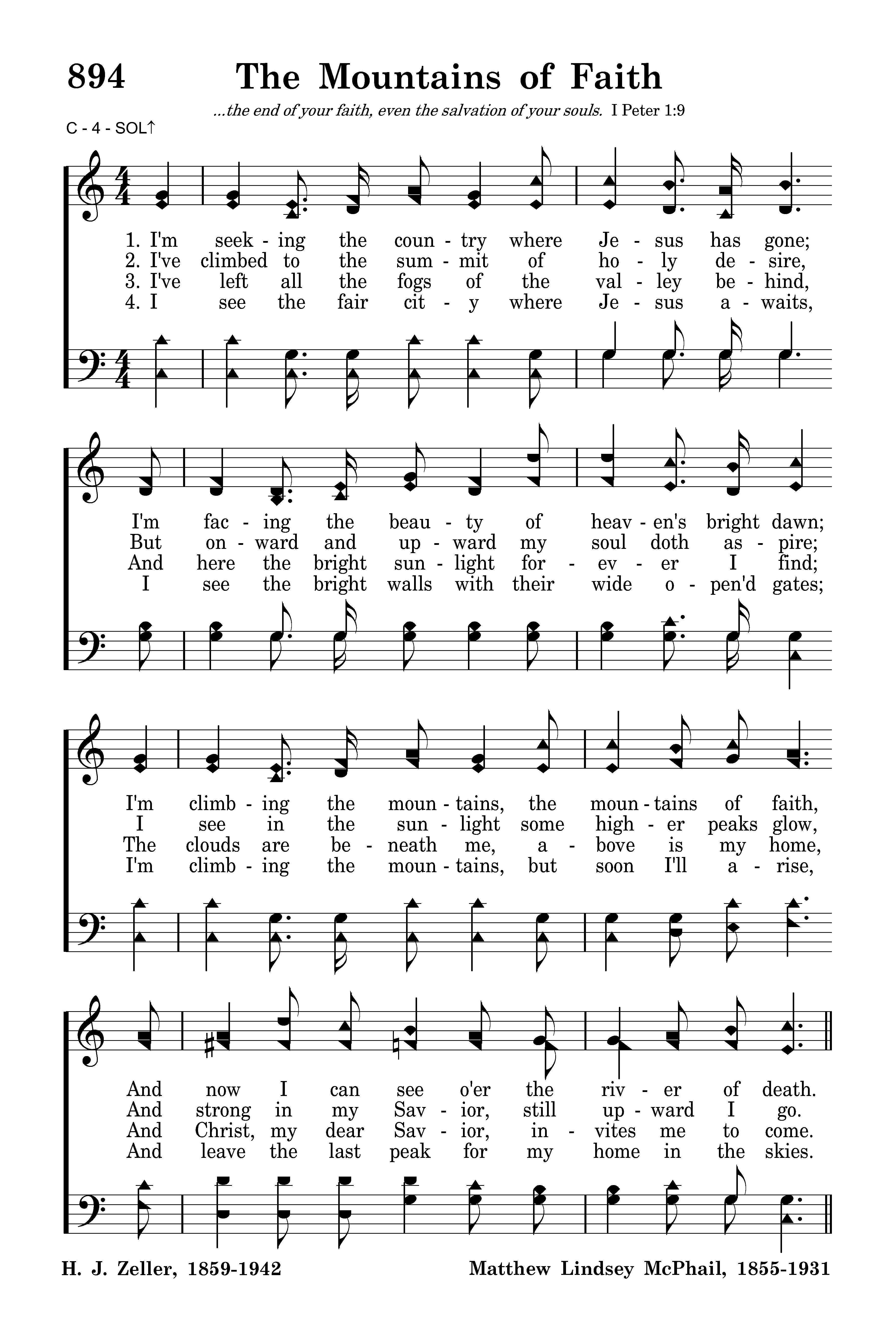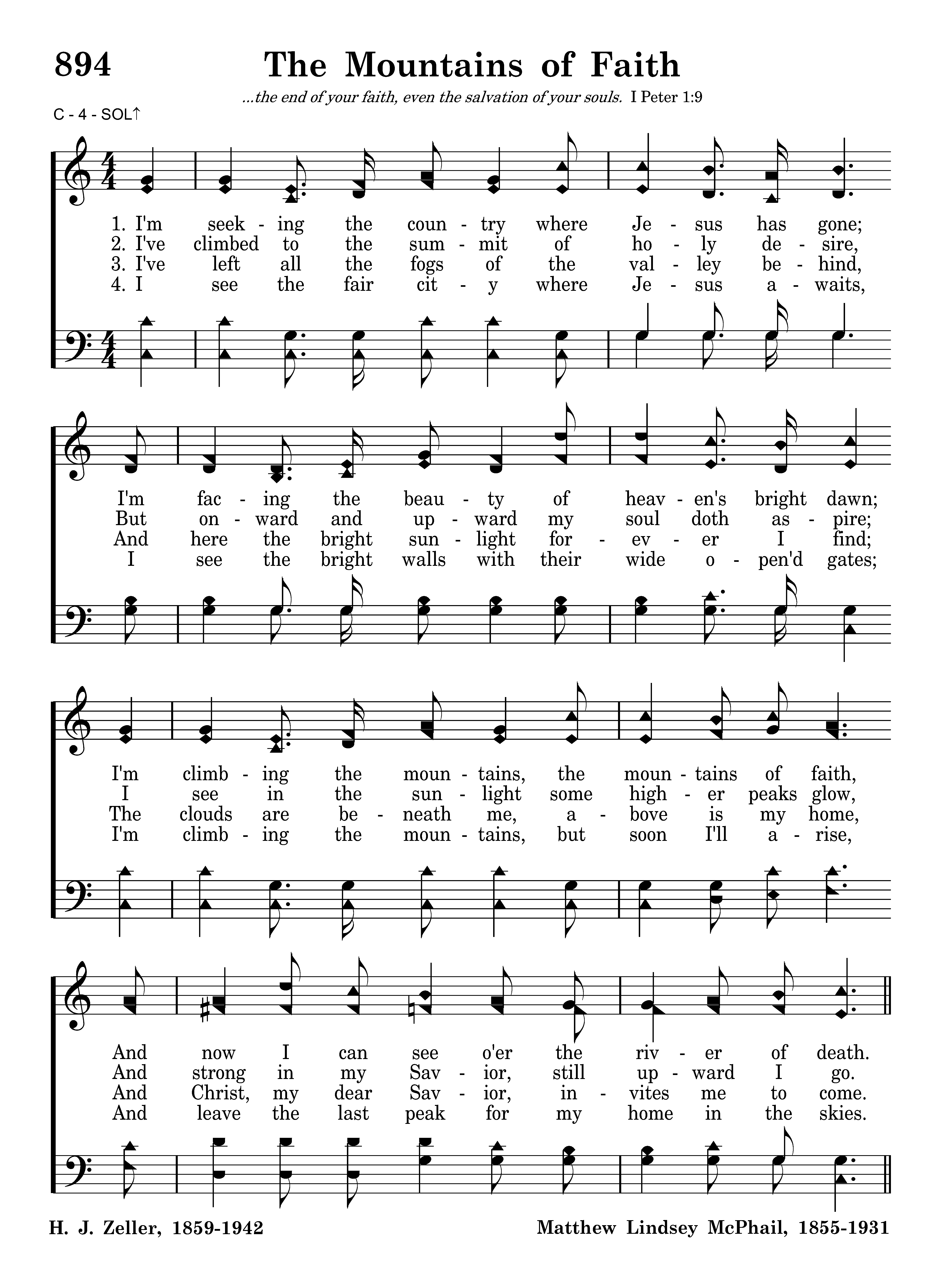 I'm seeking the country where Jesus has gone; I'm facing the beauty of heaven's bright dawn; I'm climbing the mountains, the mountains of faith, And now I can see o'er the river of death.