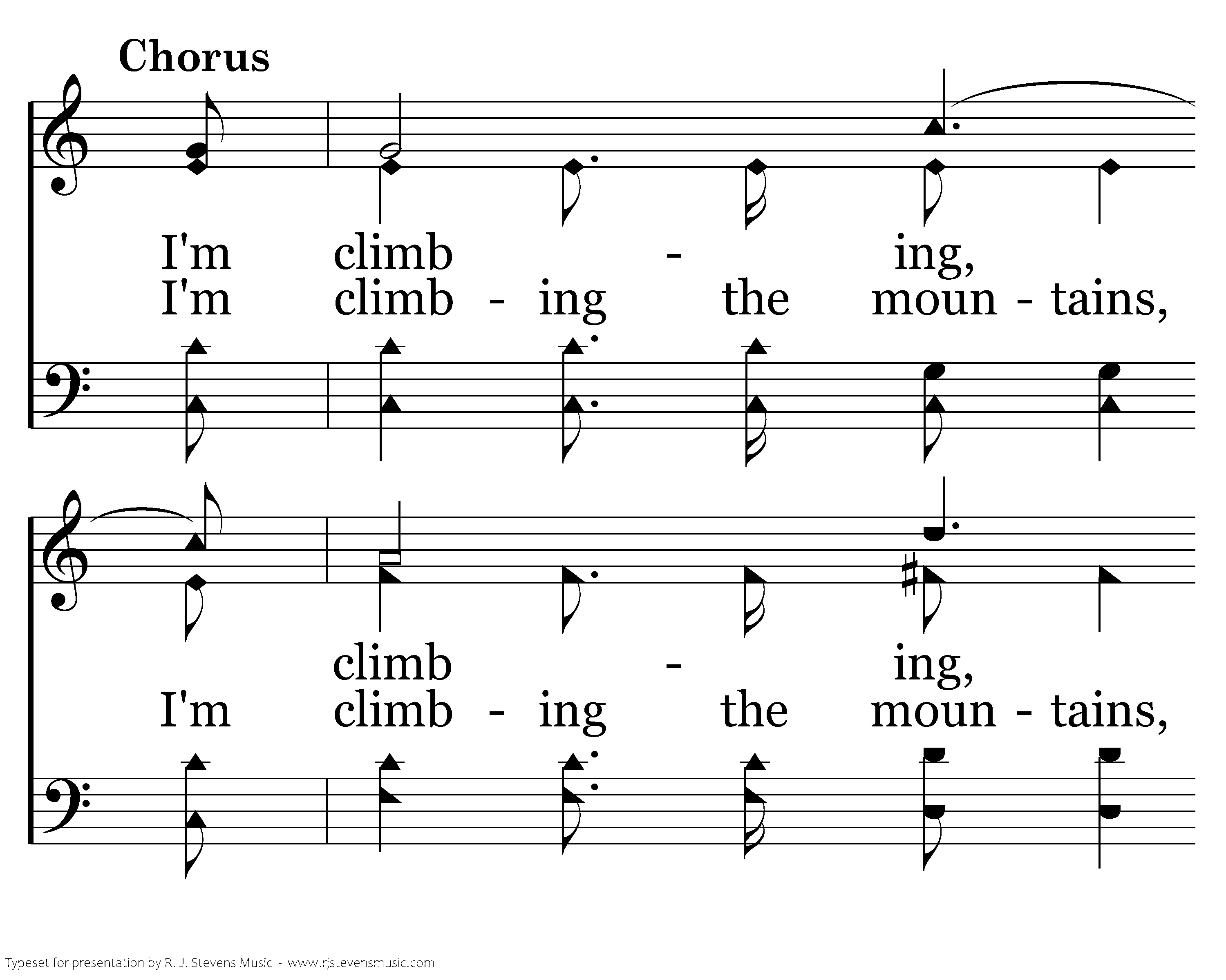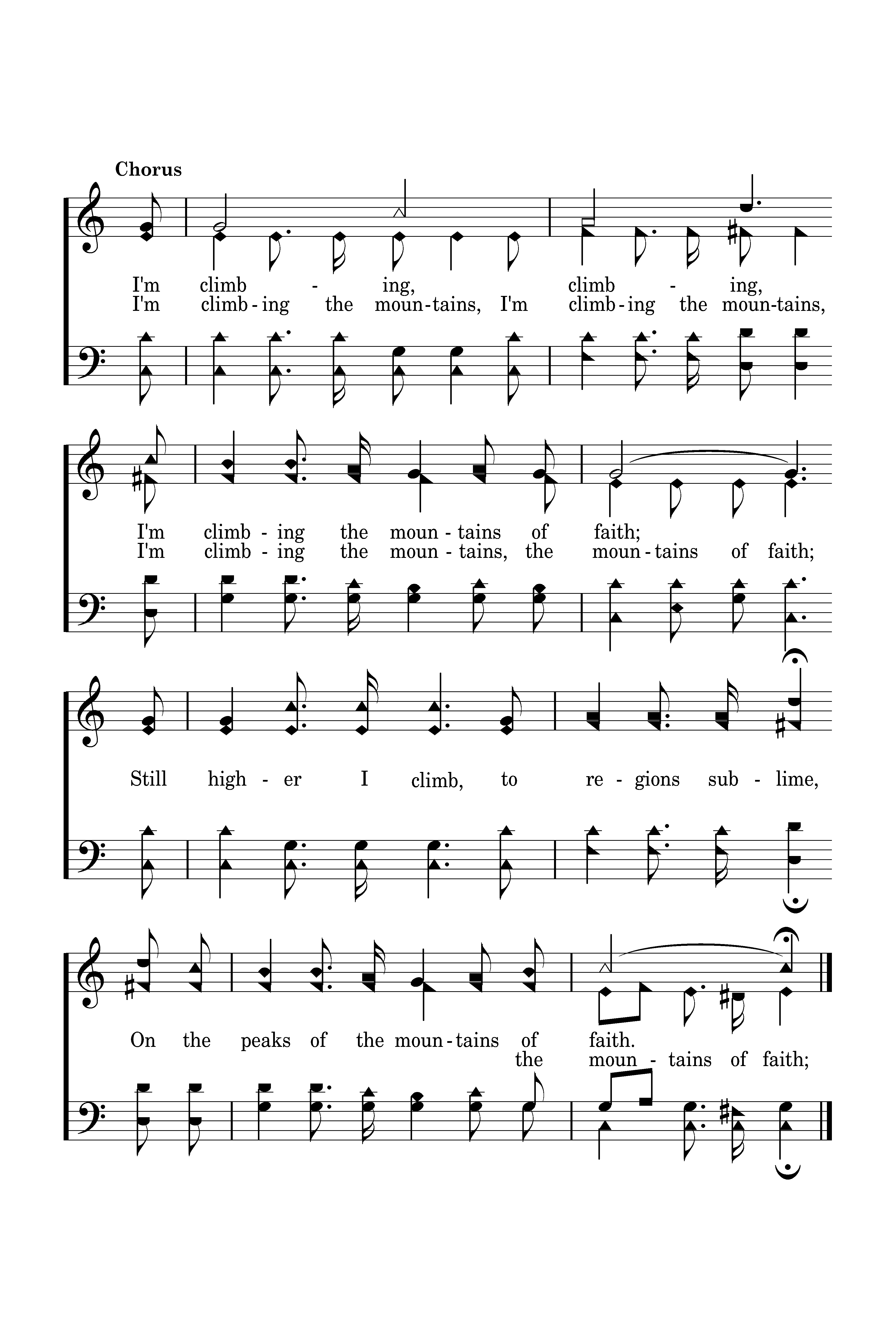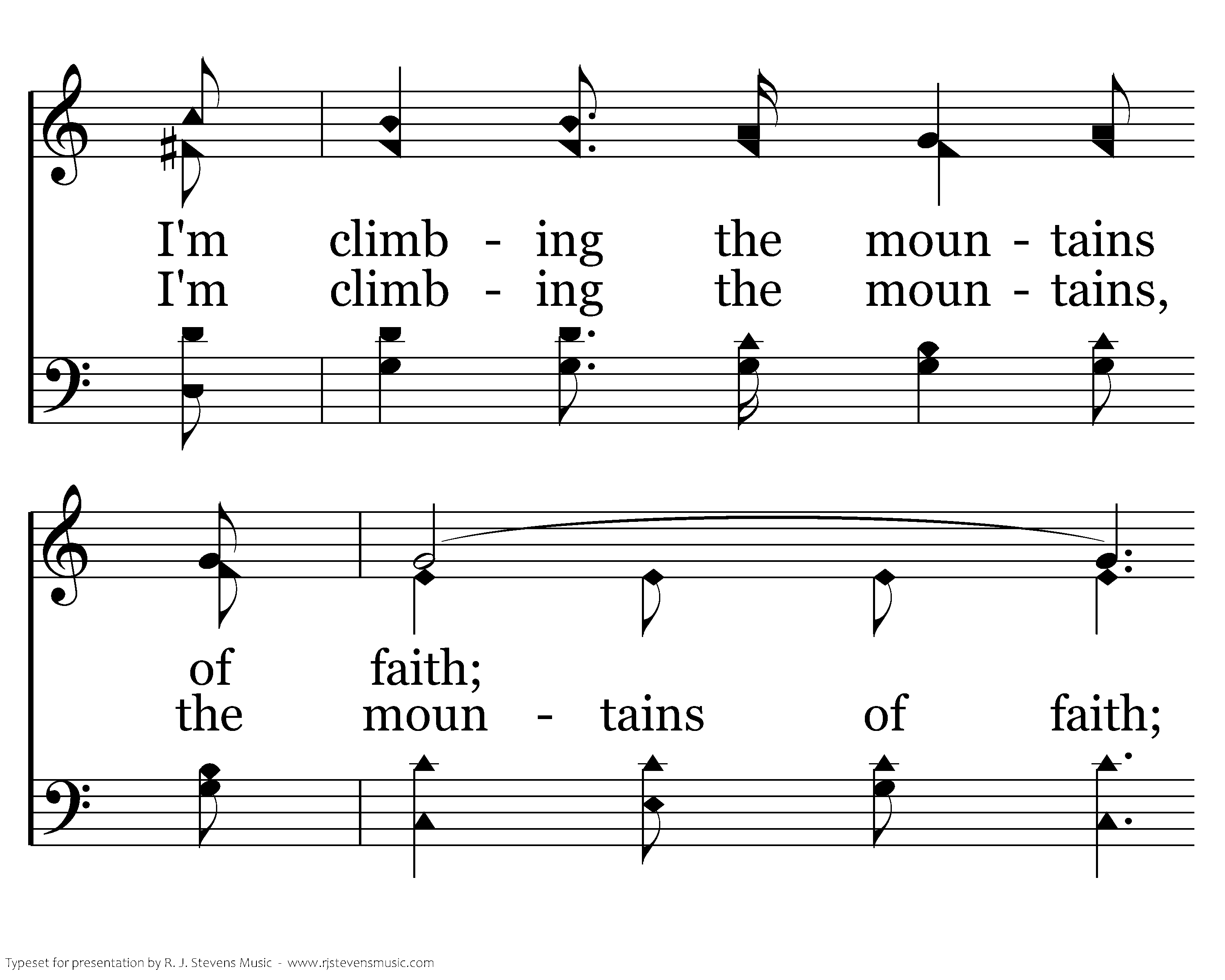 I'm climbing, climbing, I'm climbing the mountains of faith; Still higher I climb, to regions sublime, On the peaks of the mountains of faith.