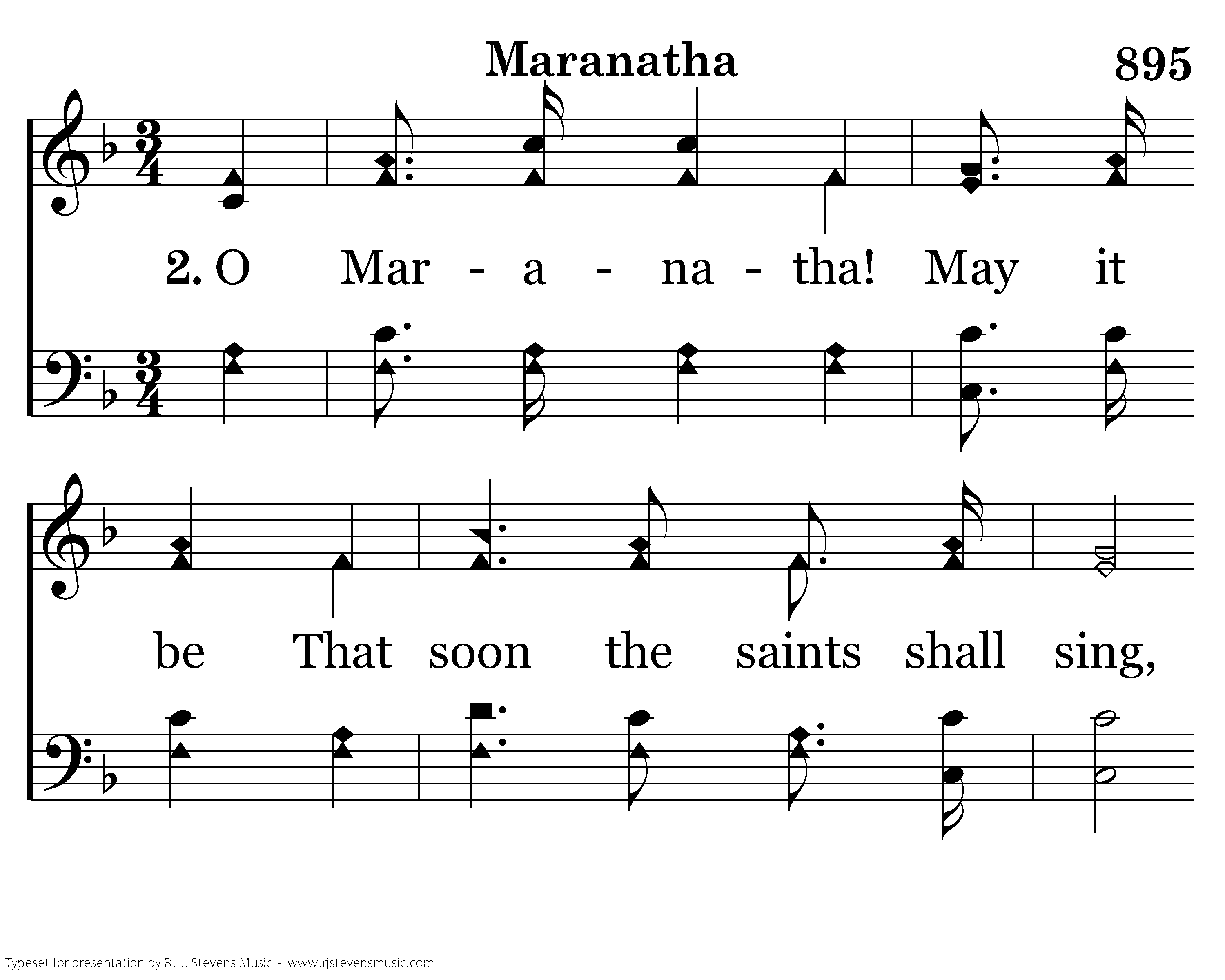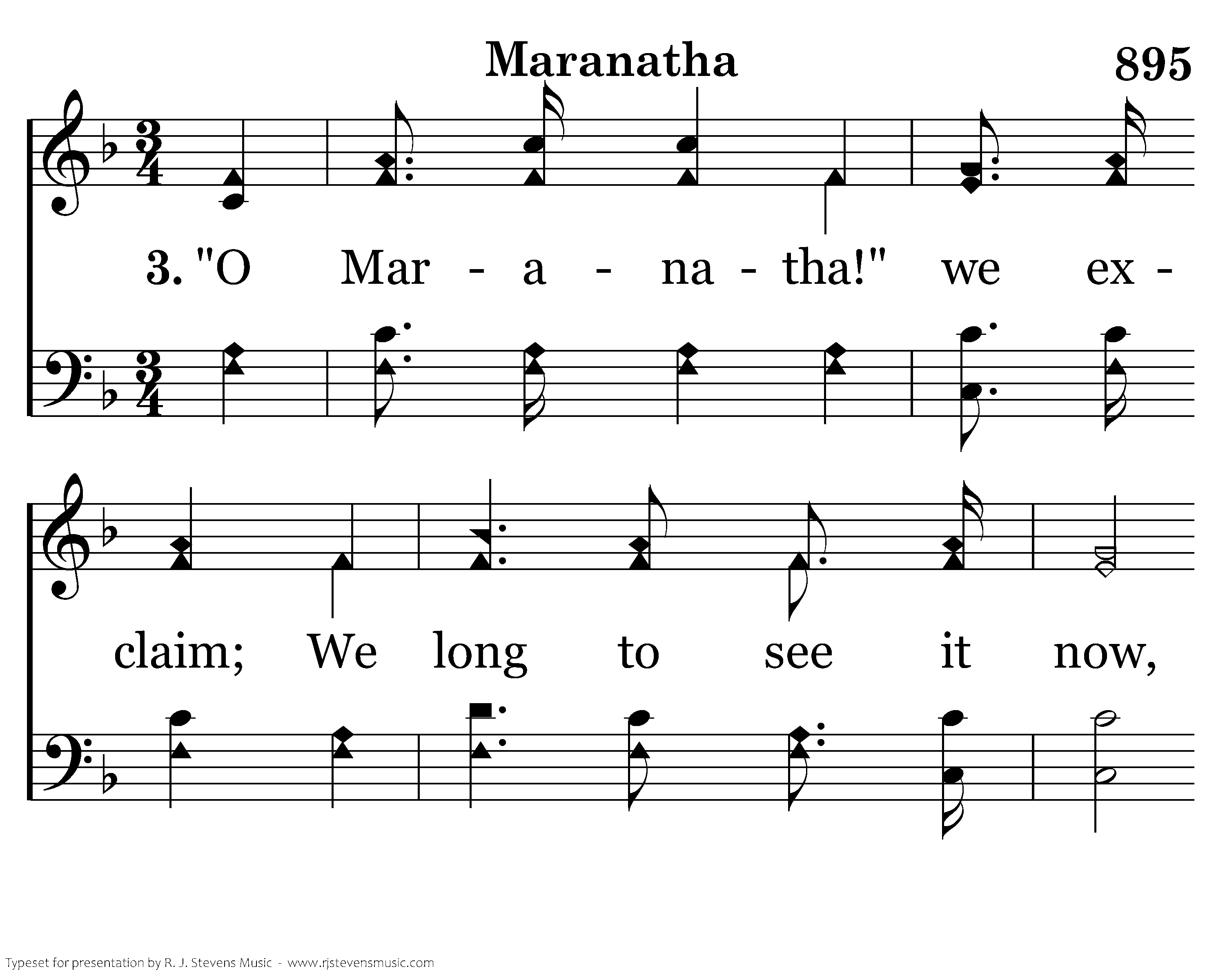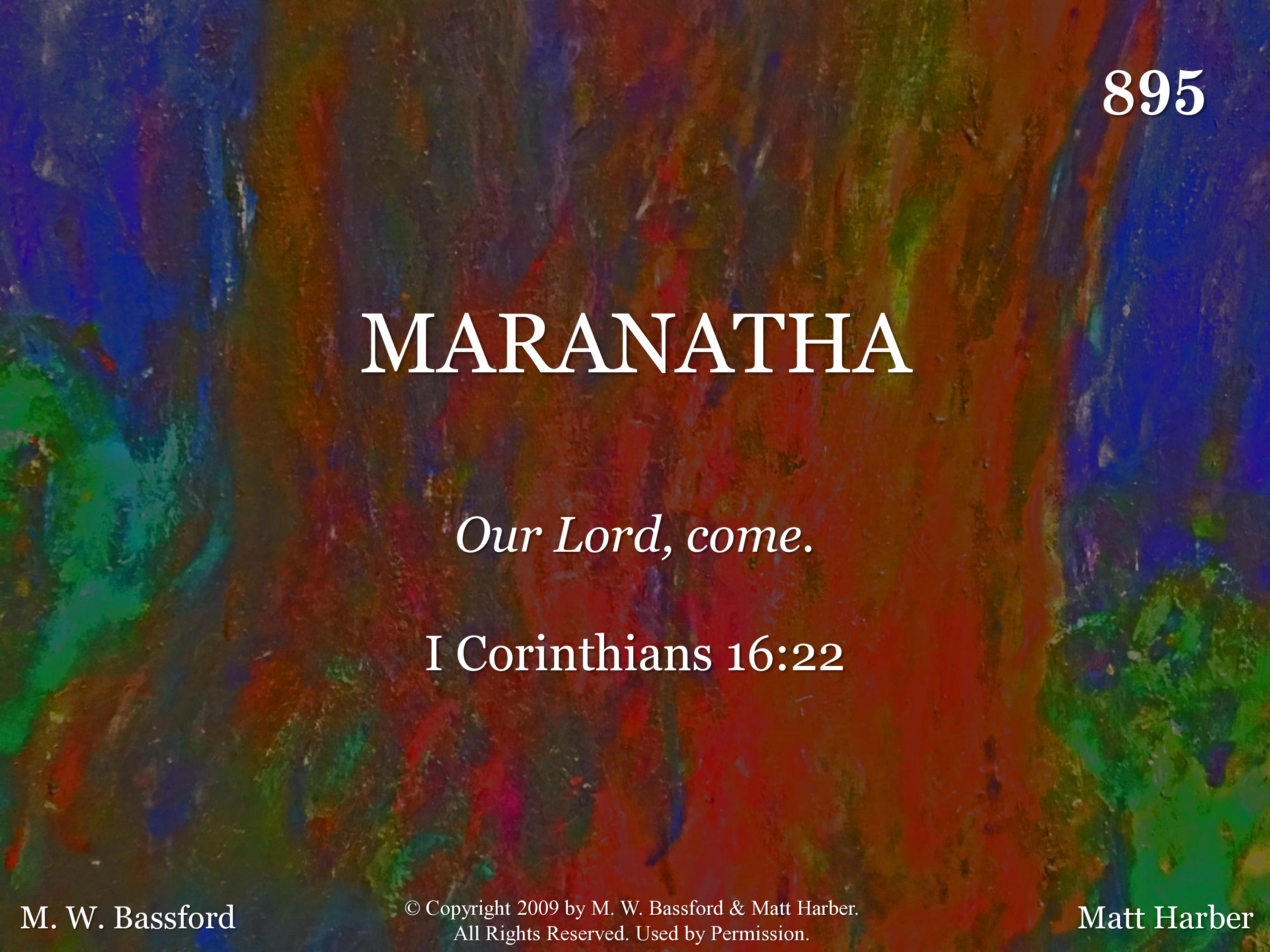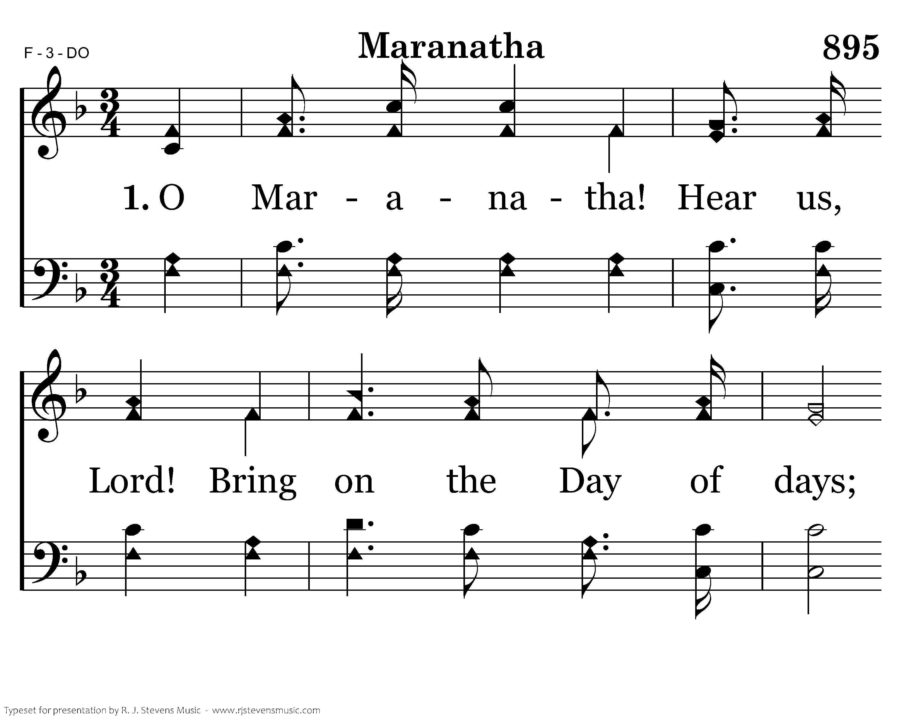 O Maranatha! Hear us, Lord! Bring on the Day of days; Descend with judgment and reward, To shouts of fear and praise. Reveal Yourself in flaming fire, With angels in their might, That we may see our hearts' desire And marvel at the sight.