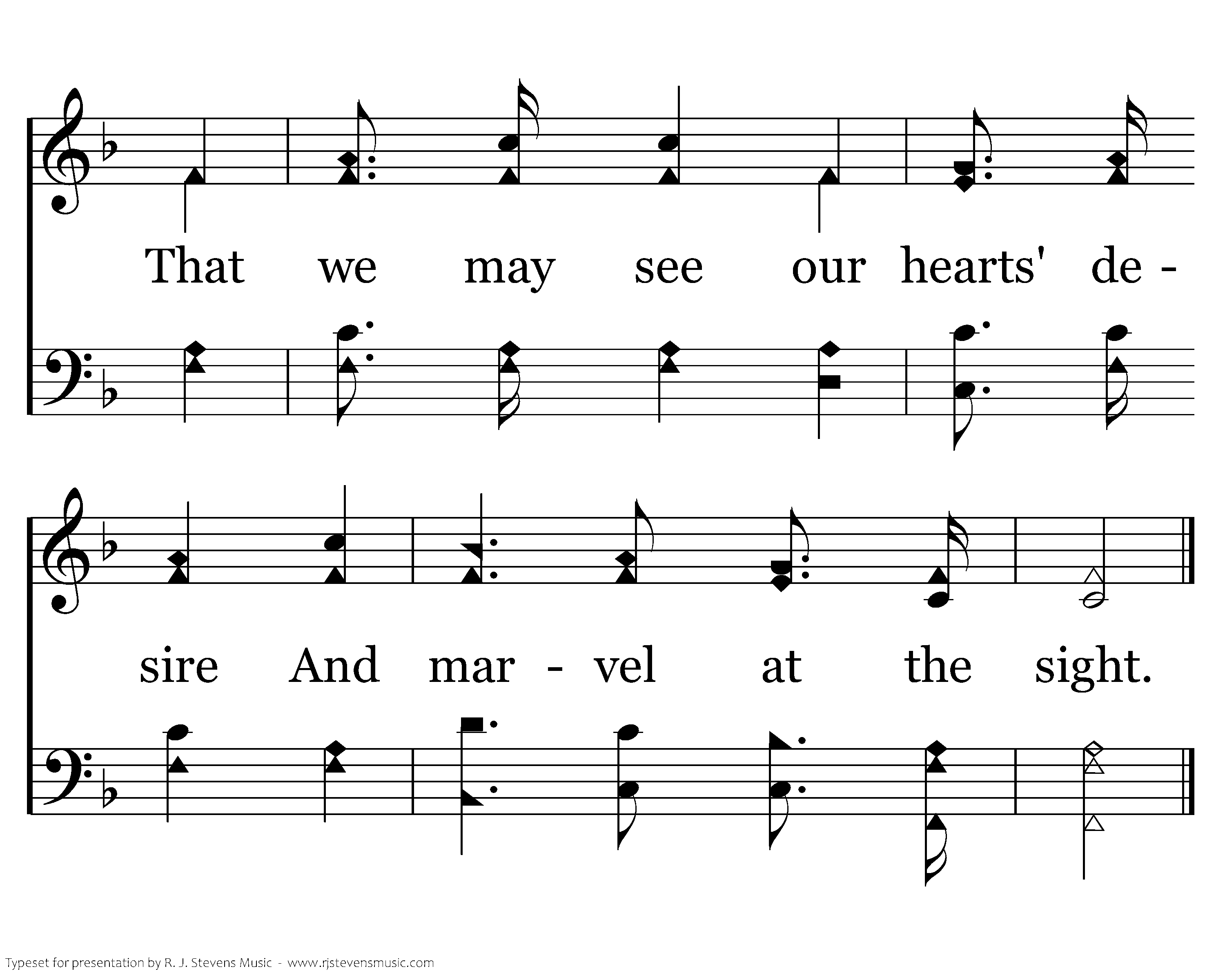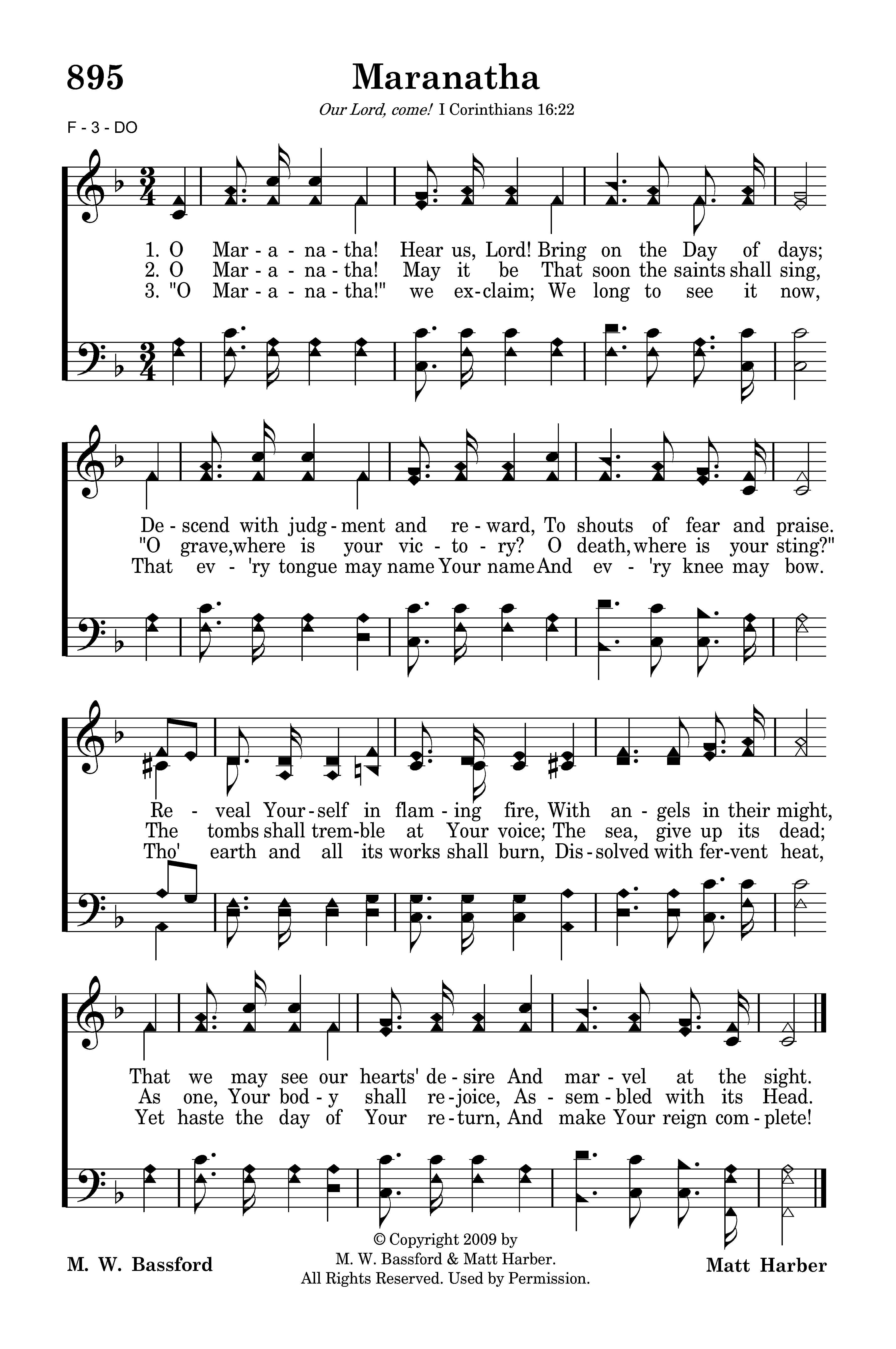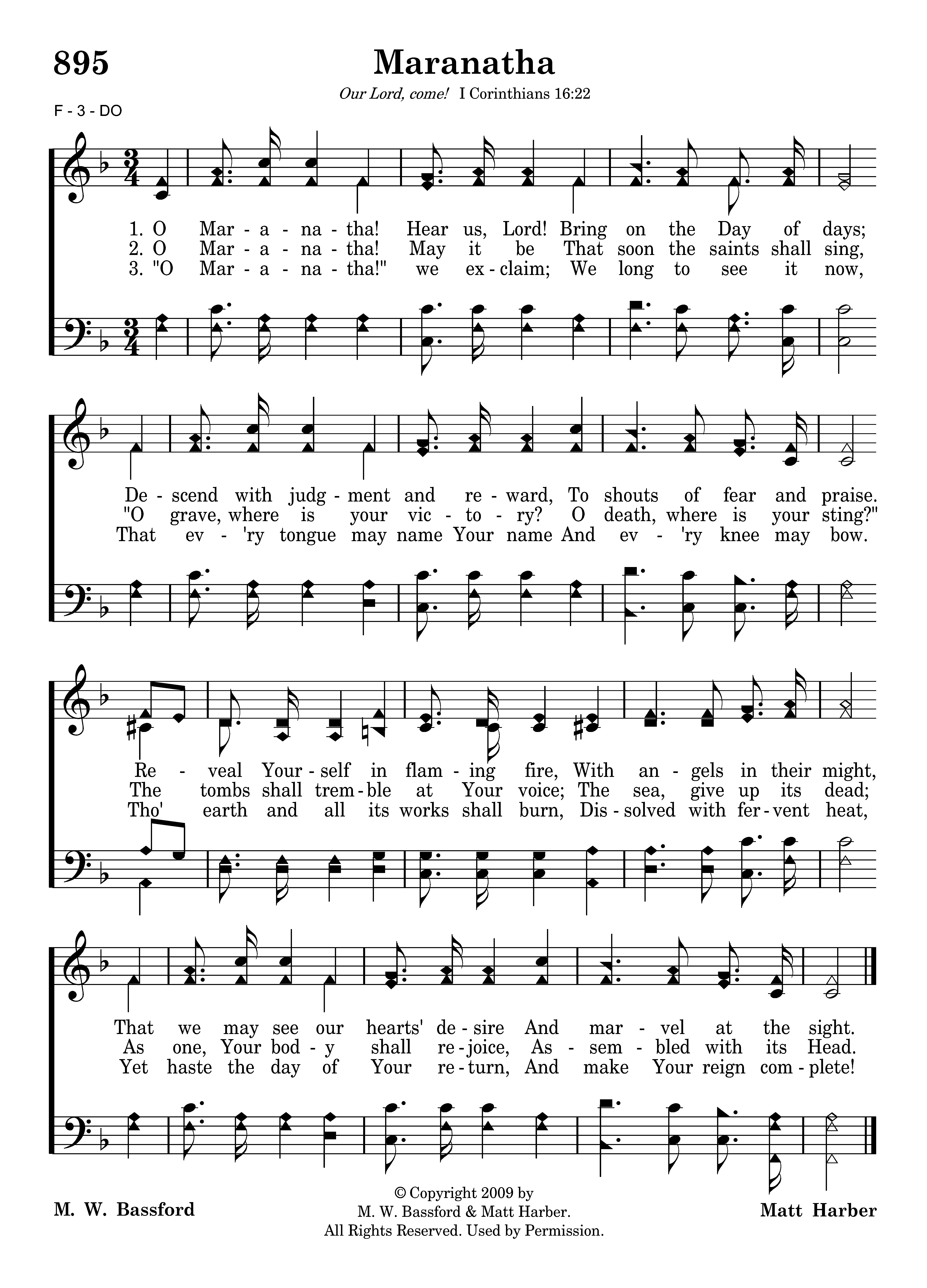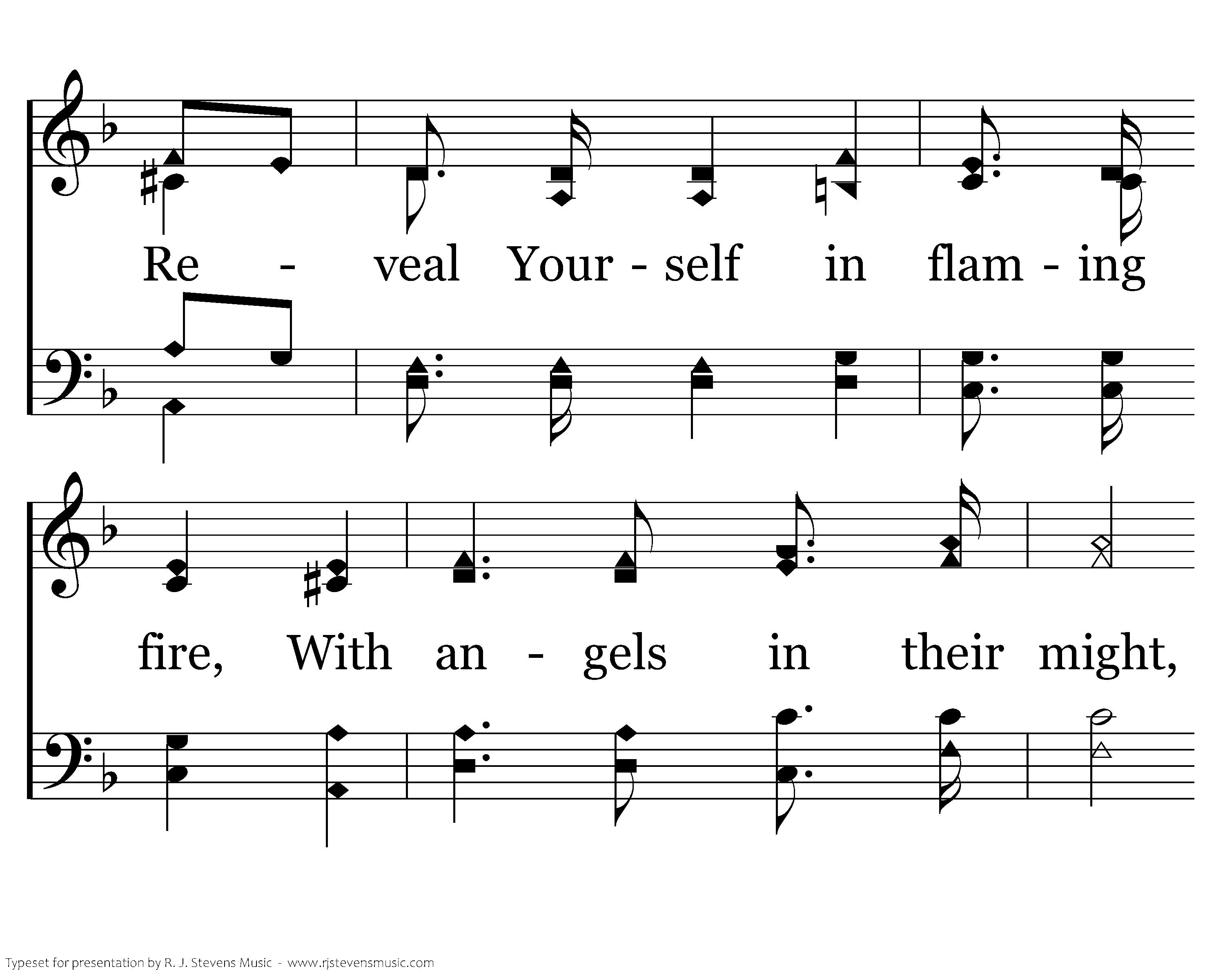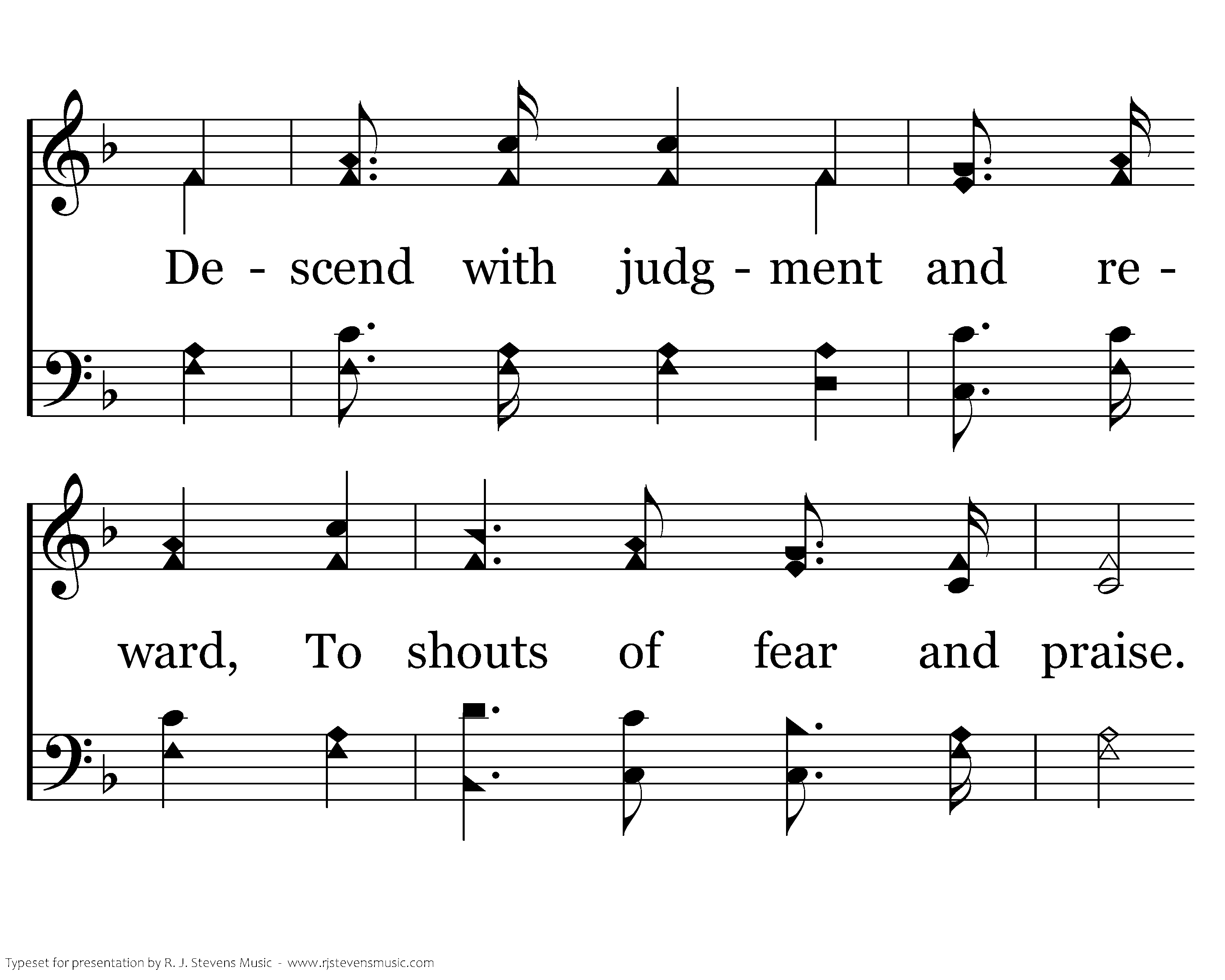 O Maranatha! Hear us, Lord! Bring on the Day of days; Descend with judgment and reward, To shouts of fear and praise. Reveal Yourself in flaming fire, With angels in their might, That we may see our hearts' desire And marvel at the sight.