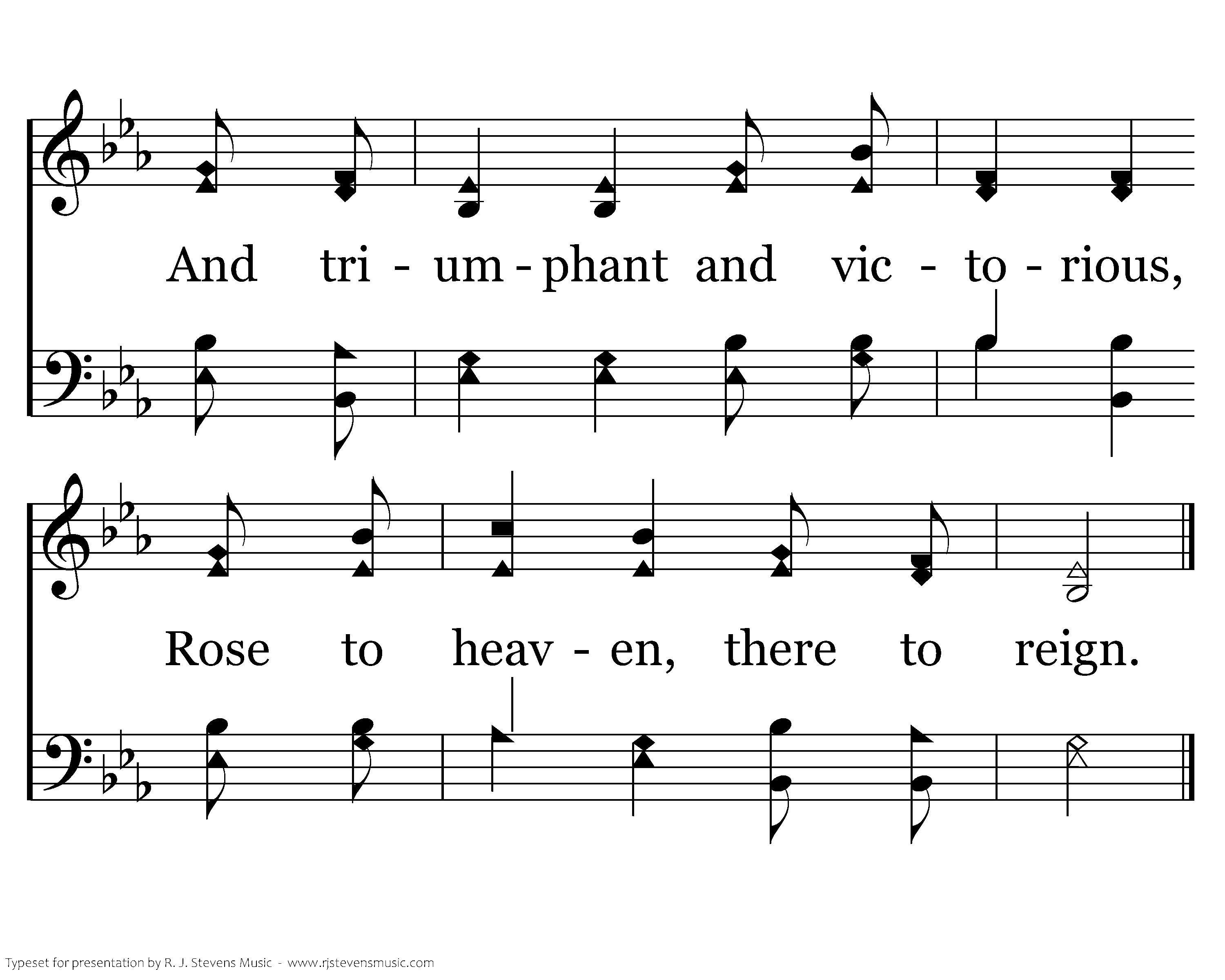 Plunged into death's cold, dark waters Was our Savior, Jesus Christ. With strong love, not dimmed or wav'ring, On the cross He gave His life. He arose up from the sealed tomb, Breaking all death's pow'rful chains, And triumphant and victorious, Rose to heaven, there to reign.