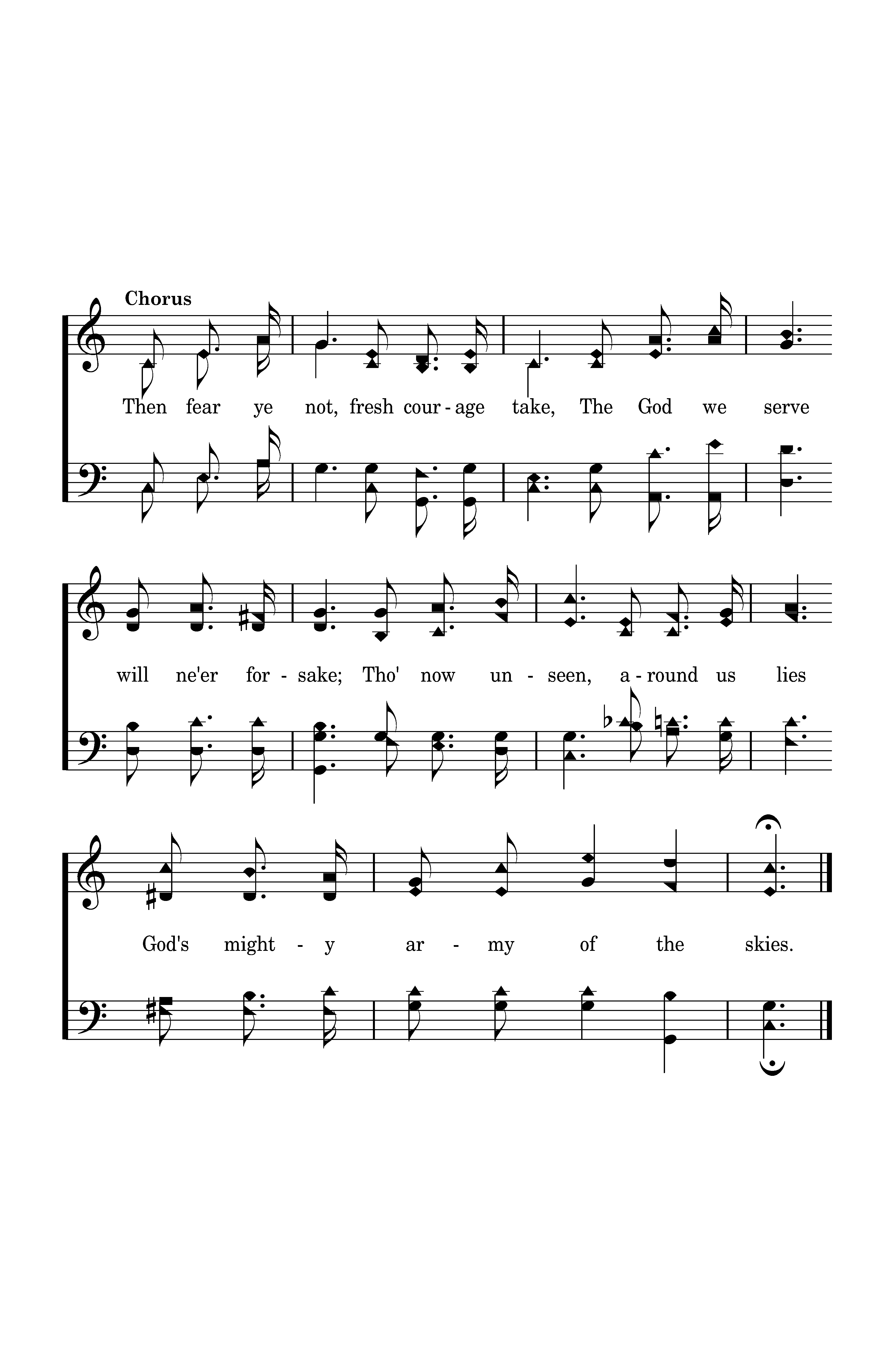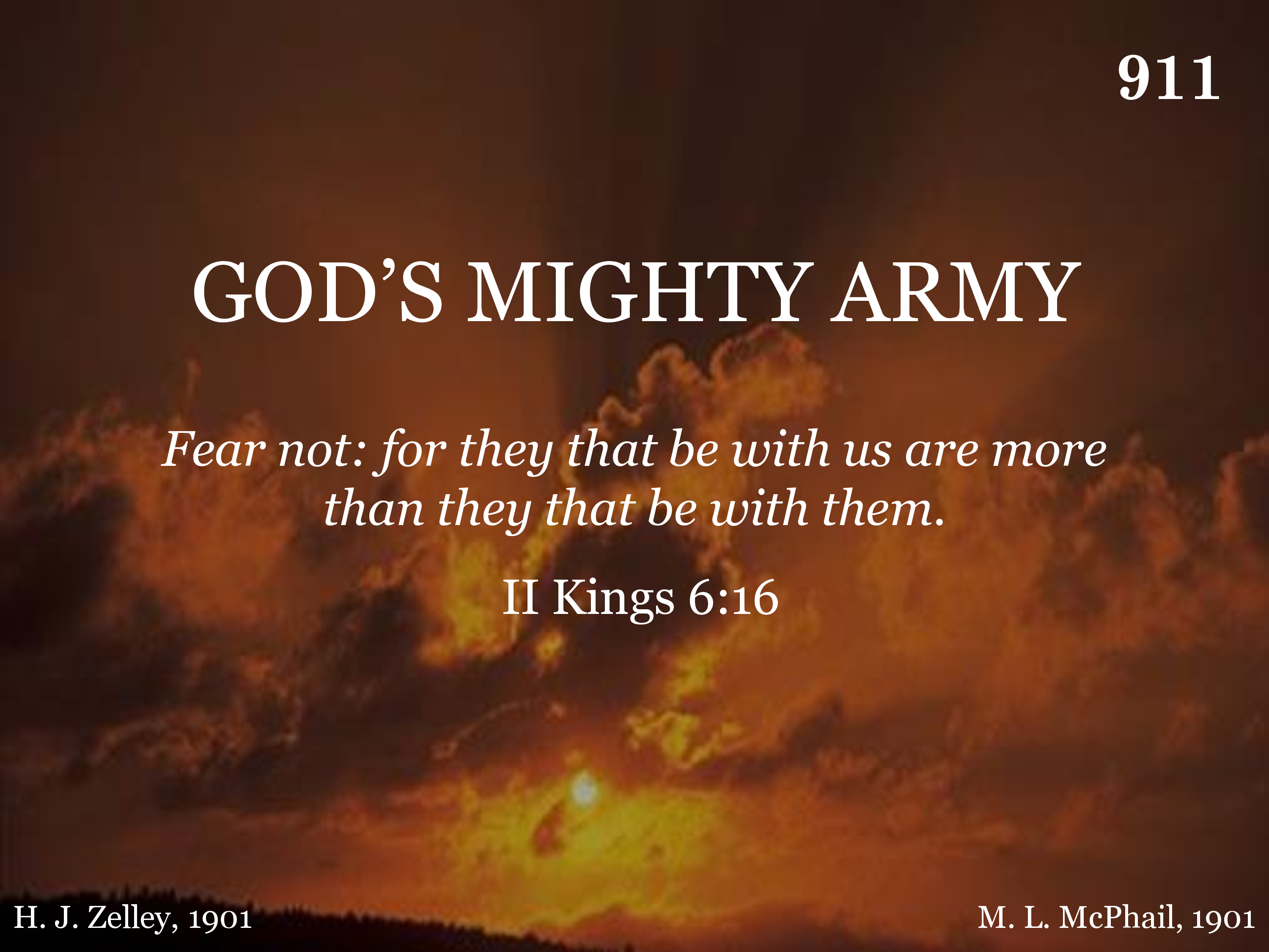 Then fear ye not, fresh courage take, The God we serve will ne'er forsake; Tho' now unseen, around us lies God's mighty army of the skies.