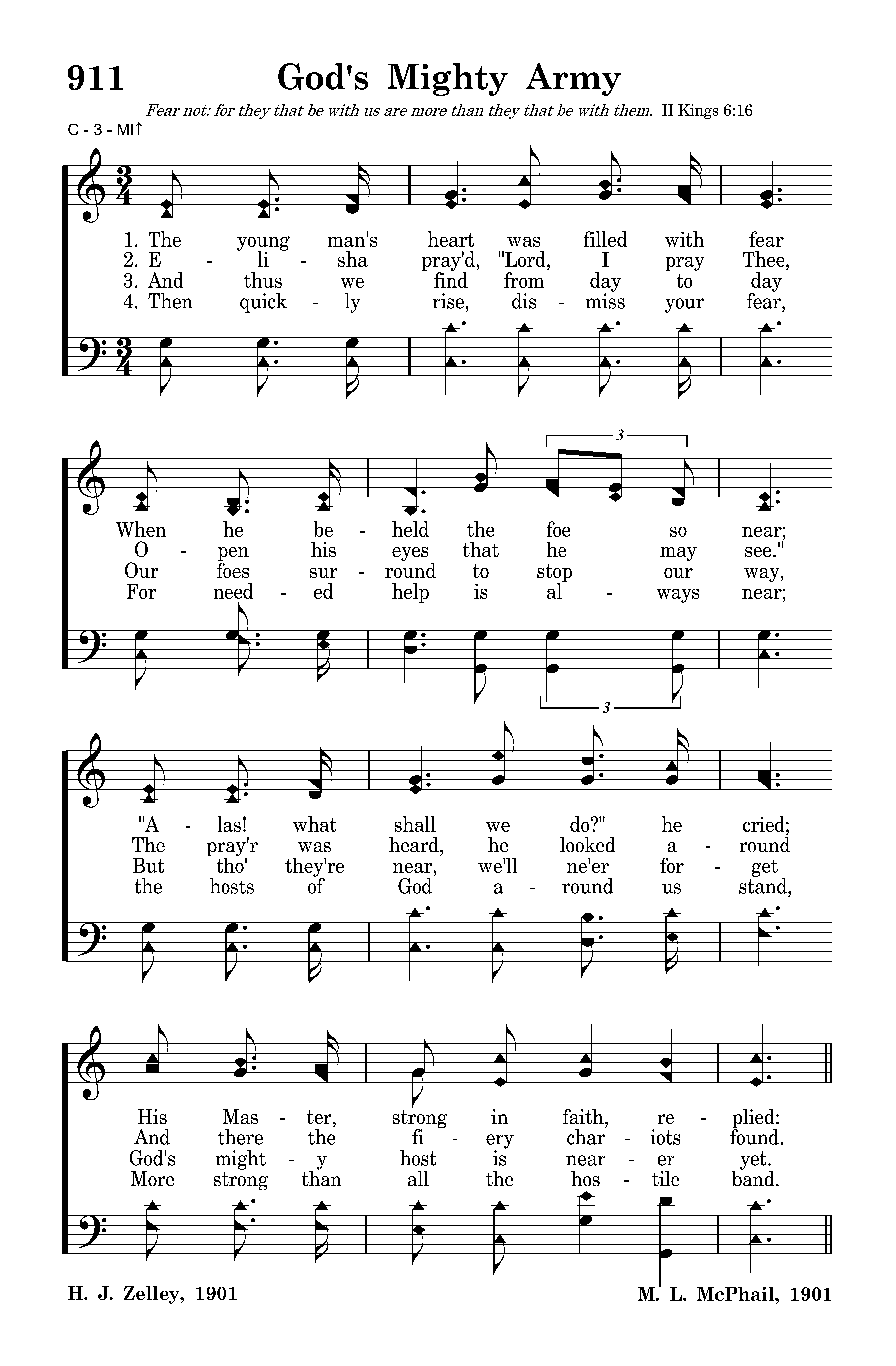 The young man's heart was filled with fear When he beheld the foe so near; "A-las! what shall we do?" he cried; His Master, strong in faith, replied: