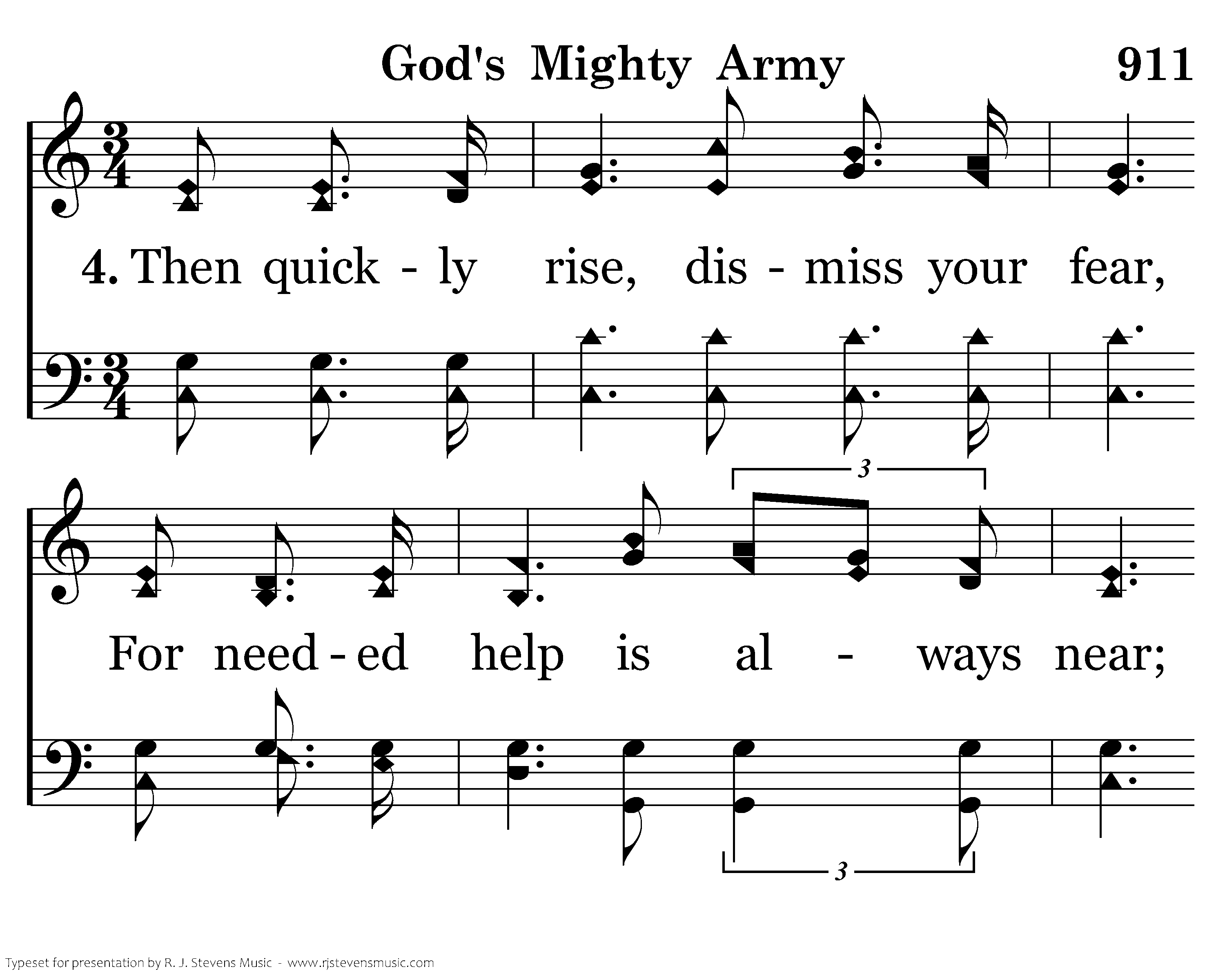 Then quickly rise, dismiss your fear, For needed help is always near; the hosts of God around us stand, More strong than all the hostile band.