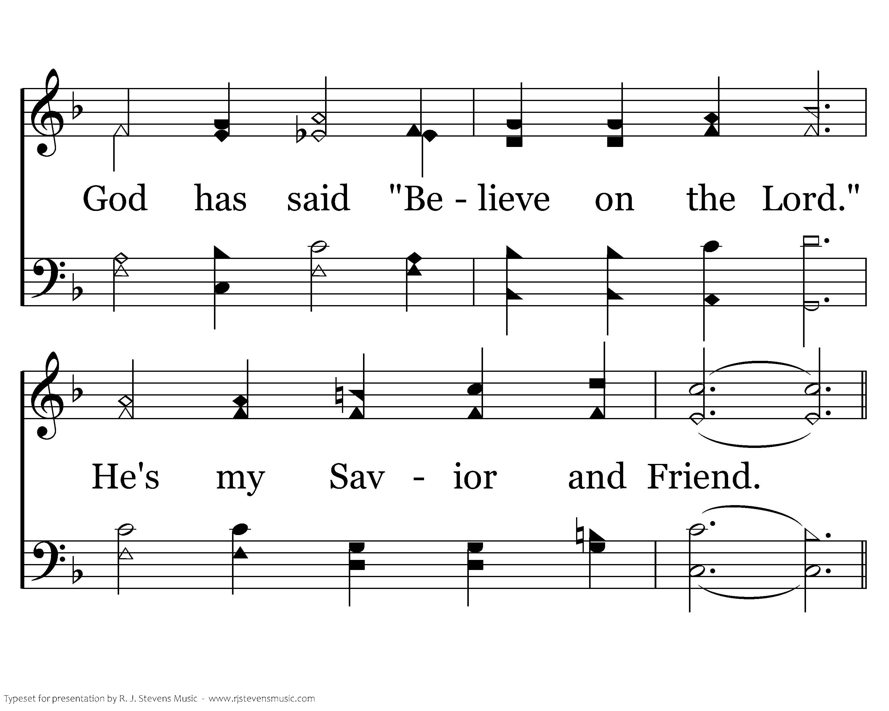 Faith in God Who sent us His Son; He is coming again. God has said "Believe on the Lord." He's my Savior and Friend.