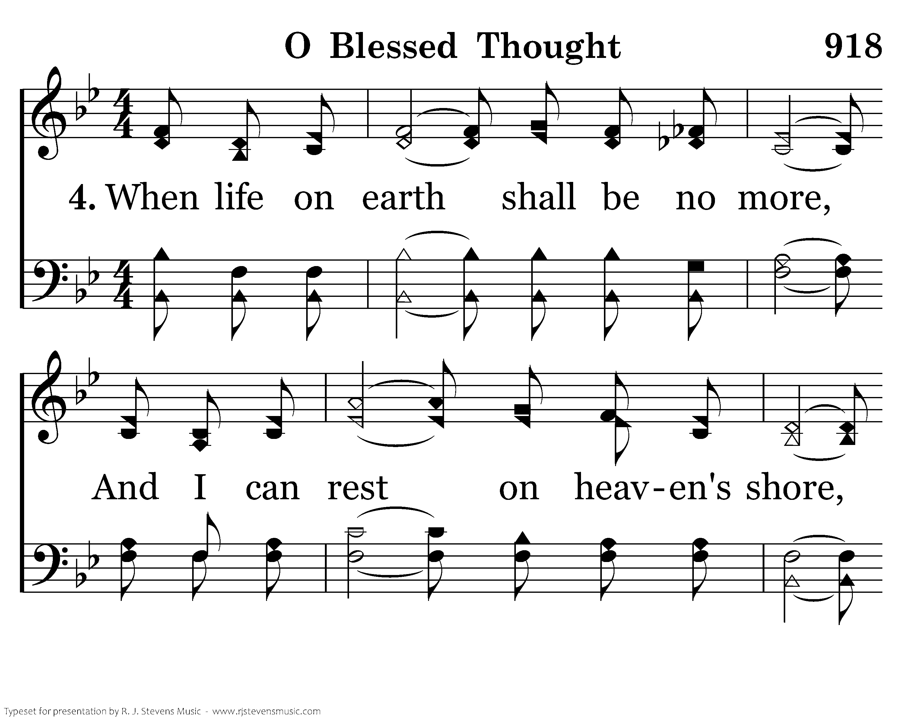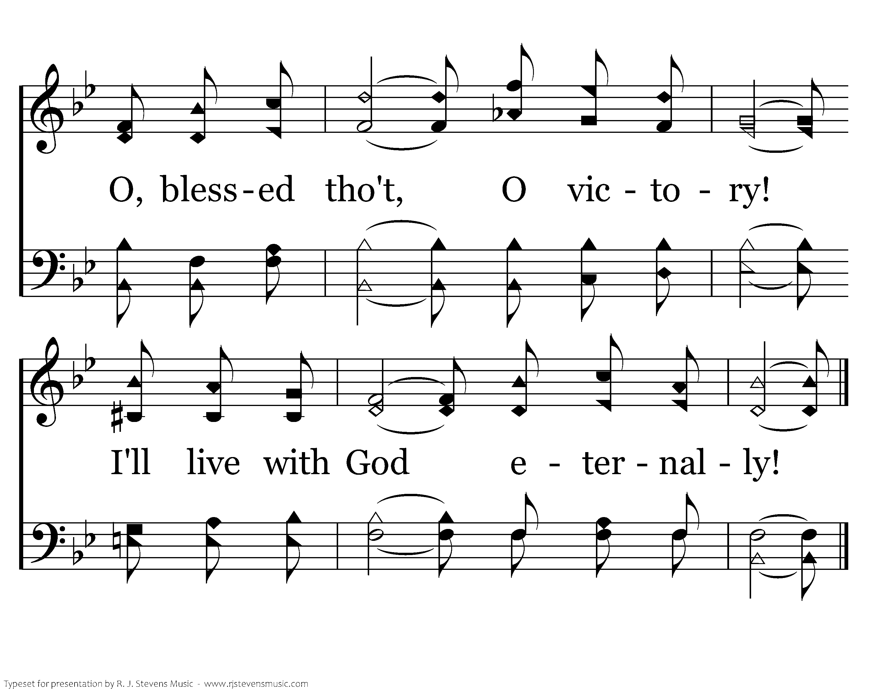 When life on earth shall be no more, And I can rest on heaven's shore, O, blessed tho't, O victory! I'll live with God eternally!