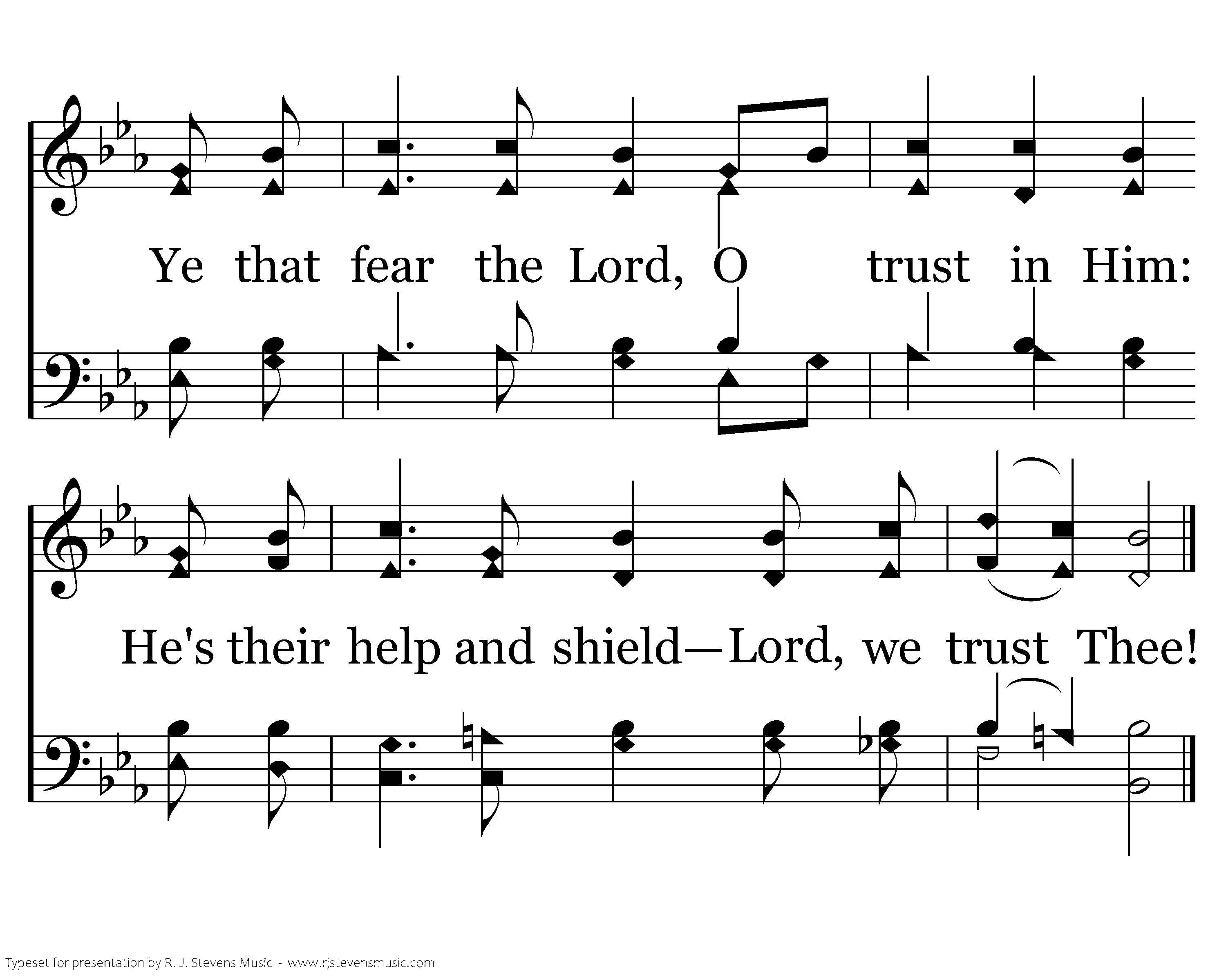 Not unto us, Lord, Not unto us, but unto Thy name give glory; Ye that fear the Lord, O trust in Him: He's their help and shield Lord, we trust Thee!