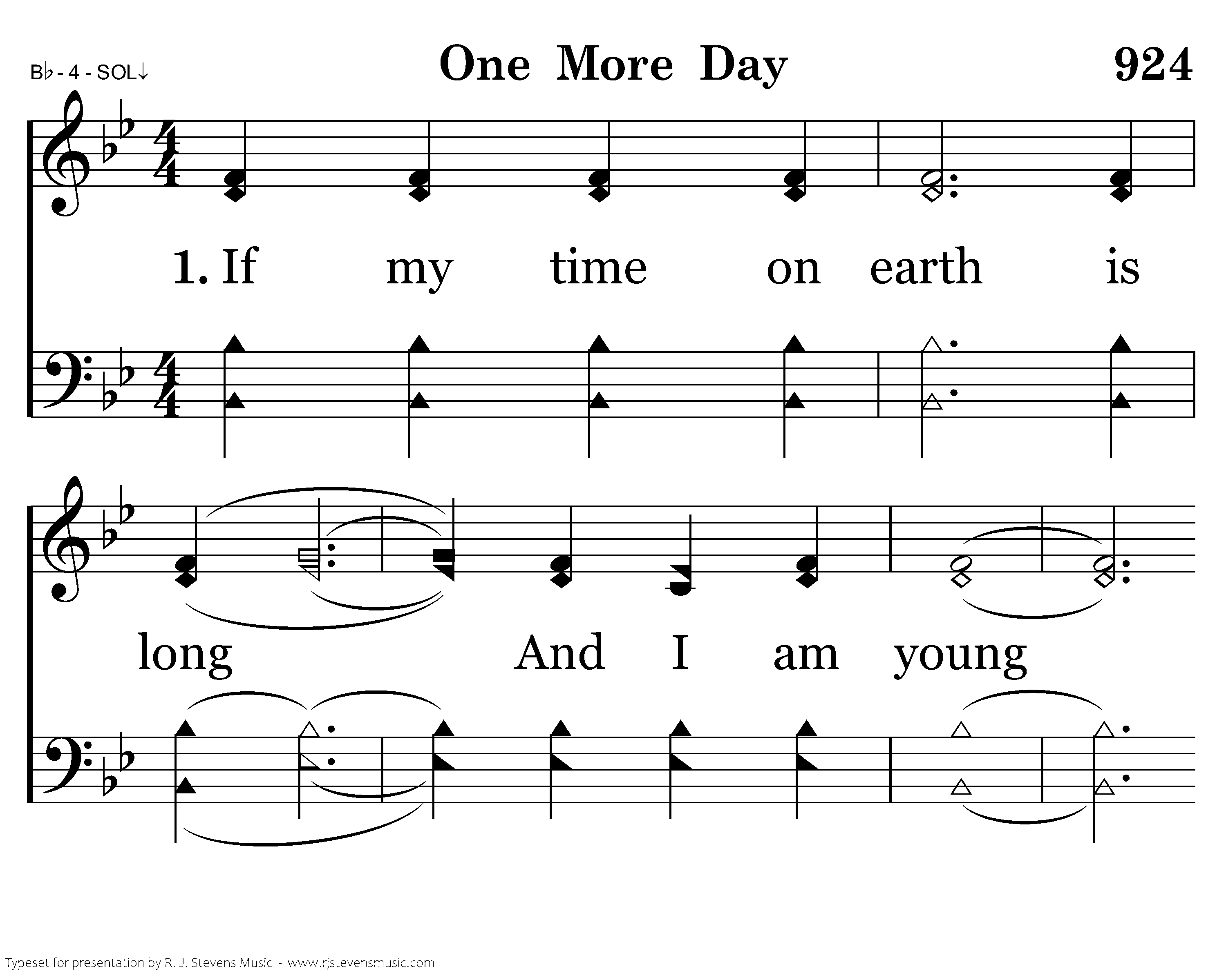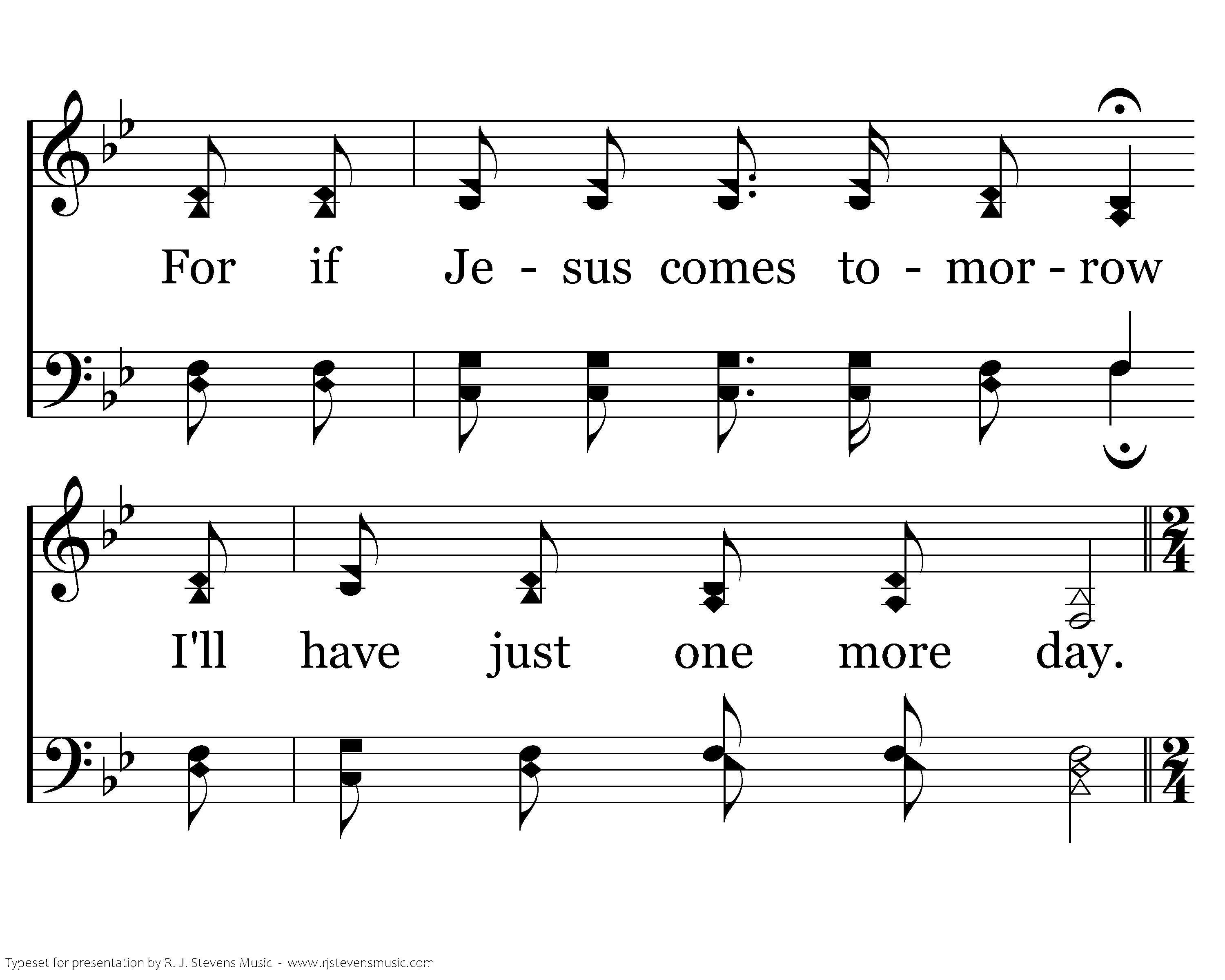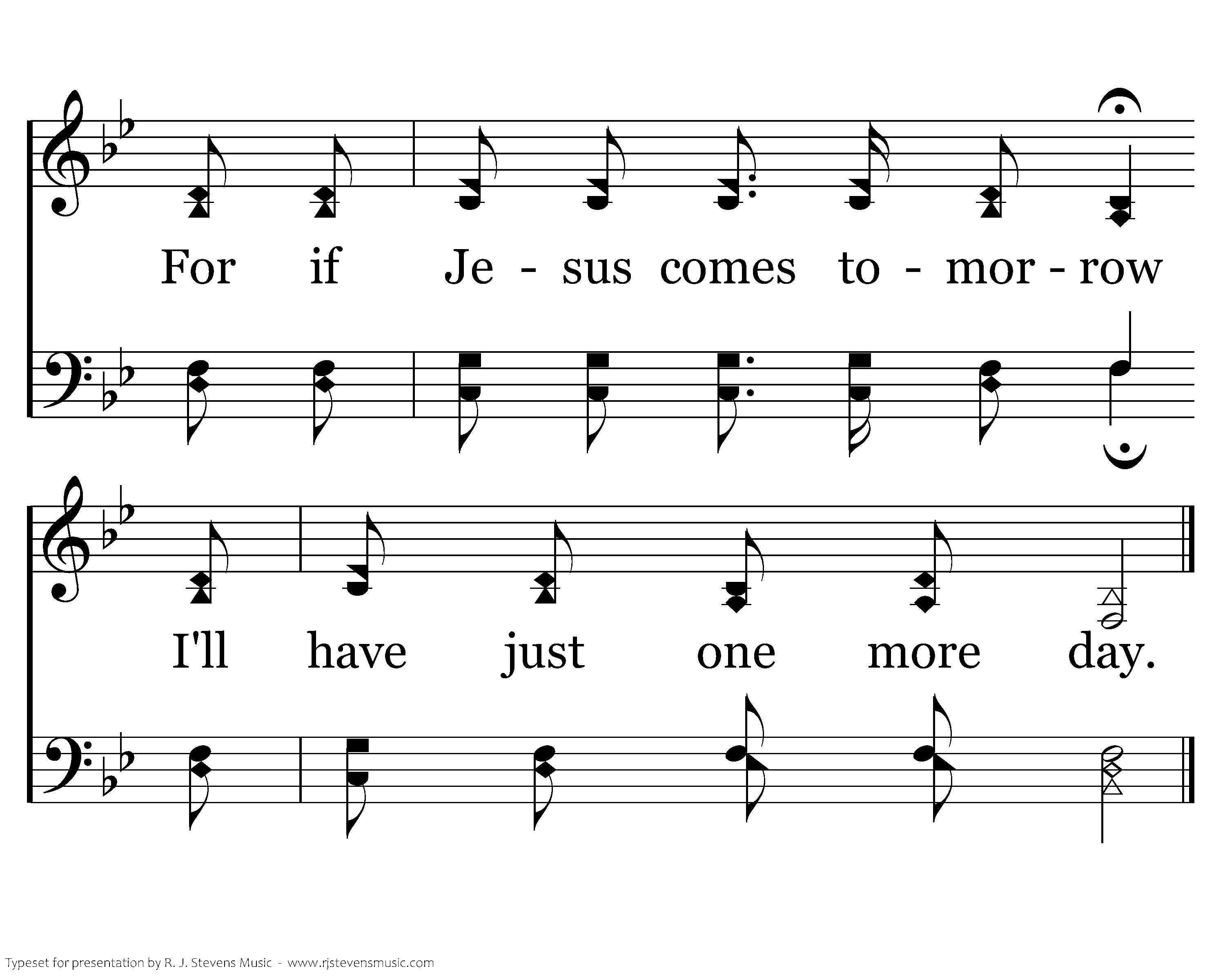 If my time on earth is long And I am young And I see God's people dying, I want to help them. For if Jesus comes tomorrow I'll have just one more day.