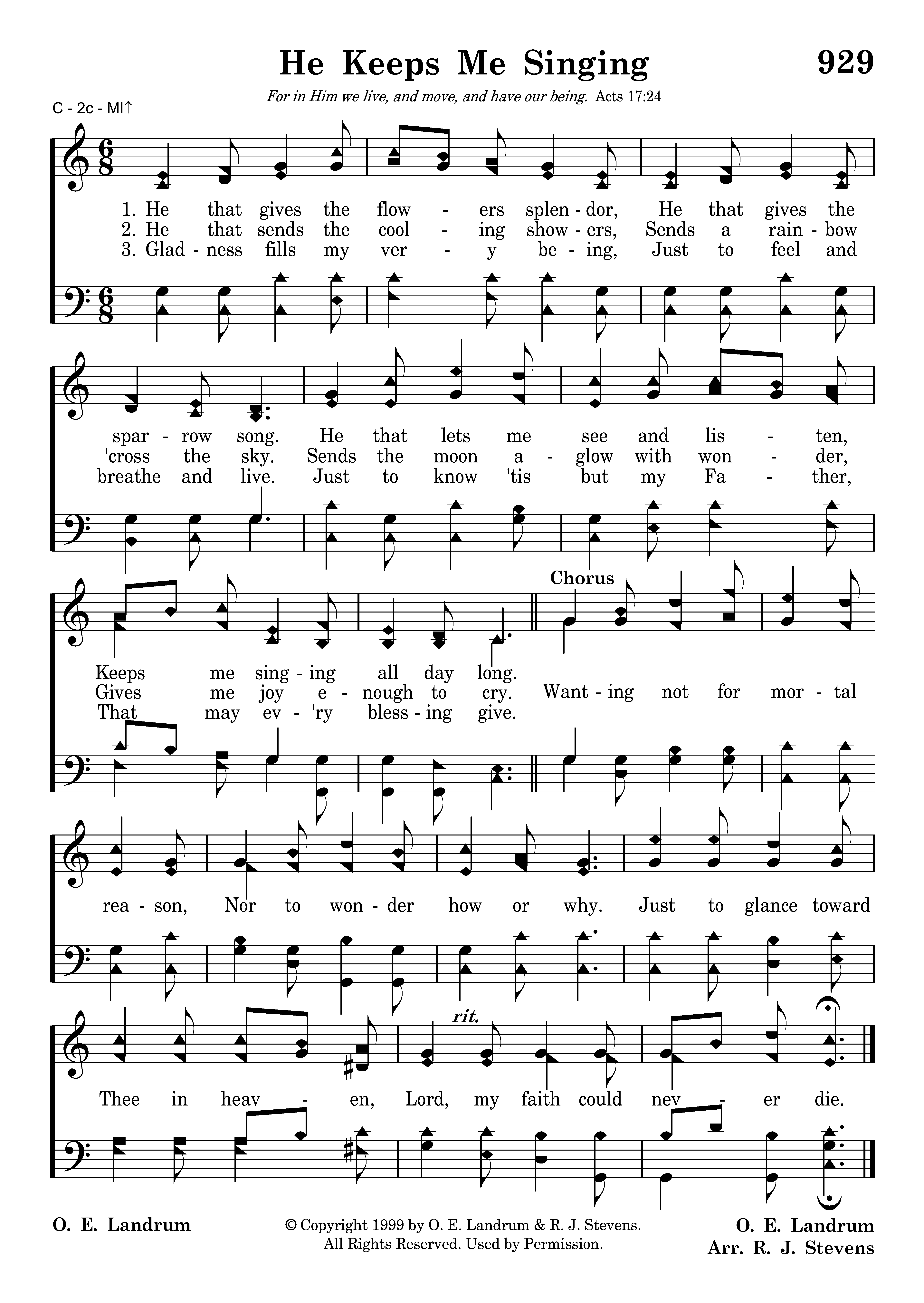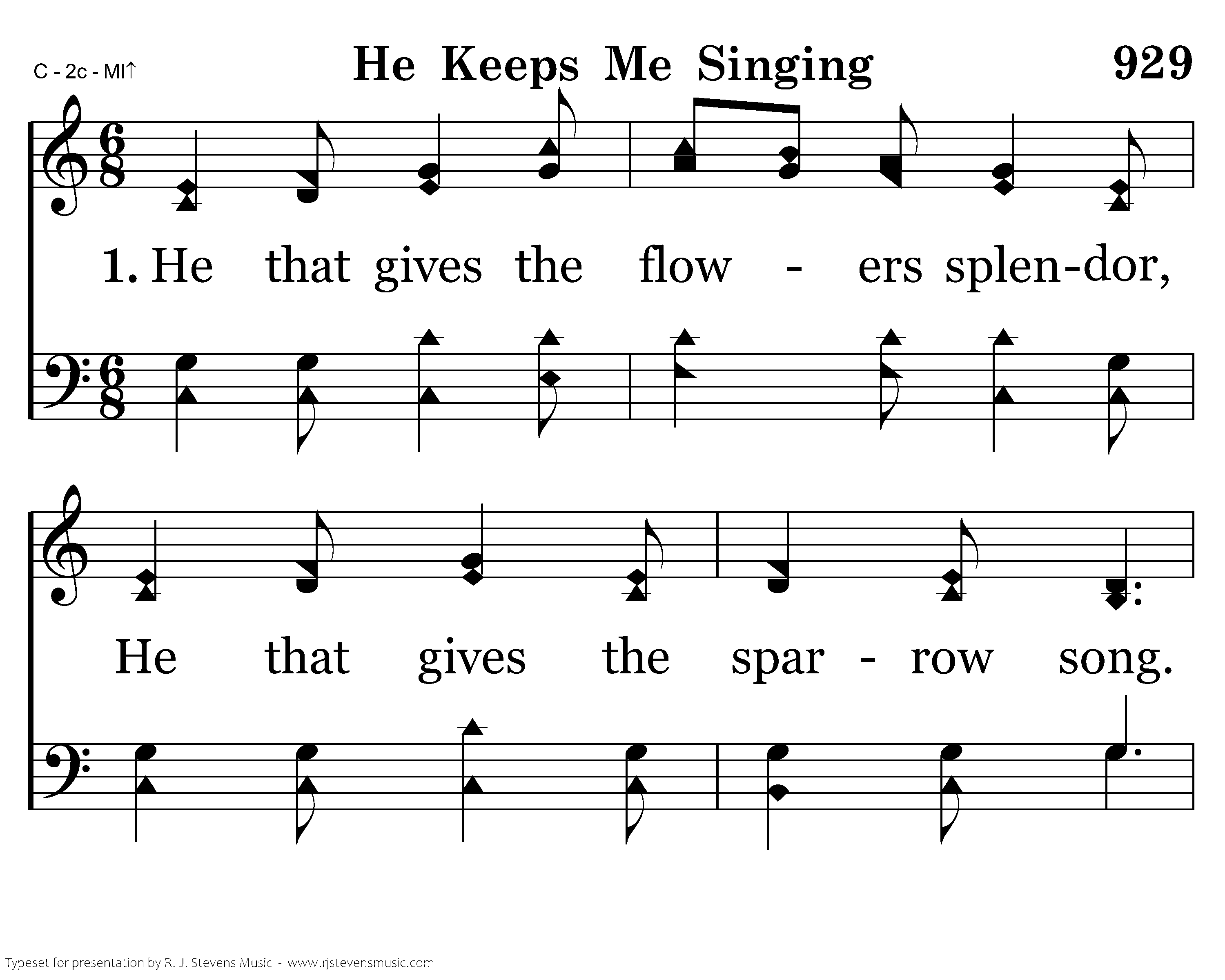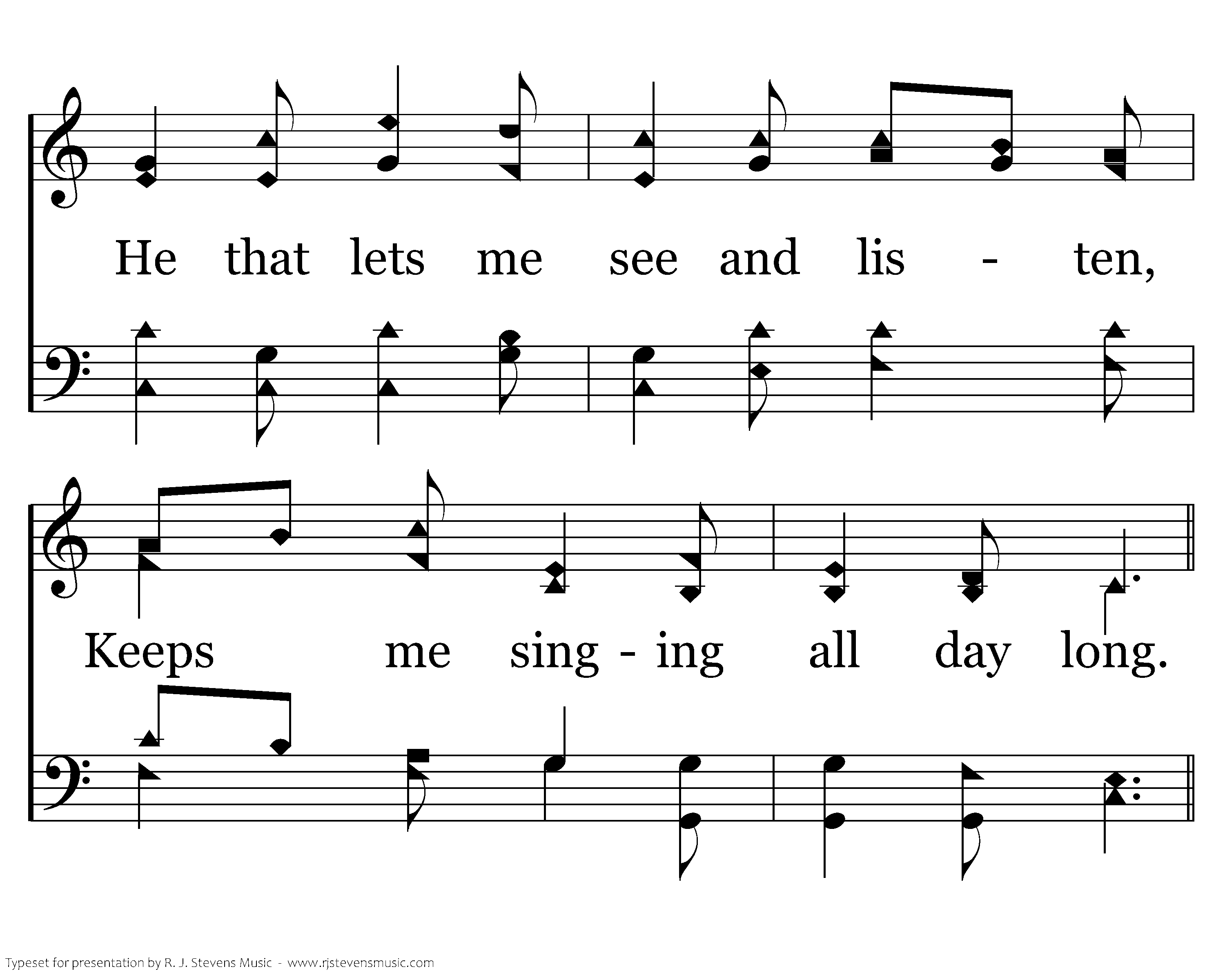 He that gives the flowers splendor, He that gives the sparrow song. He that lets me see and listen, Keeps me singing all day long.