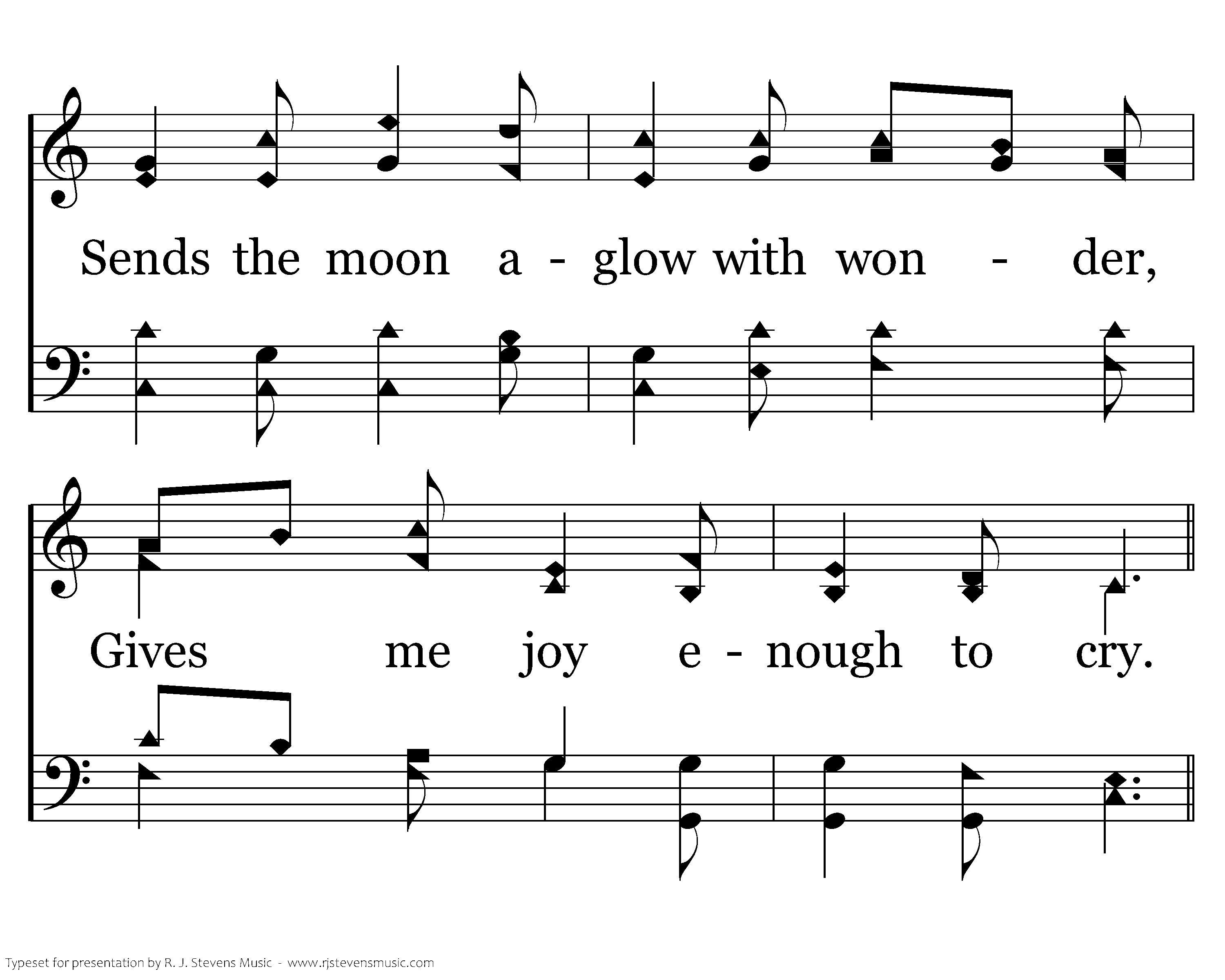 He that sends the cooling showers, Sends a rainbow 'cross the sky. Sends the moon aglow with wonder, Gives me joy enough to cry.