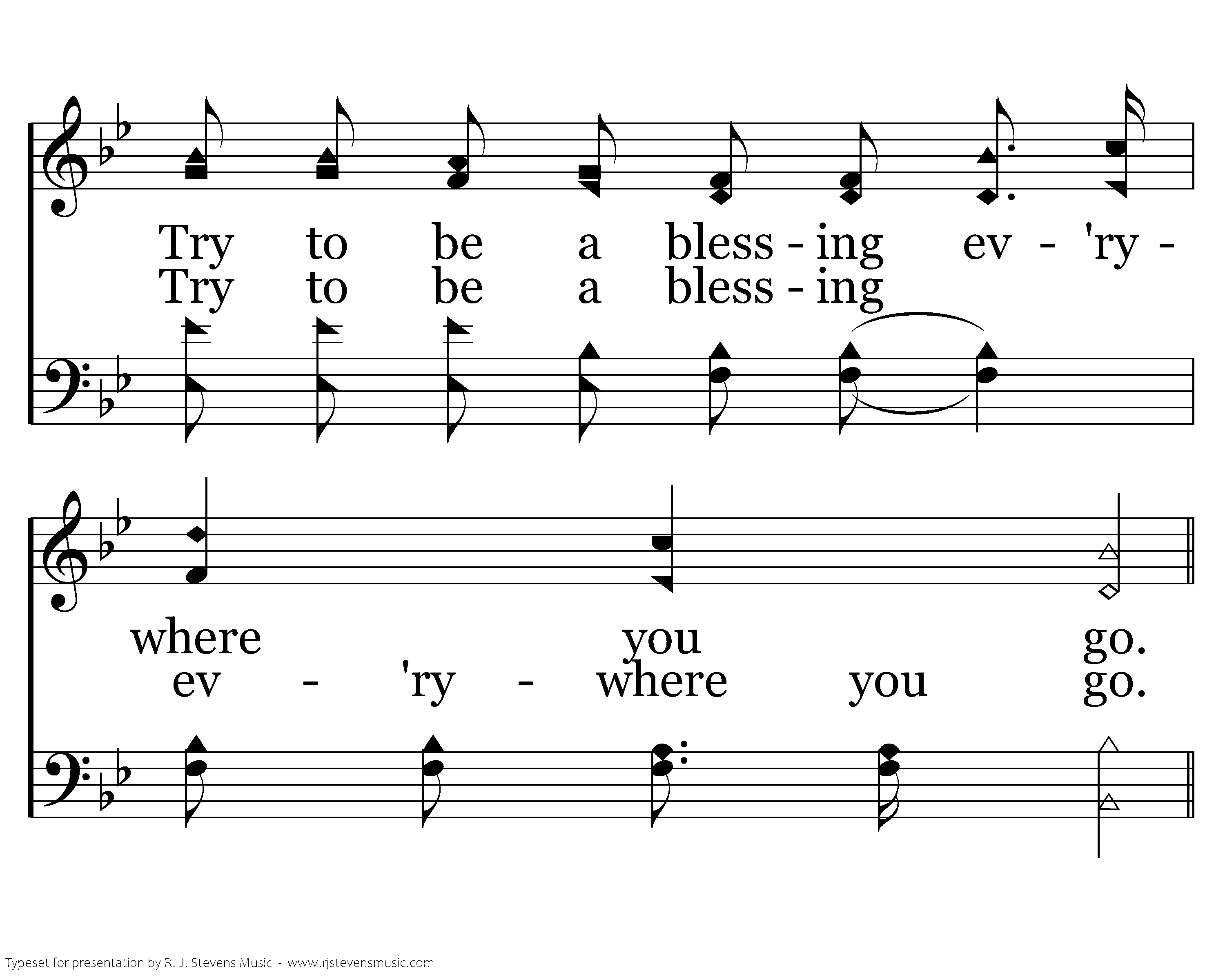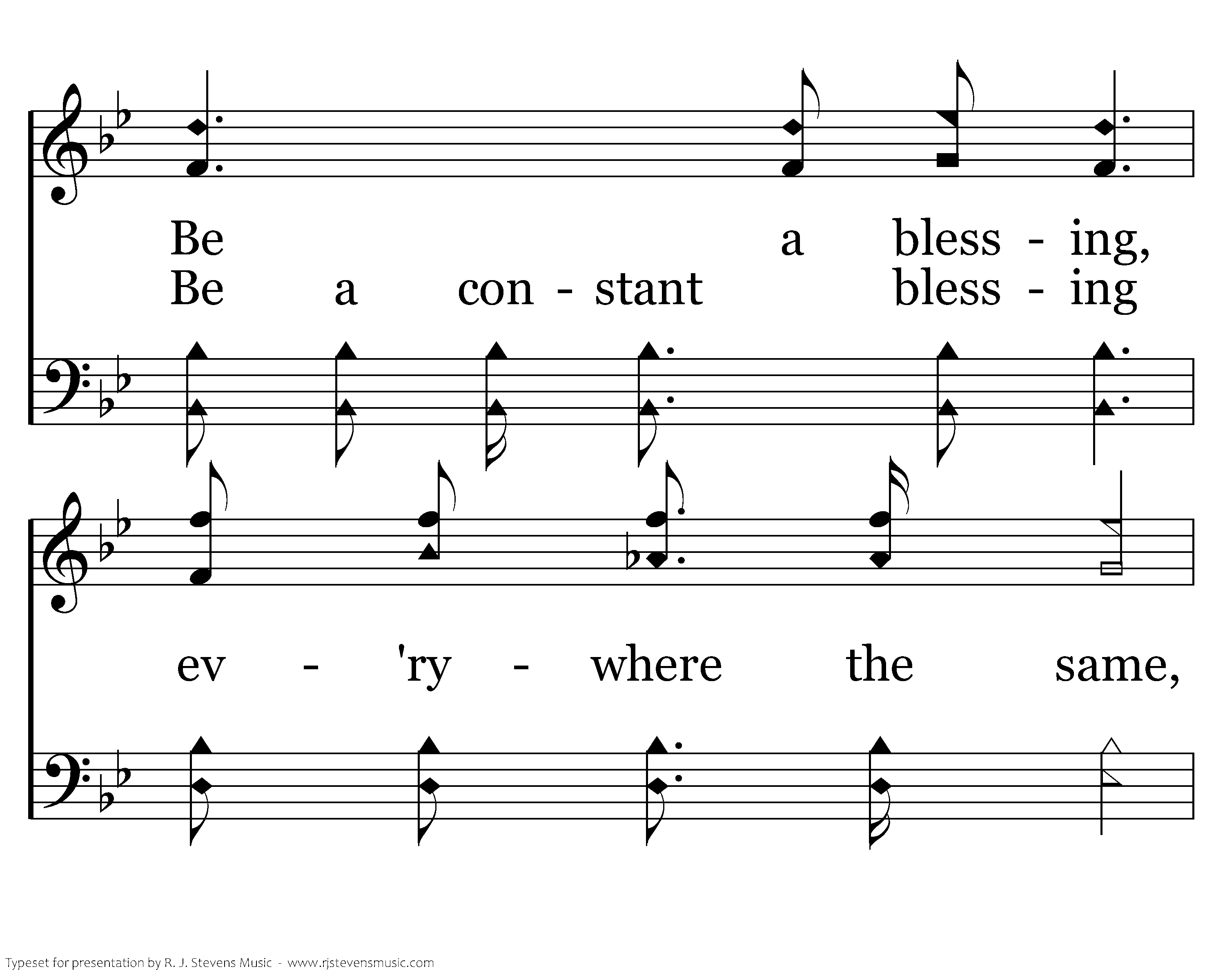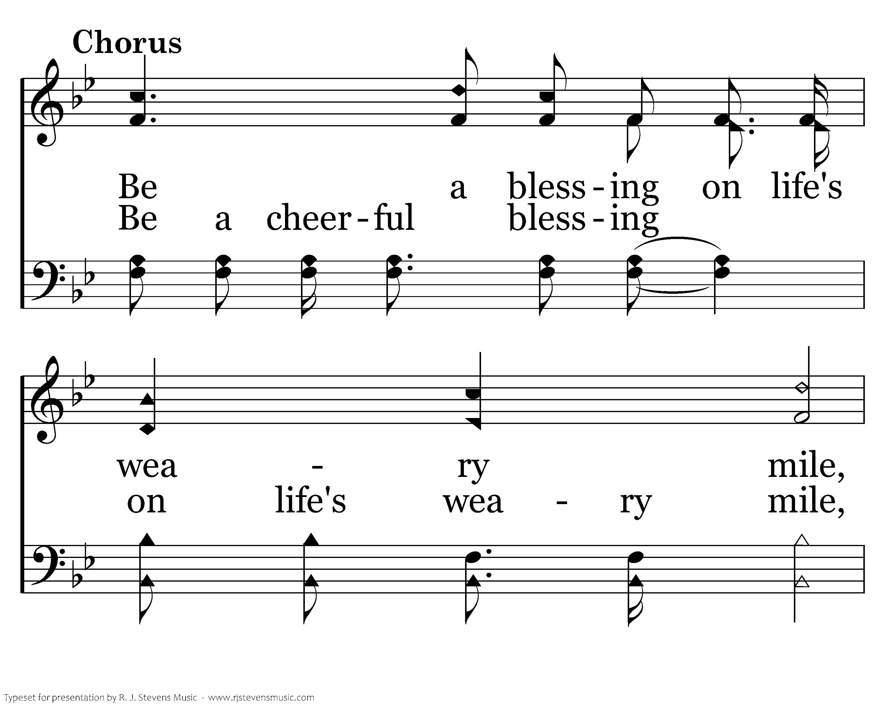 Be a blessing on life's weary mile, Be a blessing with a word or smile, Be a blessing, ev'rywhere the same, Try to be a blessing in the Master's Name. Be a cheerful blessing Be a sunny blessing