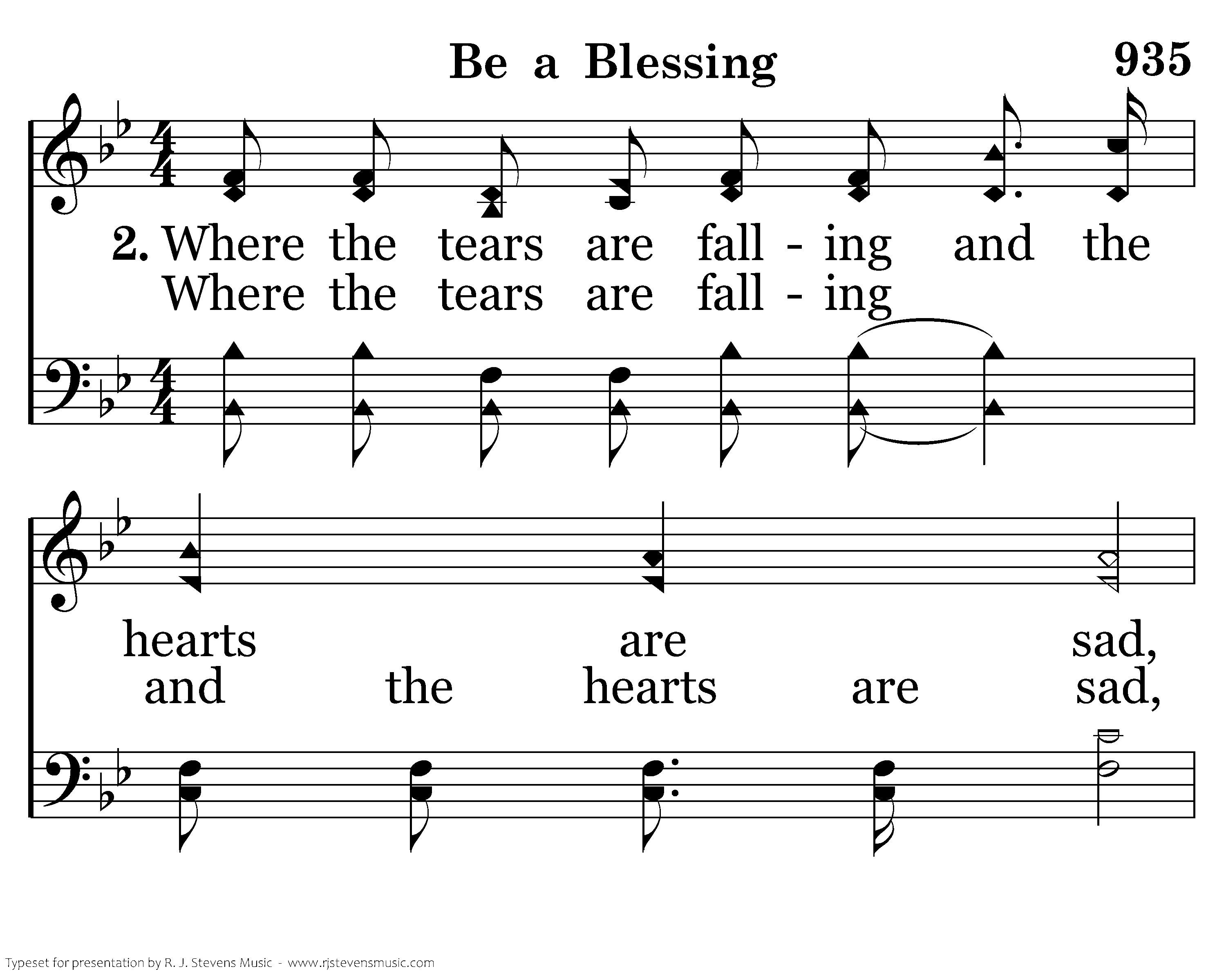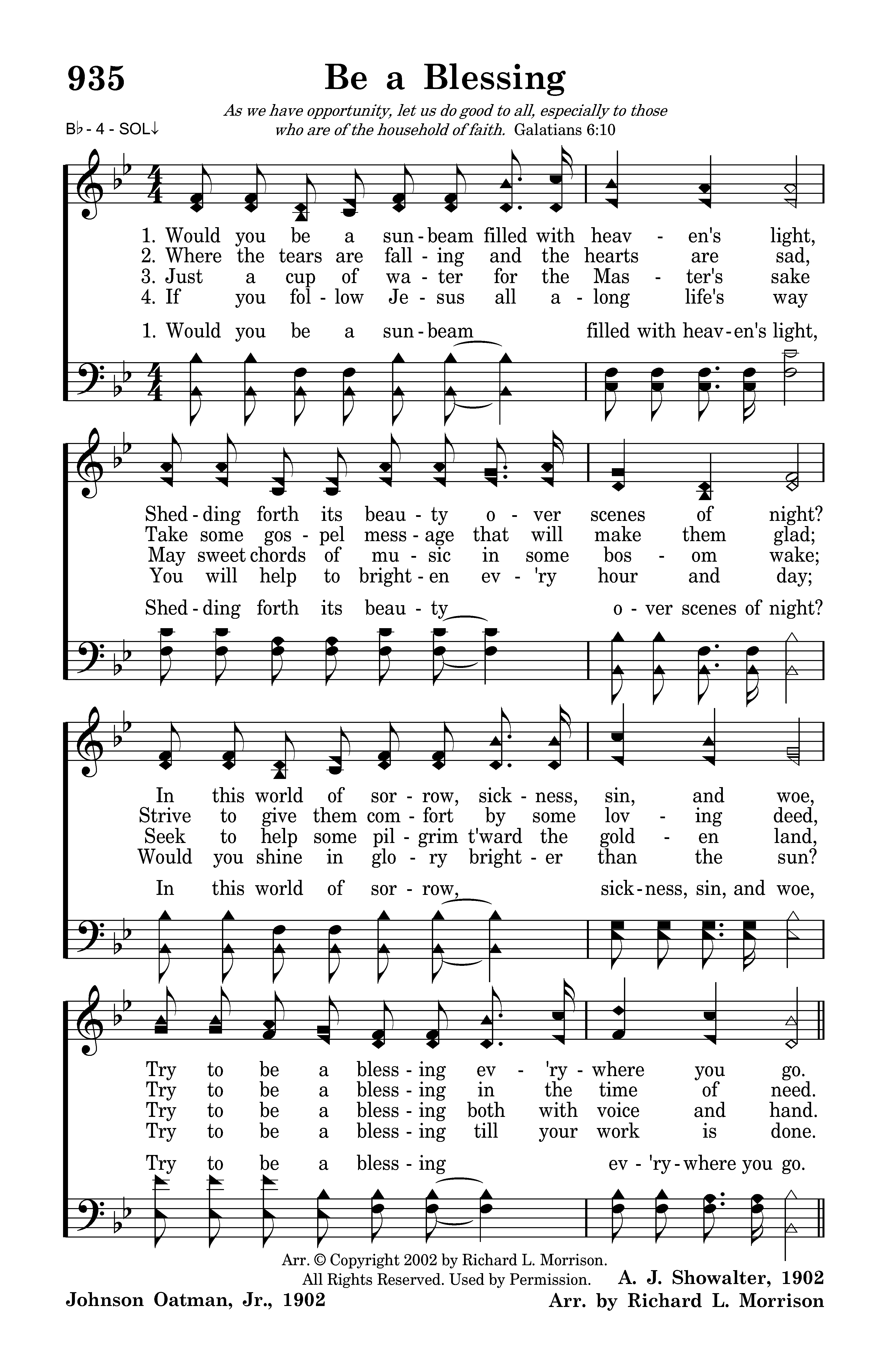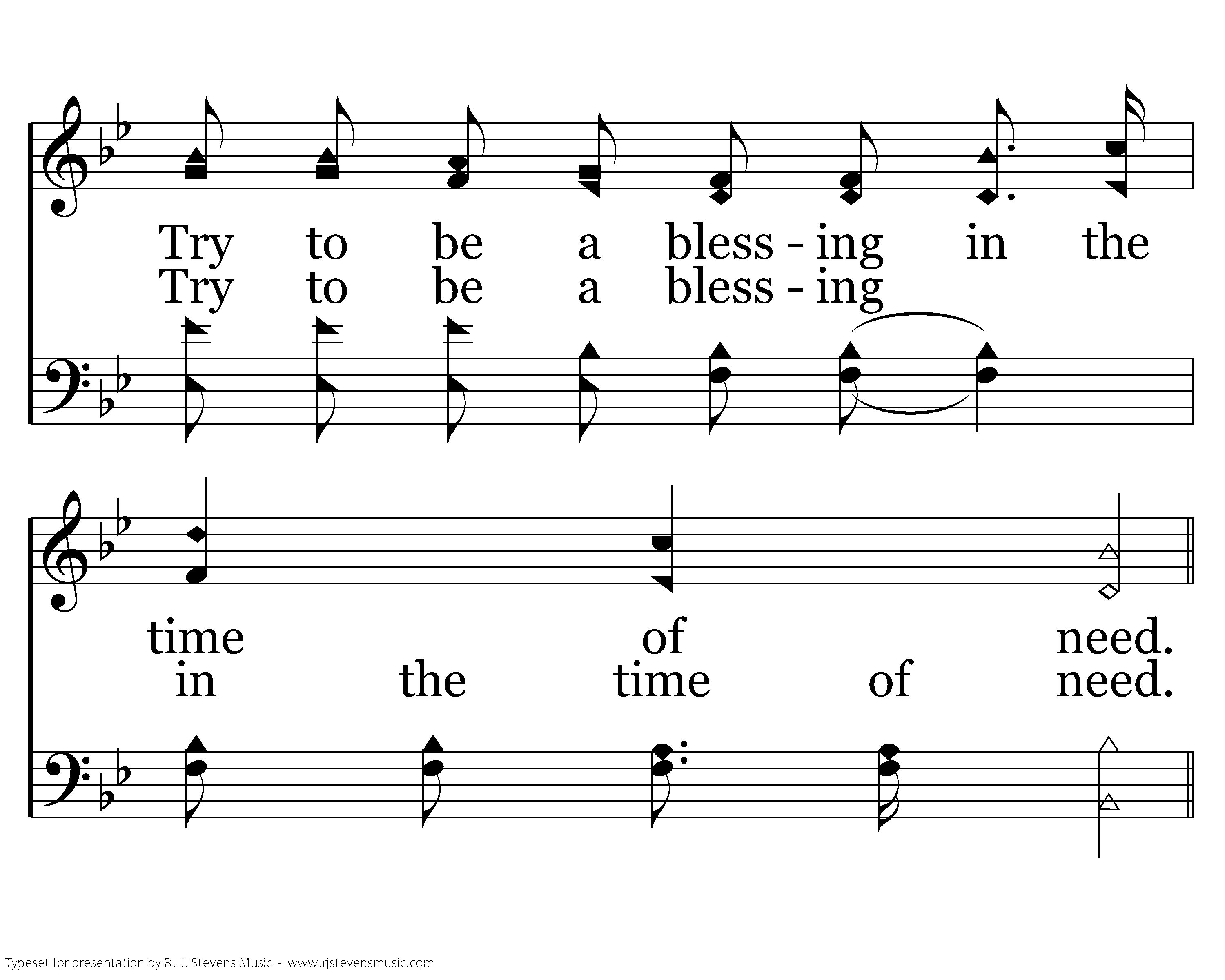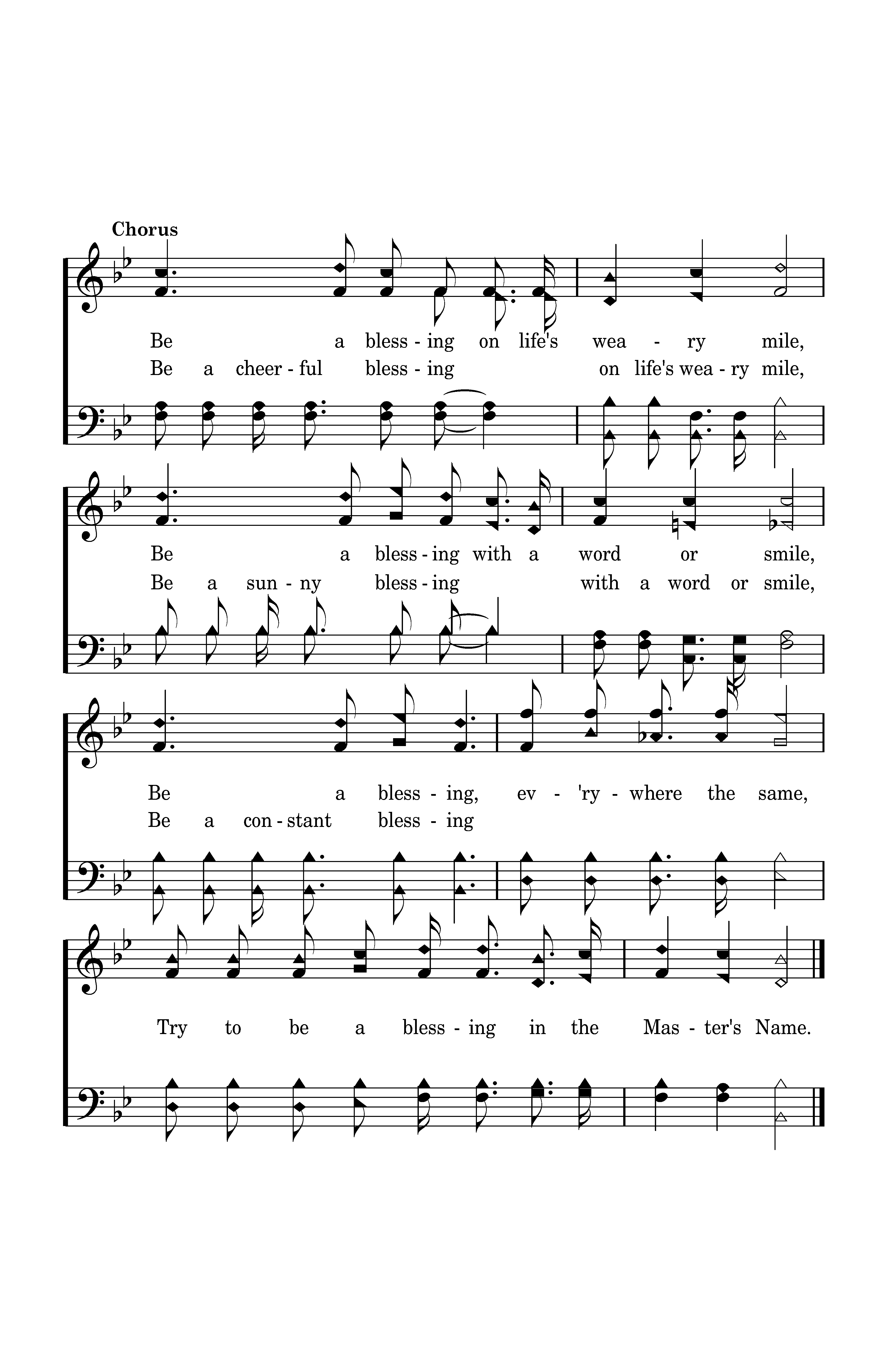 Be a blessing on life's weary mile, Be a blessing with a word or smile, Be a blessing, ev'rywhere the same, Try to be a blessing in the Master's Name. Be a cheerful blessing Be a sunny blessing