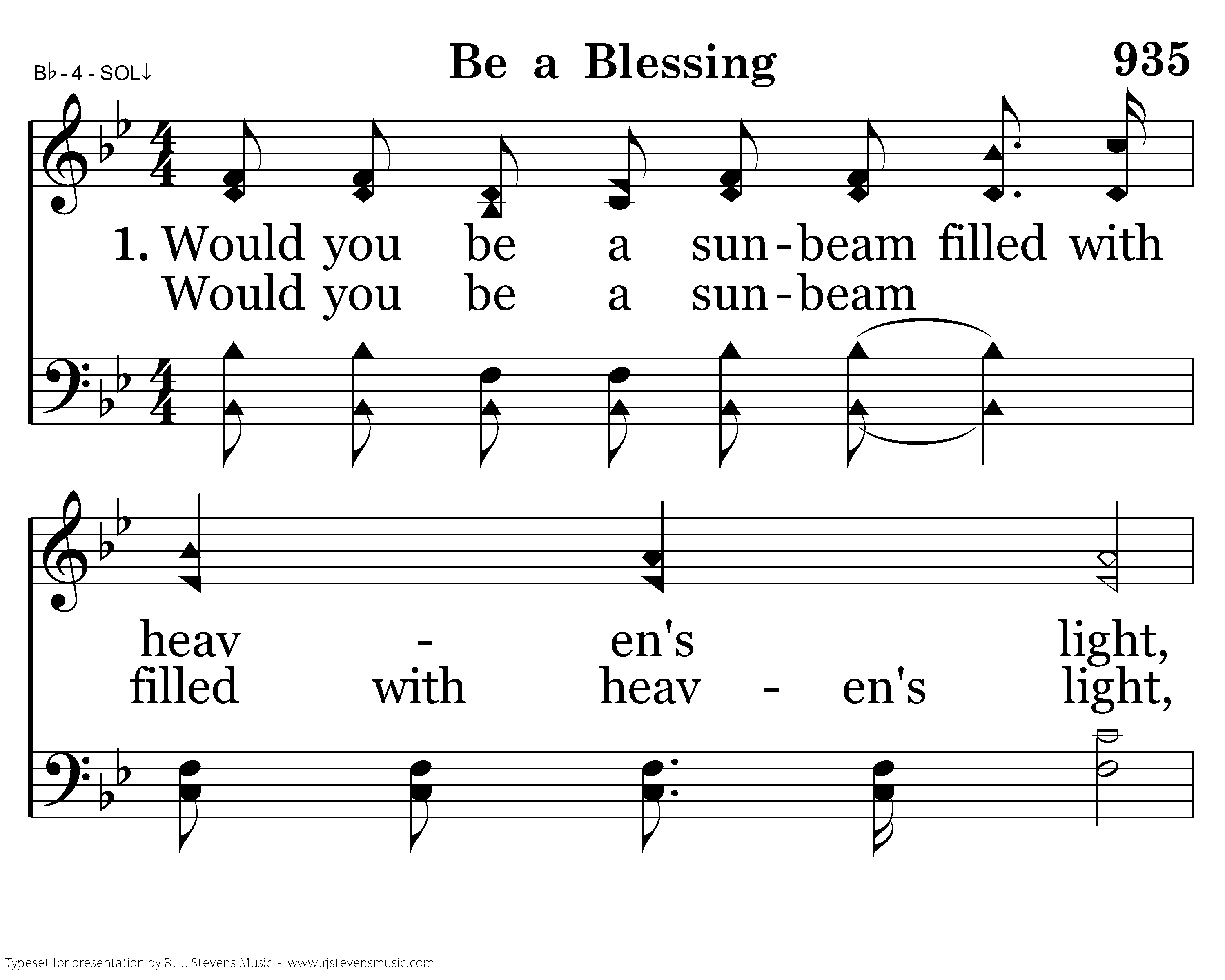 Would you be a sunbeam filled with heaven's light, Shedding forth its beauty over scenes of night? In this world of sorrow, sickness, sin, and woe, Try to be a blessing ev'rywhere you go.