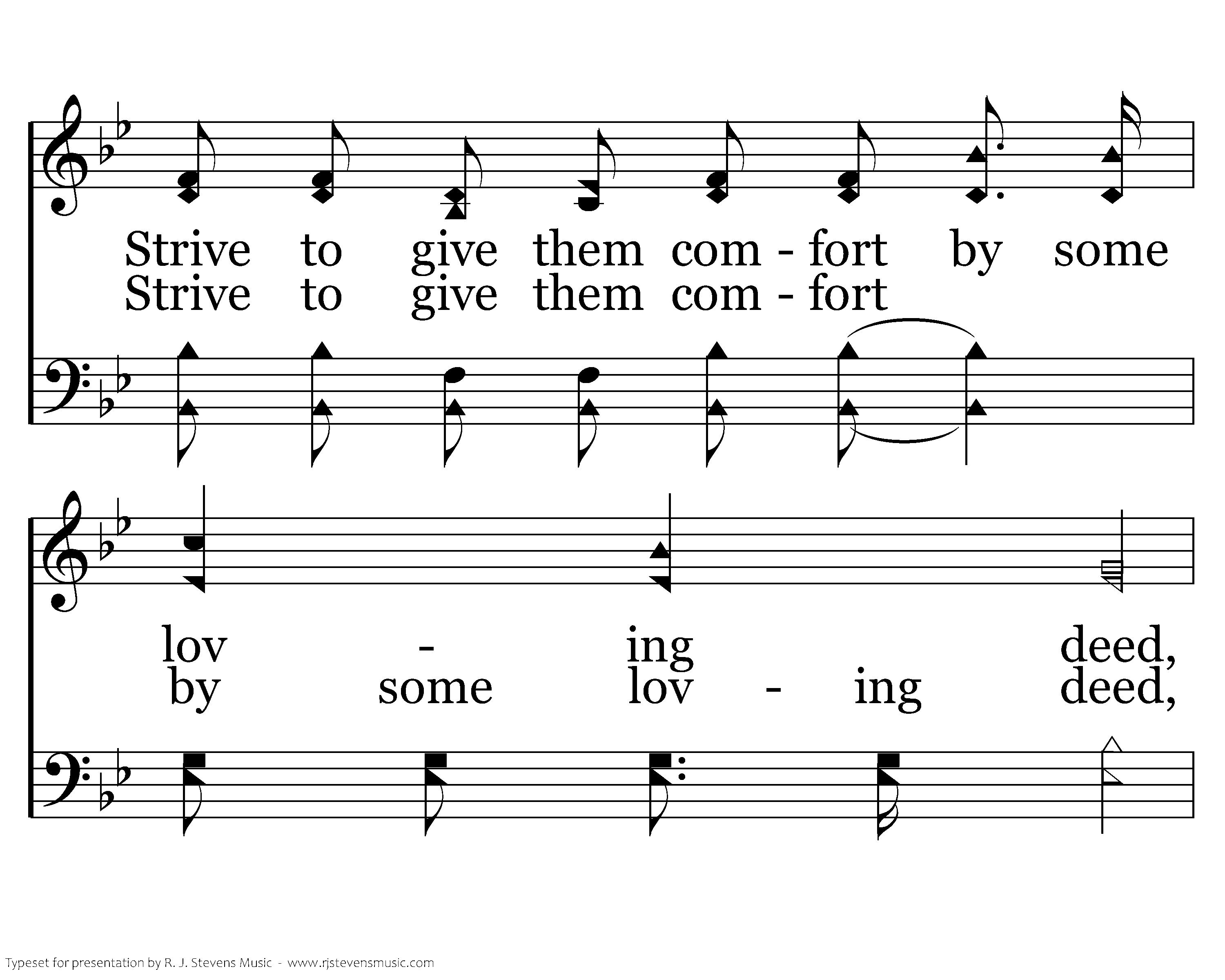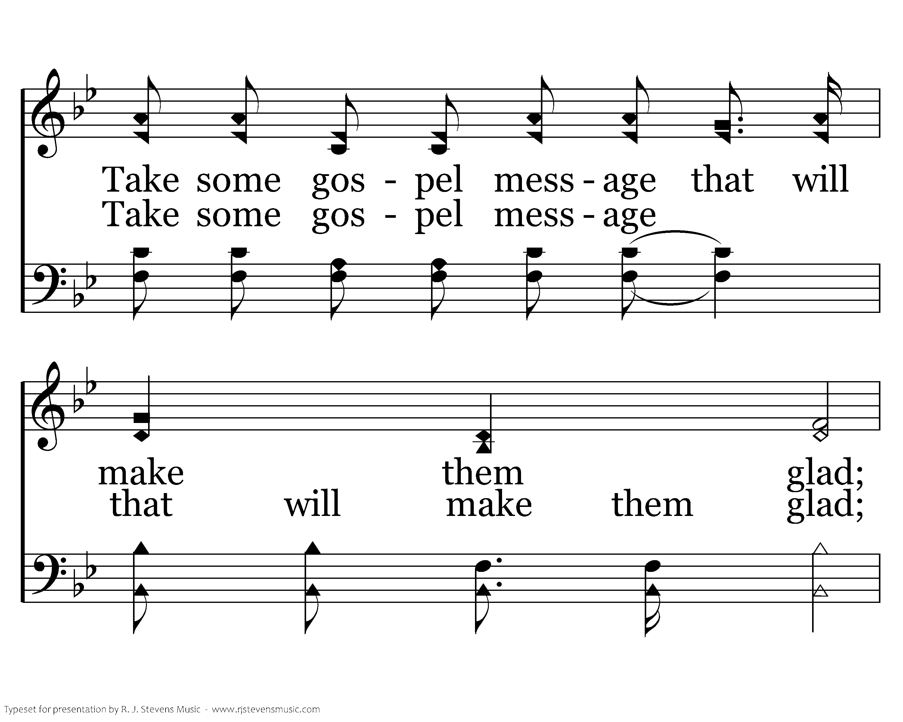 Where the tears are falling and the hearts are sad, Take some gospel message that will make them glad; Strive to give them comfort by some loving deed, Try to be a blessing in the time of need.