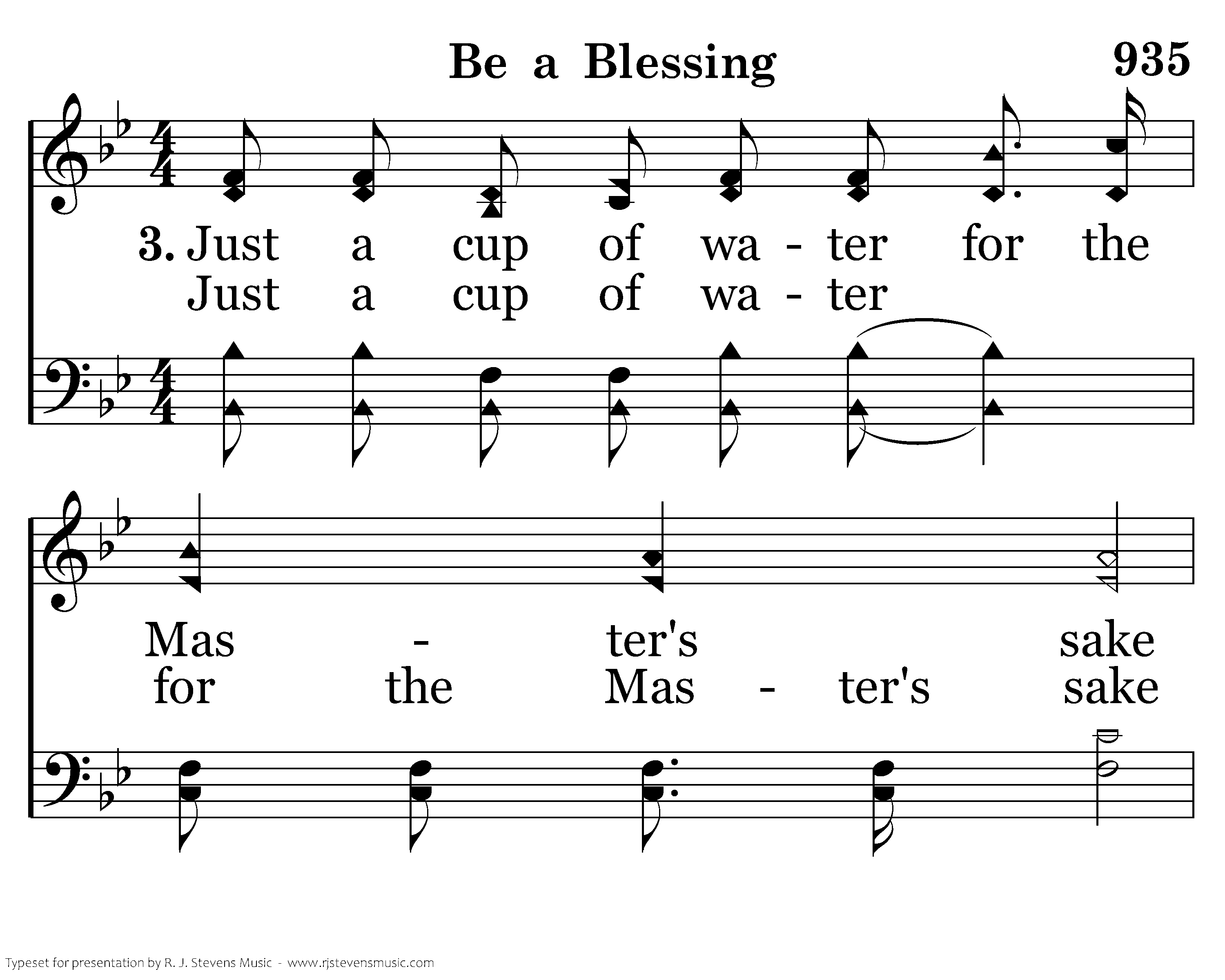 Just a cup of water for the Master's sake May sweet chords of music in some bosom wake; Seek to help some pilgrim t'ward the golden land, Try to be a blessing both with voice and hand.