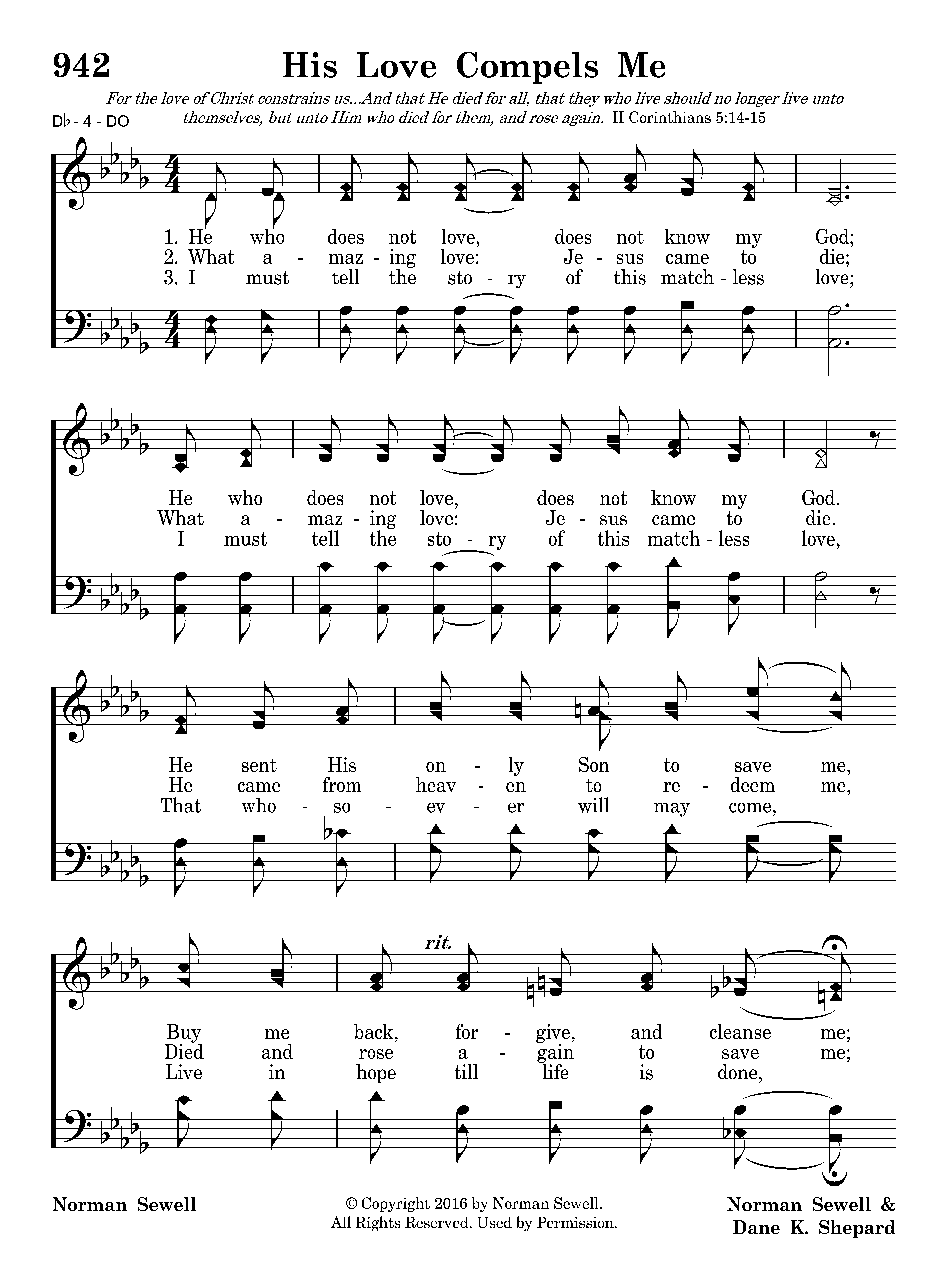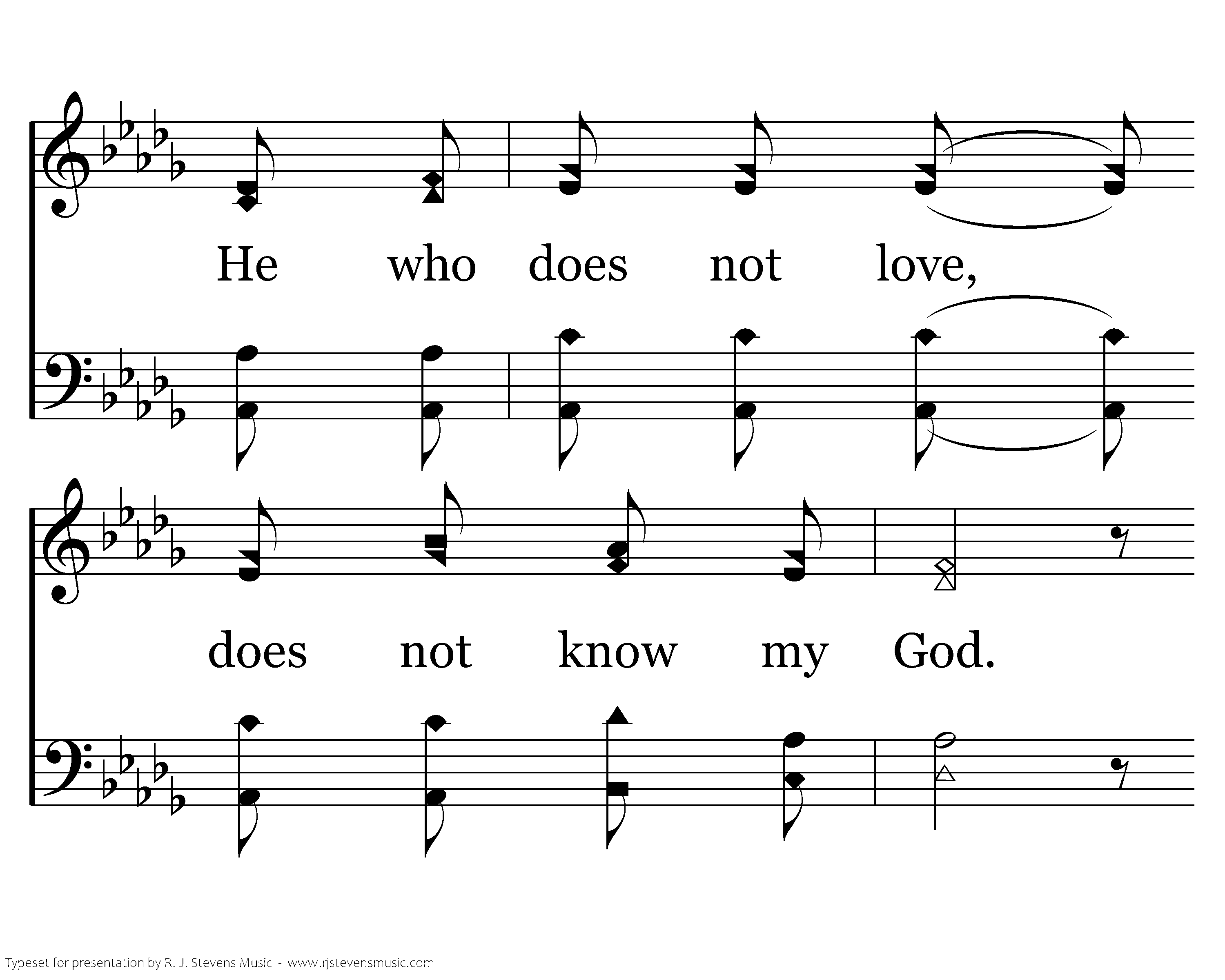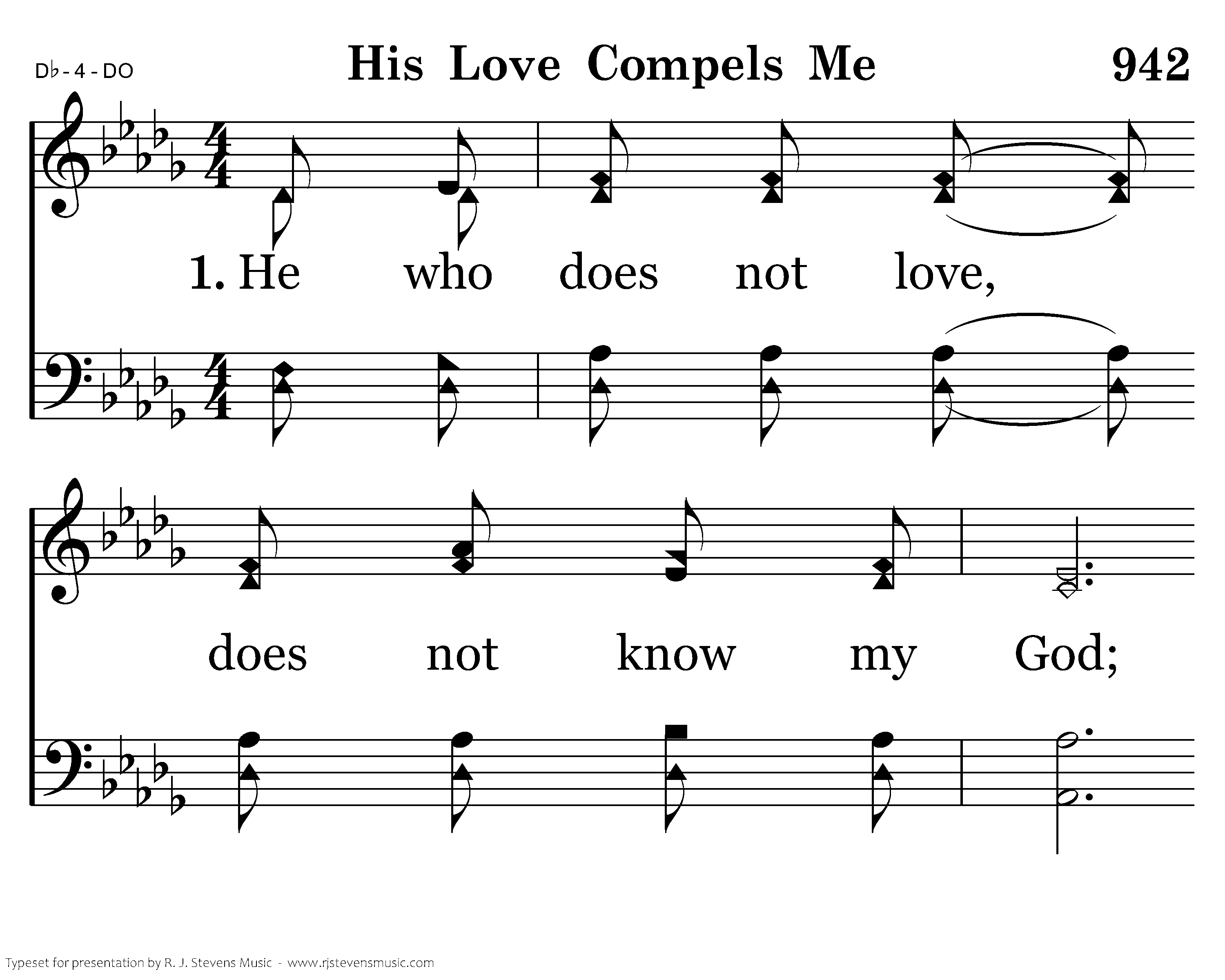 He who does not love, does not know my God; He who does not love, does not know my God. He sent His only Son to save me, Buy me back, forgive, and cleanse me; Calls me now to live for Him so faithfully! O by His love He compels me, Thru amazing love compels me; I must live for Him who died and rose for me.