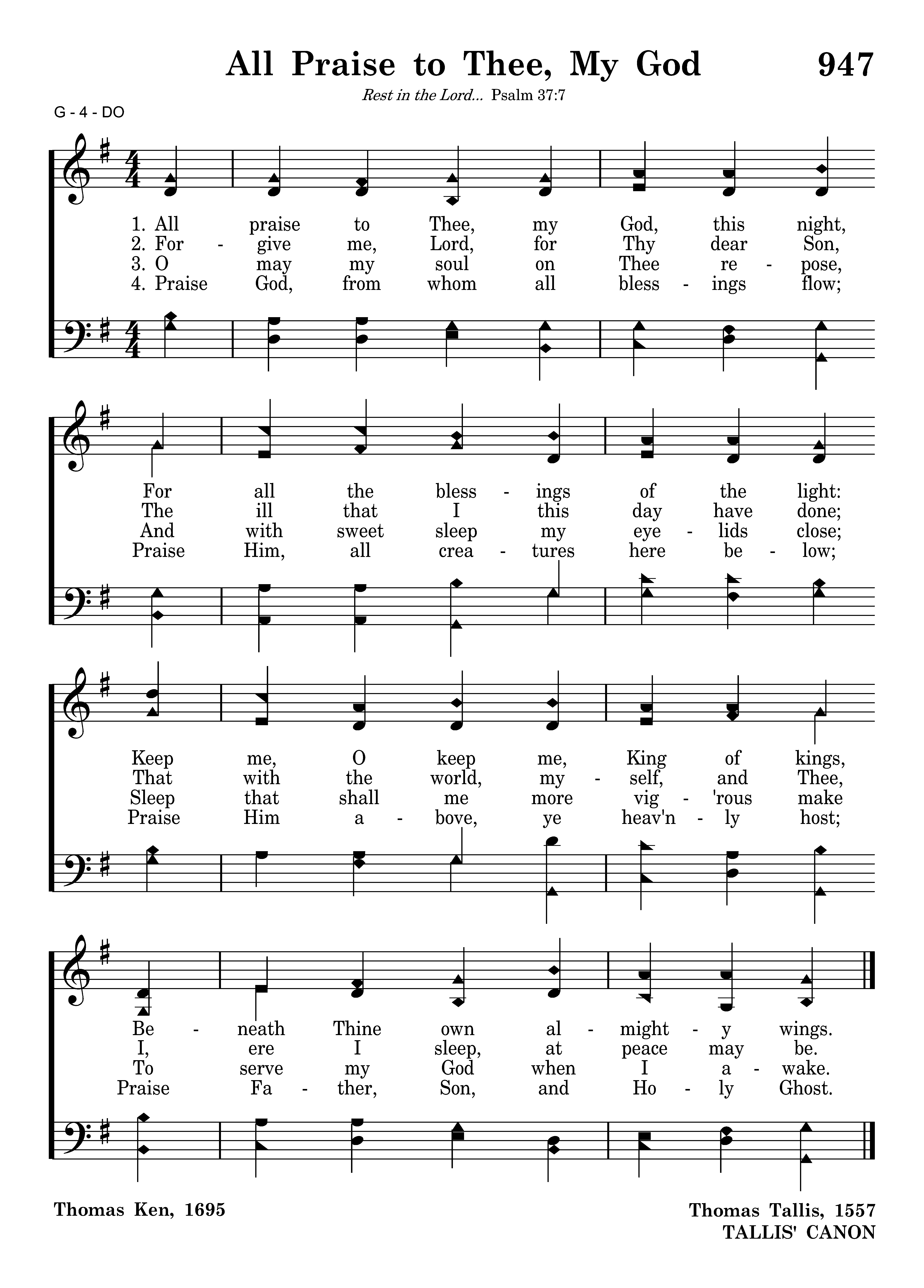 All praise to Thee, my God, this night, For all the blessings of the light: Keep me, O keep me, King of kings, Beneath Thine own almighty wings.