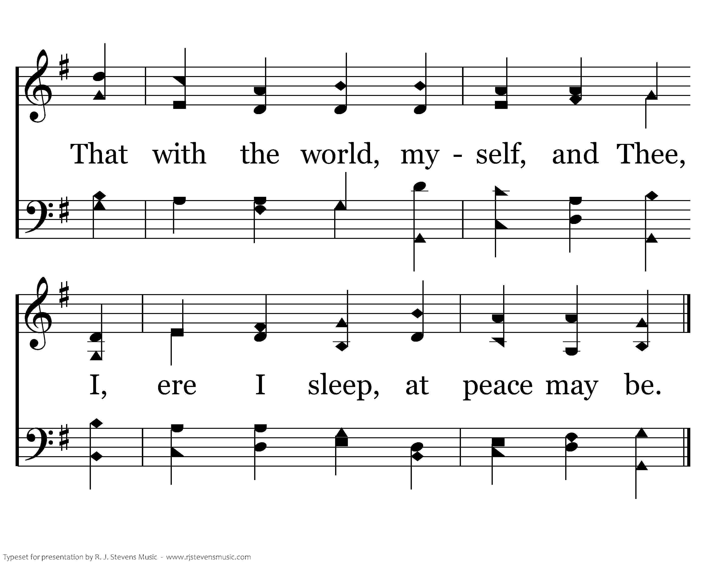 Forgive me, Lord, for Thy dear Son, The ill that I this day have done; That with the world, myself, and Thee, I, ere I sleep, at peace may be.