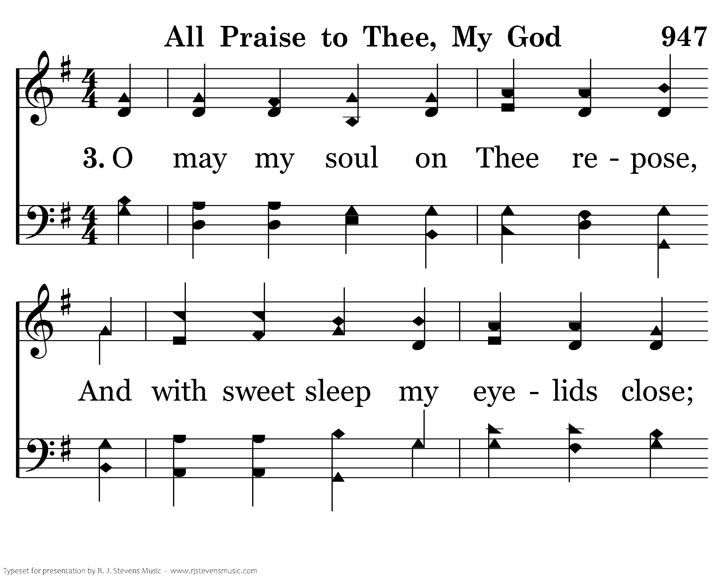 O may my soul on Thee repose, And with sweet sleep my eyelids close; Sleep that shall me more vig'rous make To serve my God when I awake.