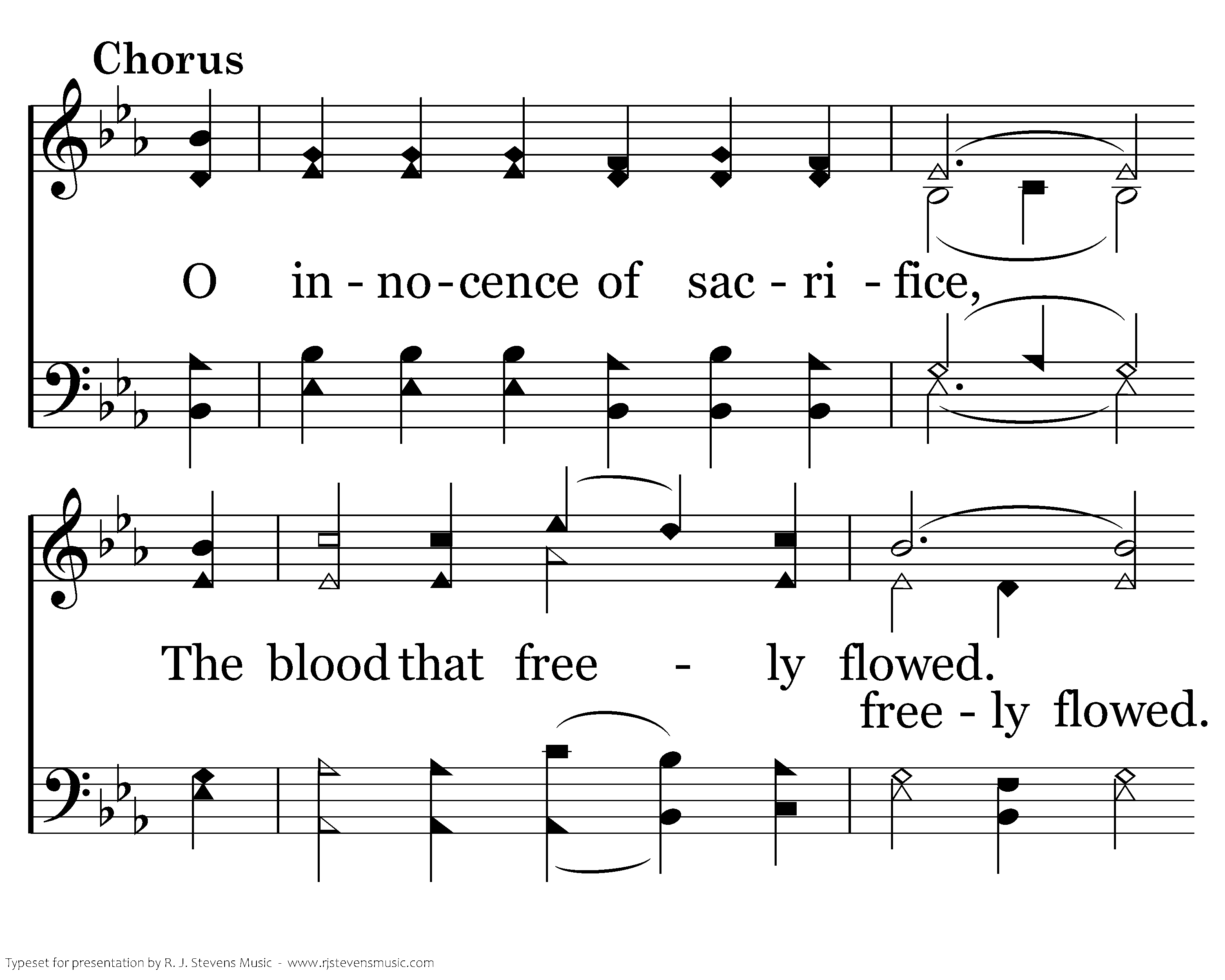 O innocence of sacrifice, The blood that freely flowed. O Lamb Who took my sin away; O blood that makes me whole.