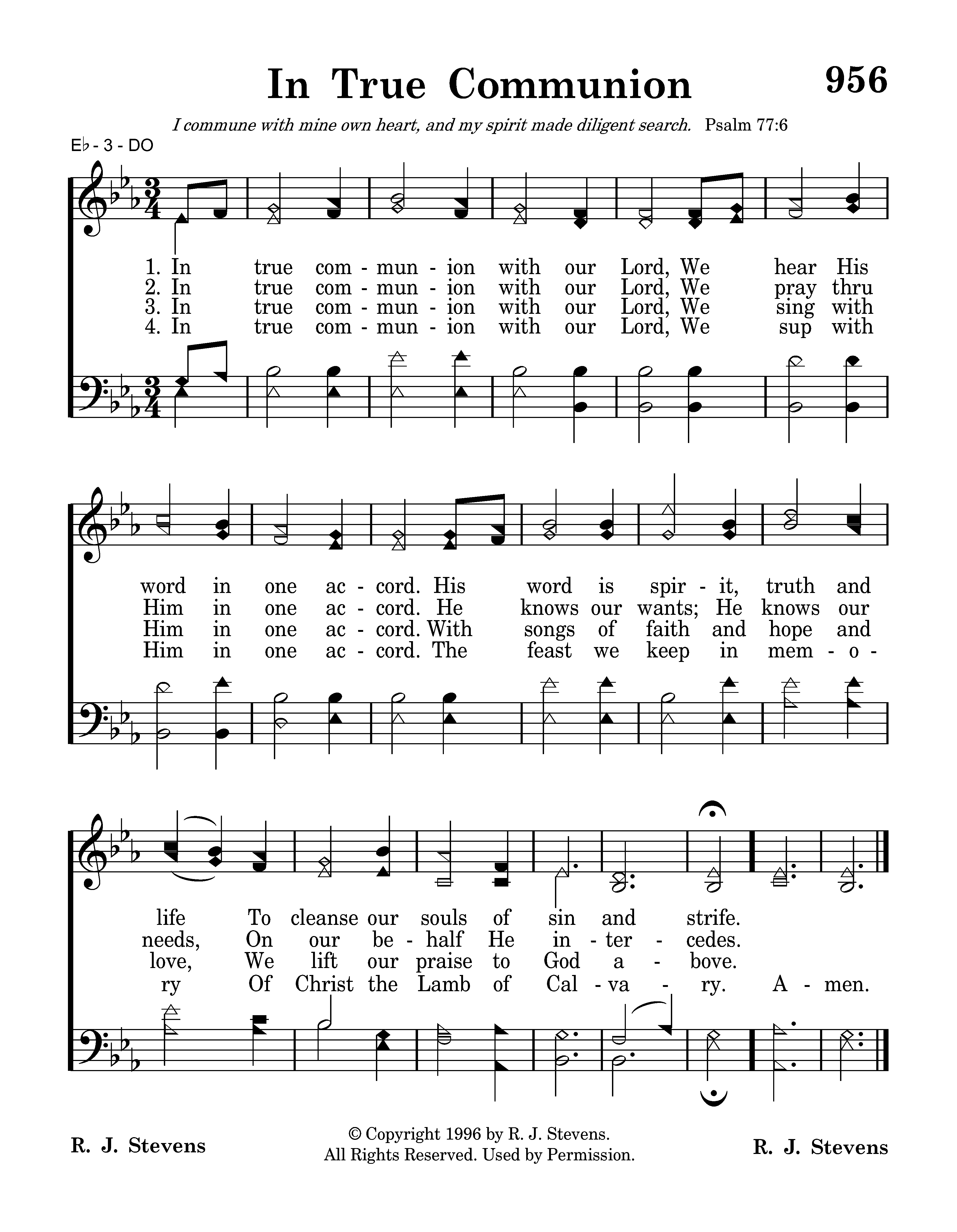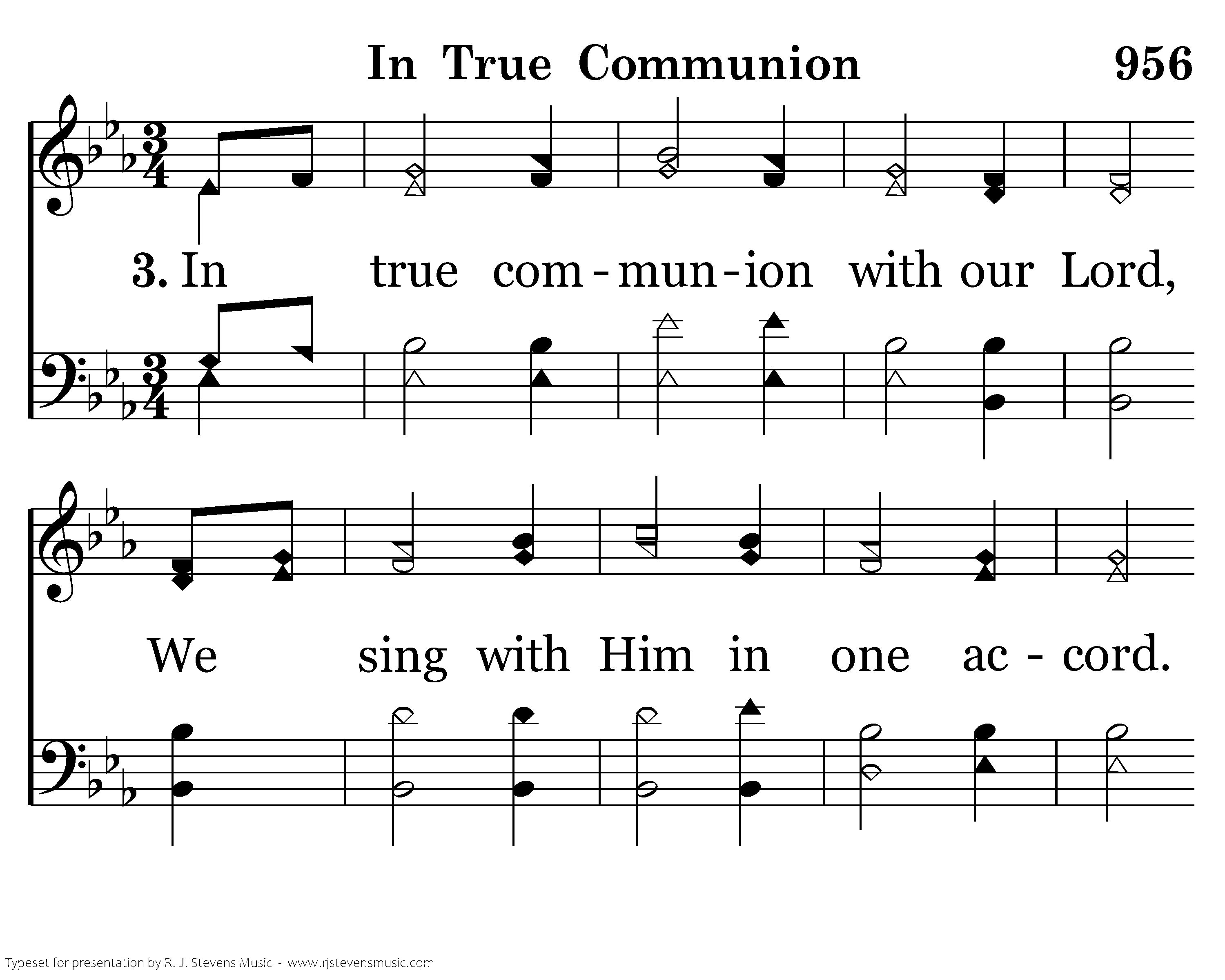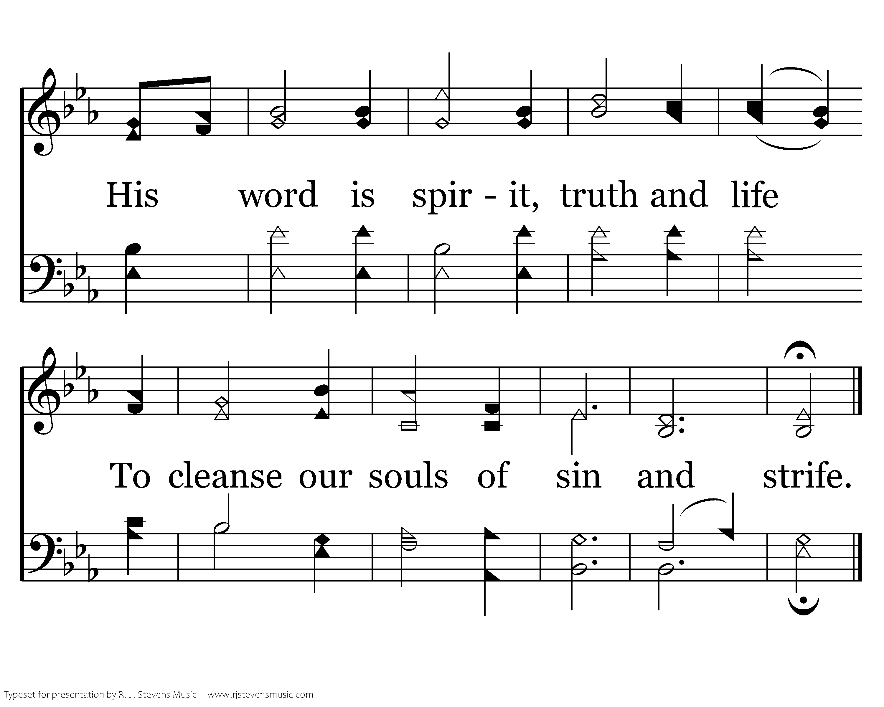 In true communion with our Lord, We hear His word in one accord. His word is spirit, truth and life To cleanse our souls of of sin and strife.