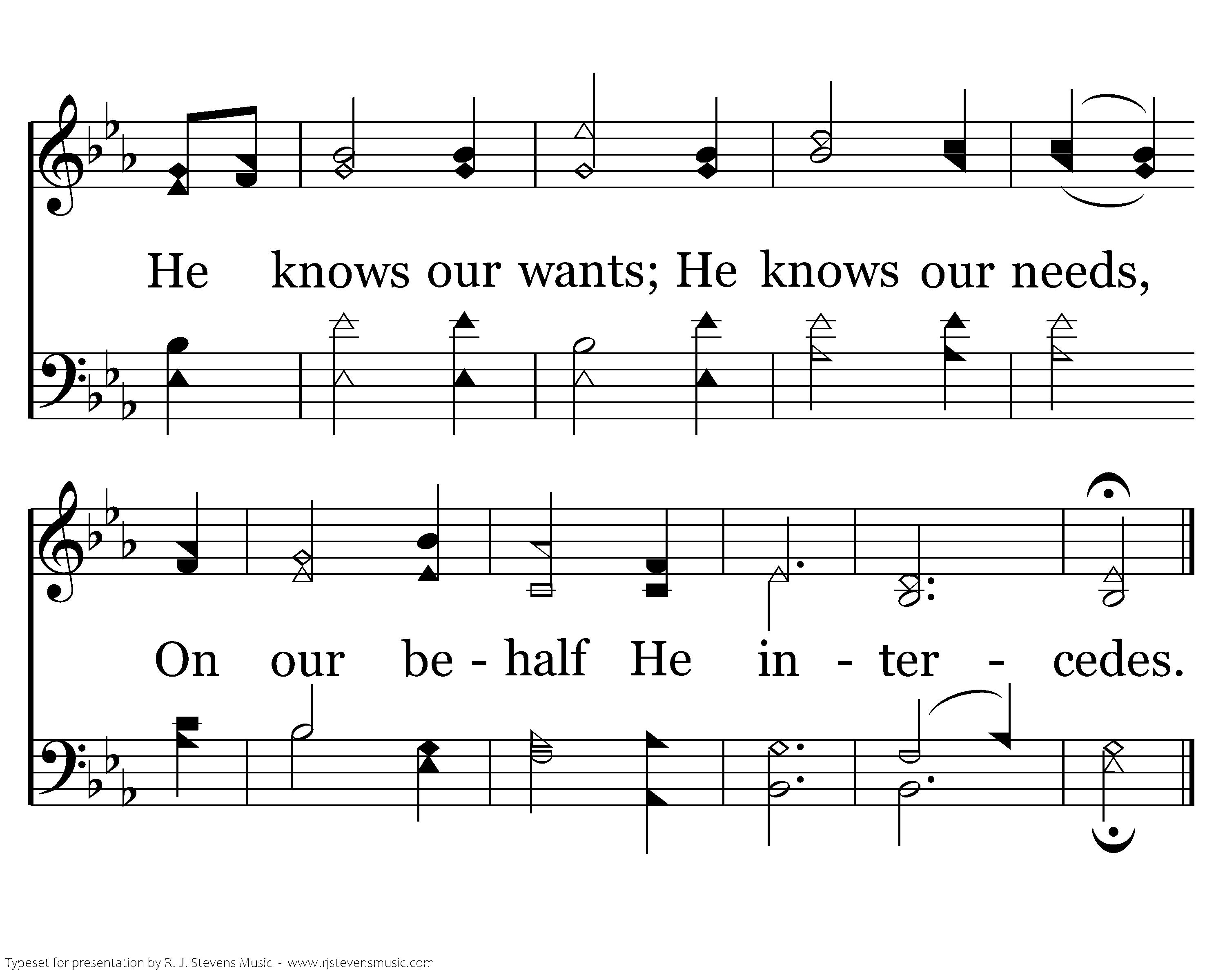 In true communion with our Lord, We pray thru Him in one accord. He knows our wants; He knows our needs, On our behalf He intercedes.