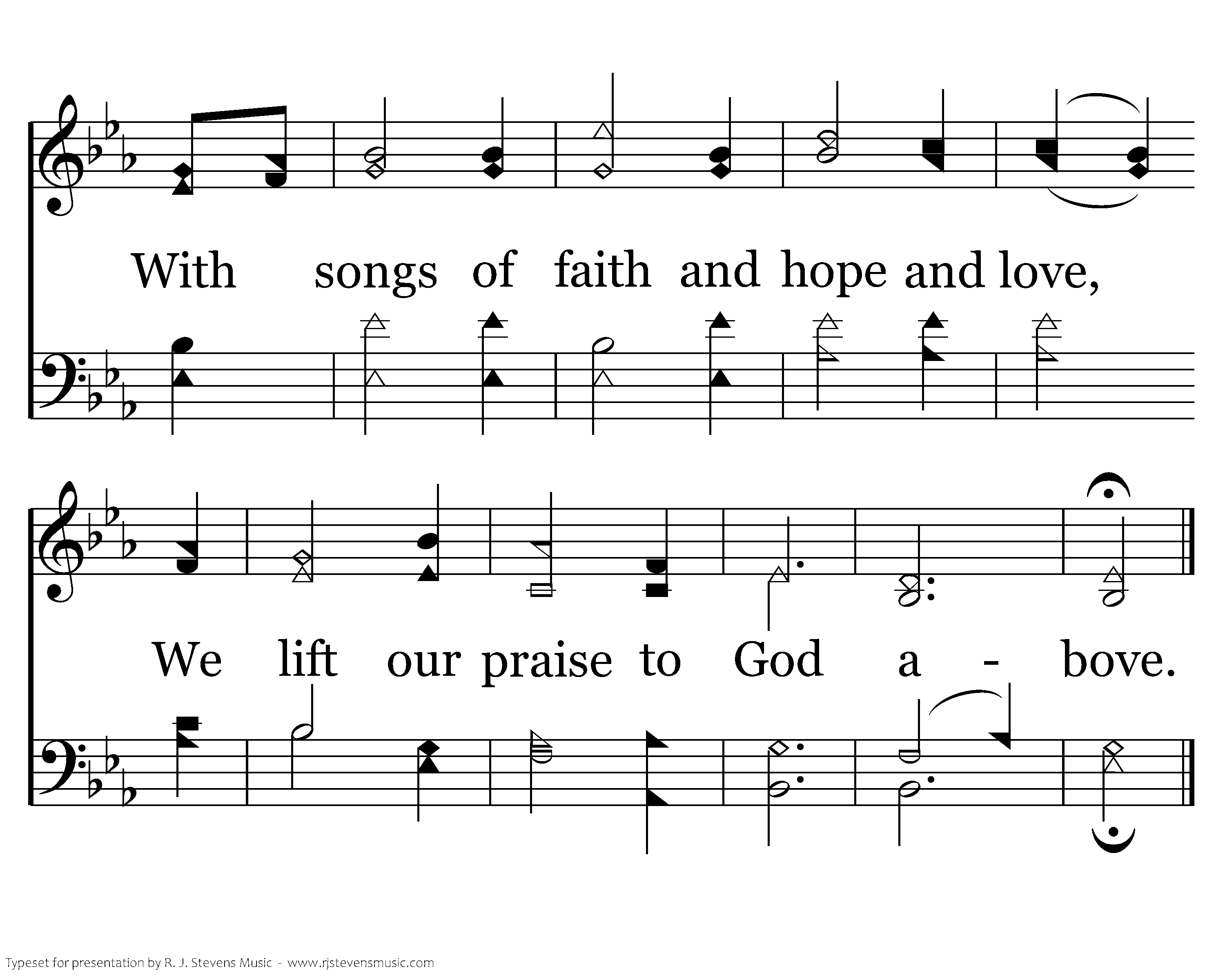 In true communion with our Lord, We sing with Him in one accord. With songs of faith and hope and love, We lift our praise to God above.