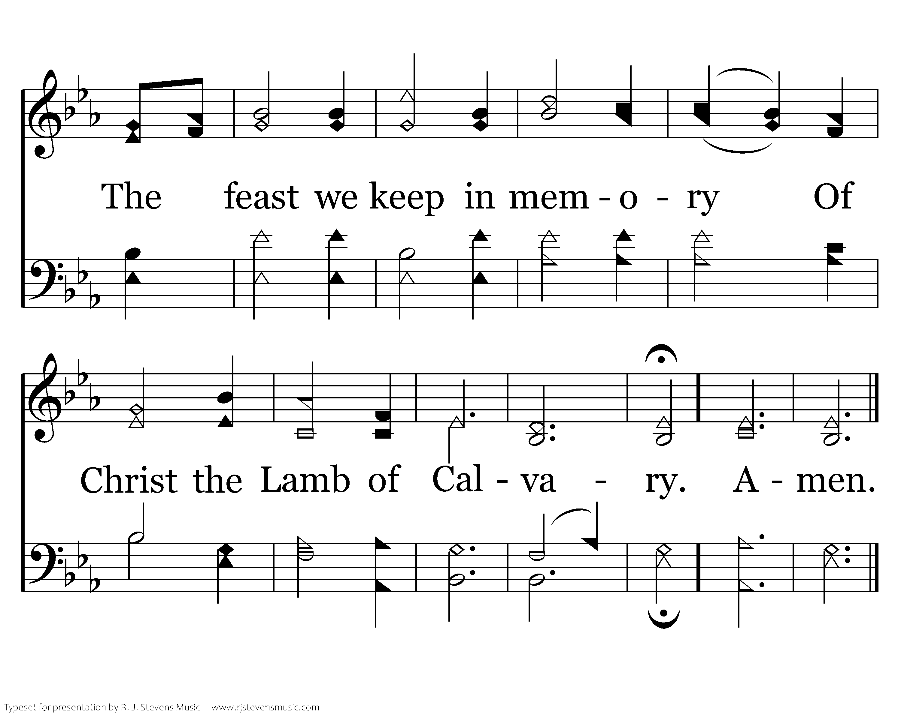 In true communion with our Lord, We sup with Him in one accord. The feast we keep in memory Of Christ the Lamb of Calvary. Amen.